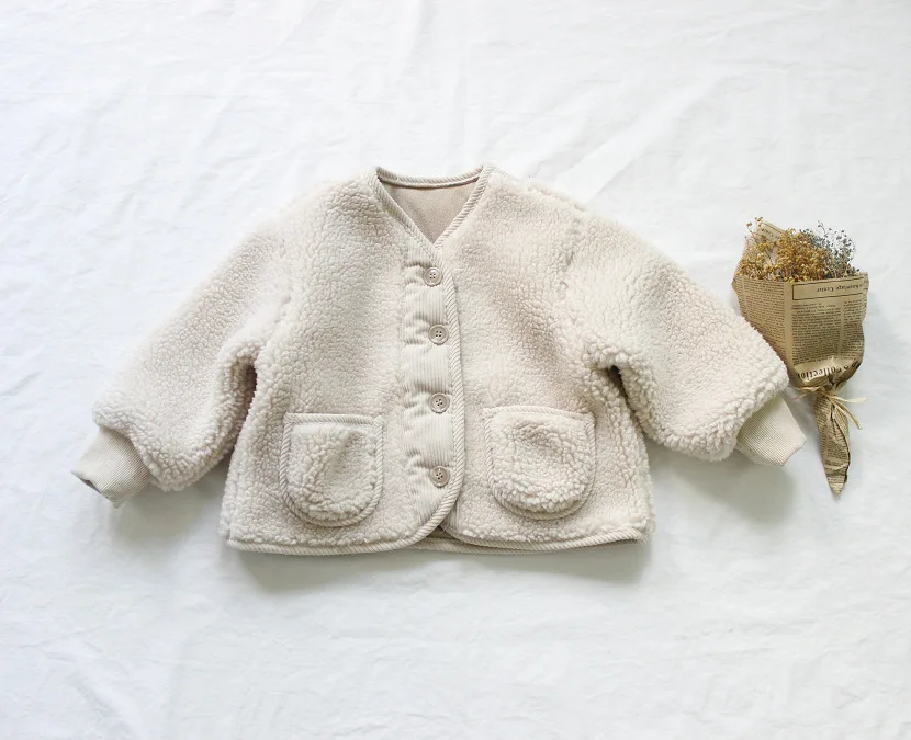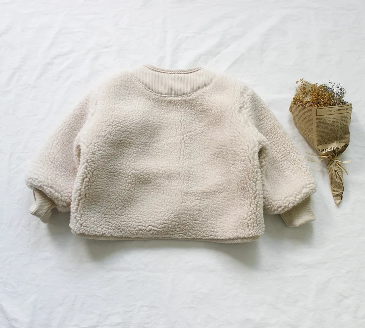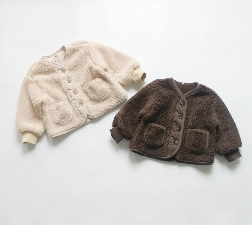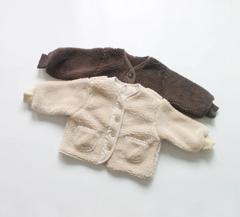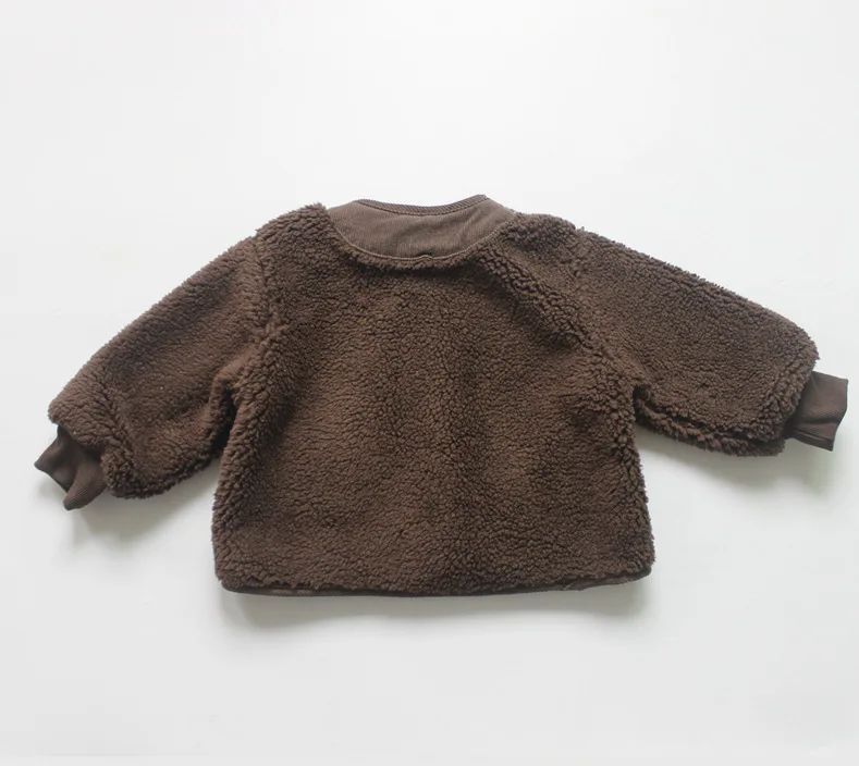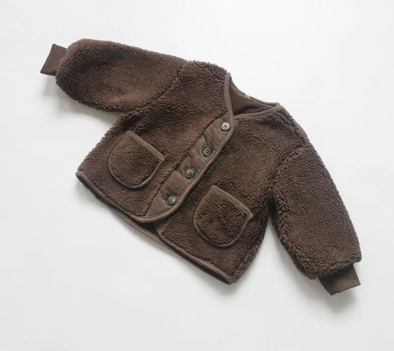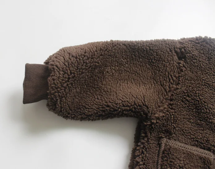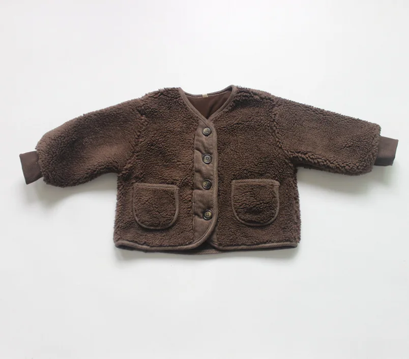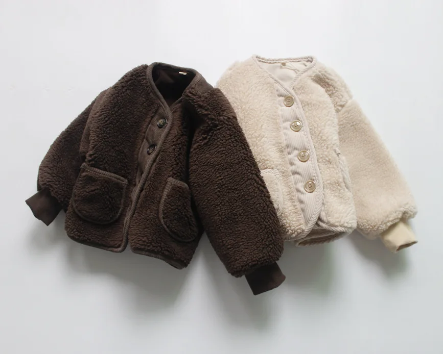 このキッズアウターは、韓国スタイルのフリースジャケットです。ベージュとブラウンの2カラーがあり、男の子も女の子も着用できるユニセックスデザインです。暖かくて、寒い季節にぴったりのアウターです。柔らかなベルベット裏地が特徴で、お子様が快適に過ごせること間違いなしです。