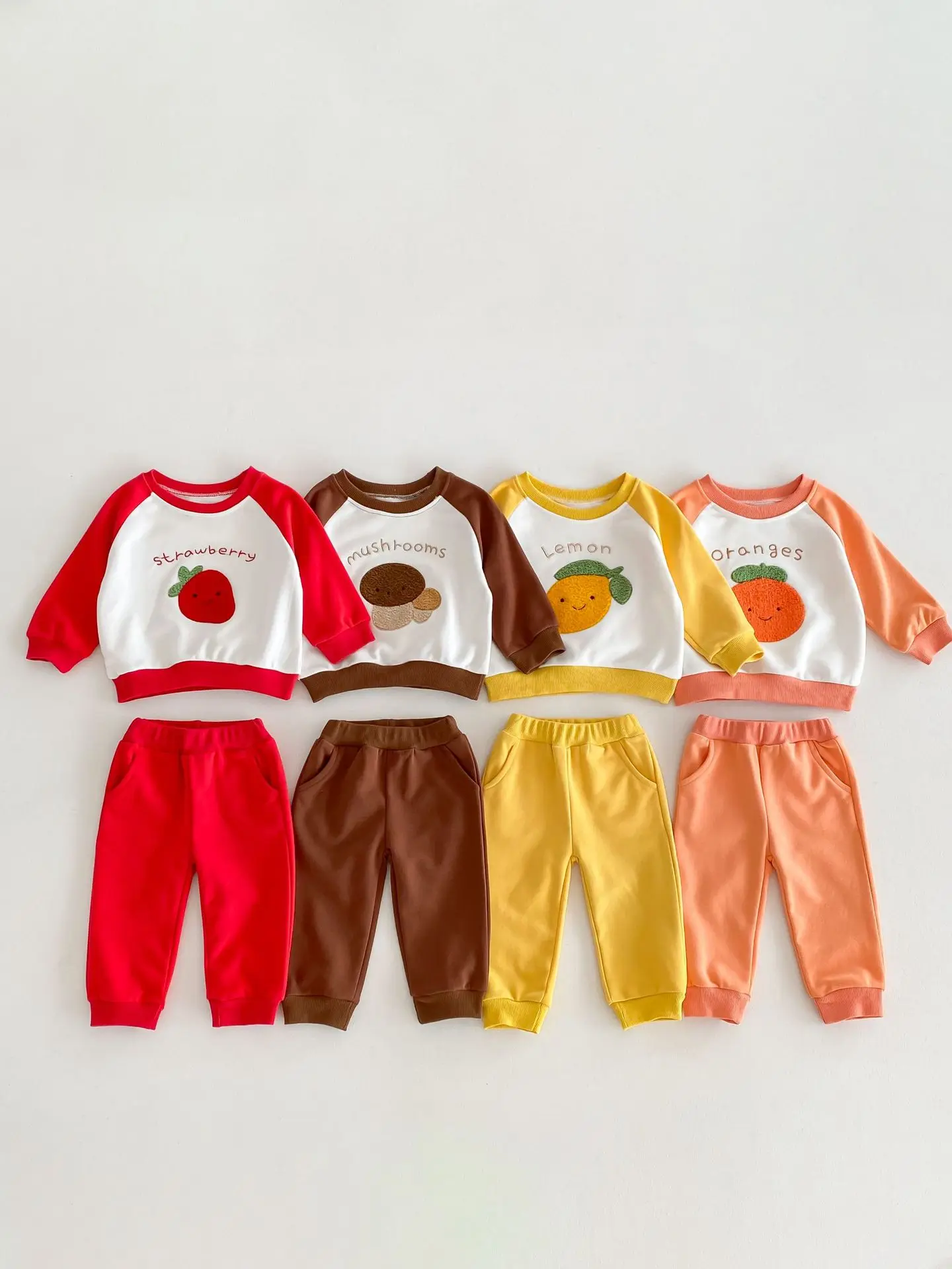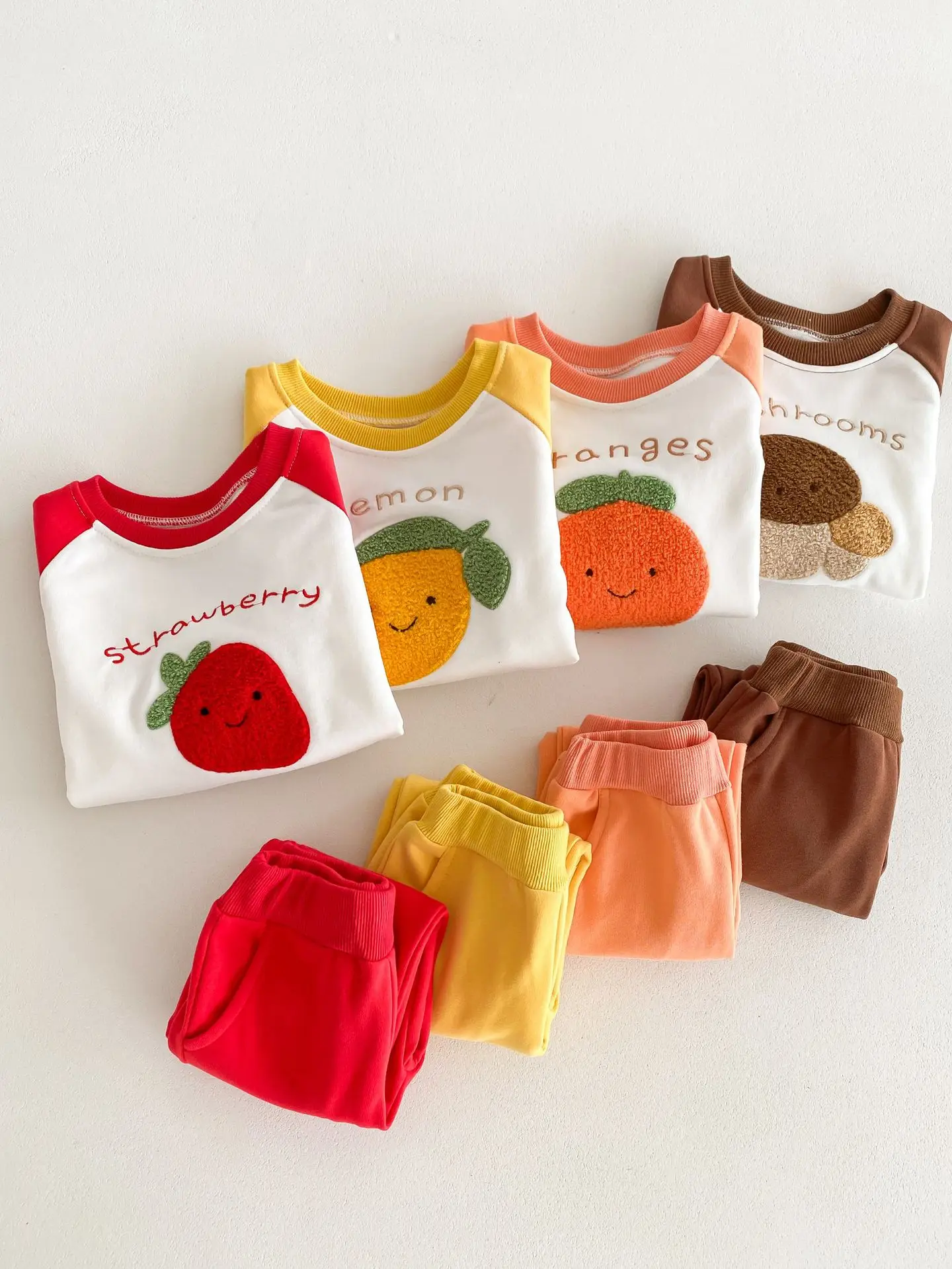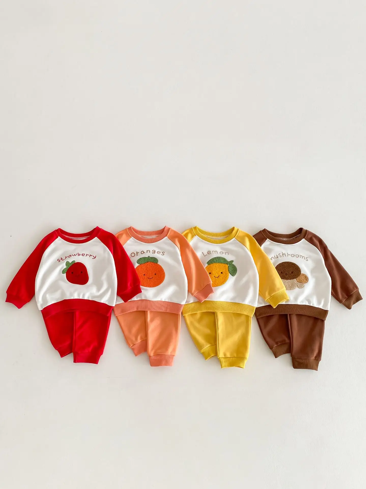 柑橘系のフルーツ柄が可愛らしい、ベビーキッズ向けの2点セットアップが登場しました。しっかりとしたスウェット素材で、お子様の動きを妨げずに快適な着心地を提供します。レモン、いちご、オレンジ、キノコの柄からお好きなパターンをお選びいただけます。