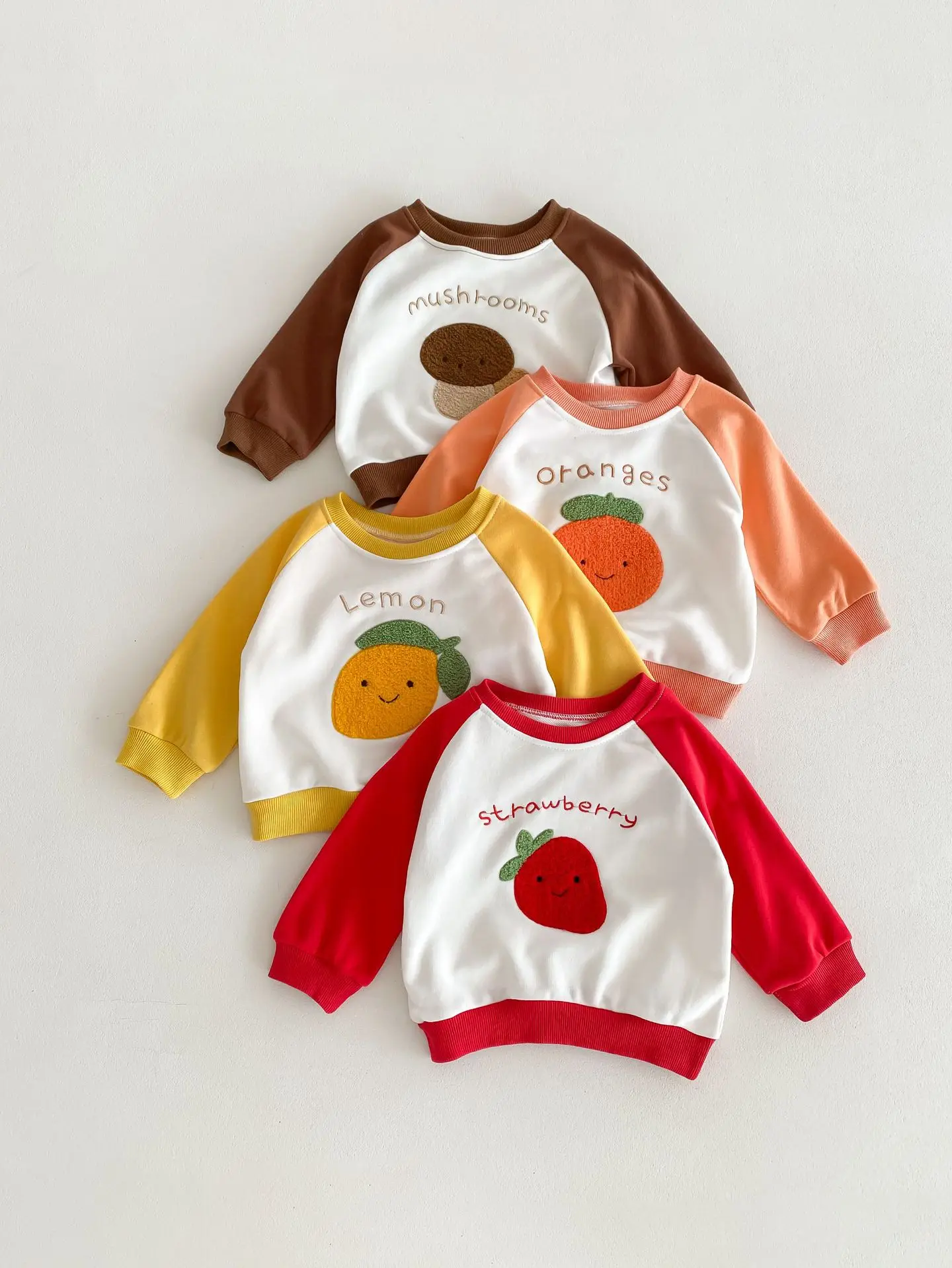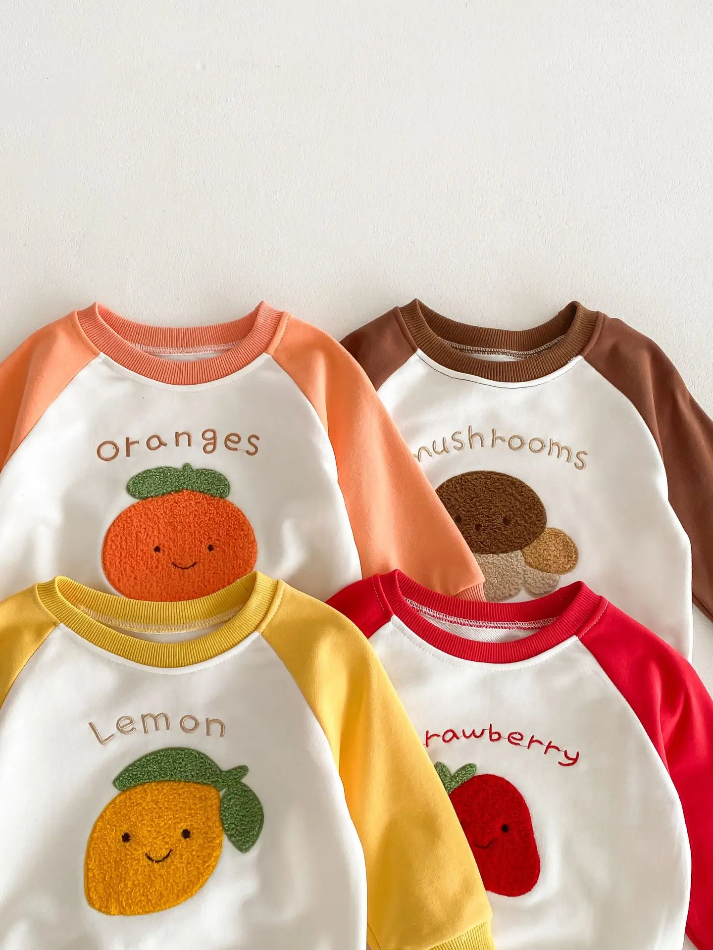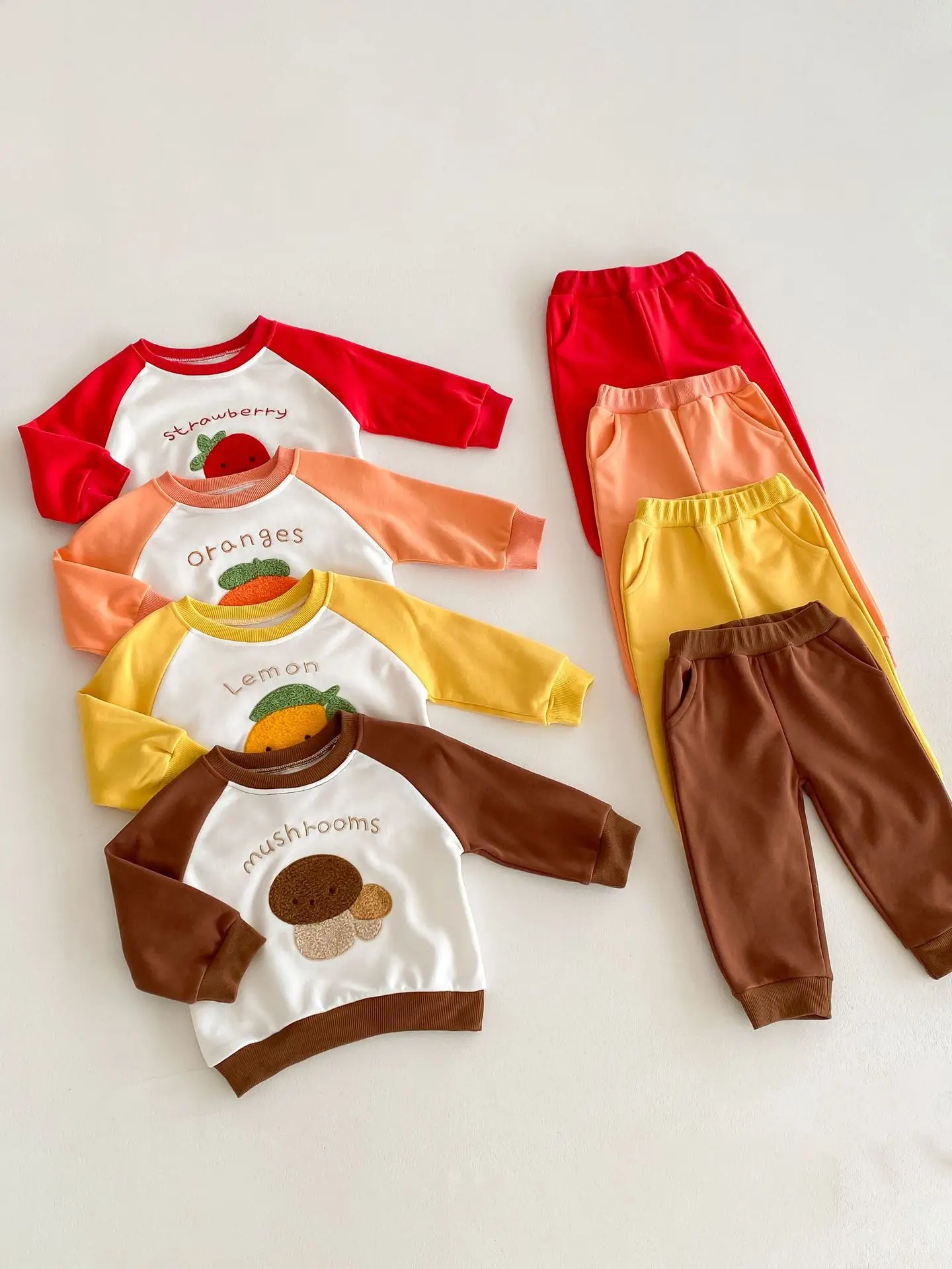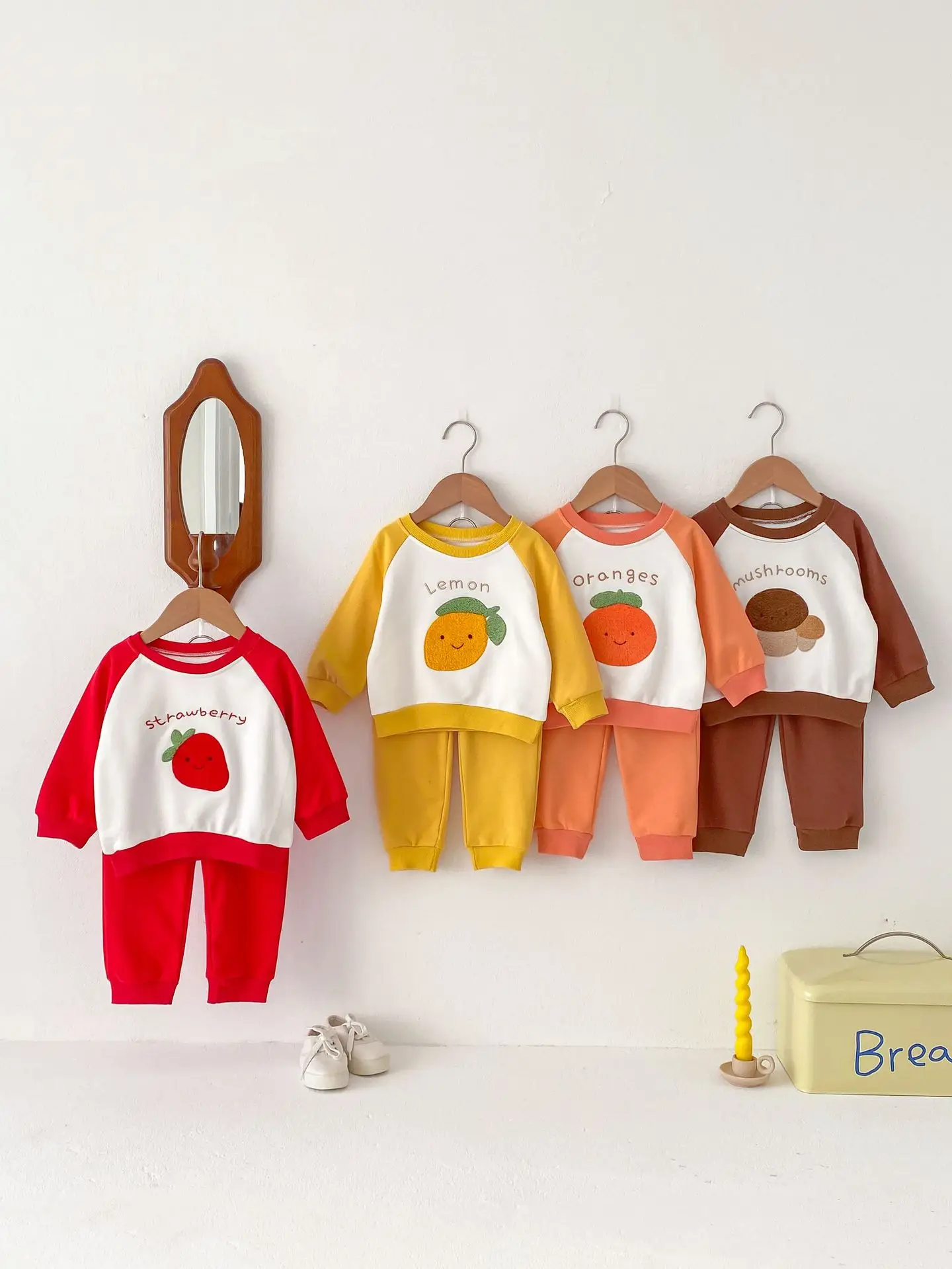 柑橘系のフルーツ柄が可愛らしい、ベビーキッズ向けの2点セットアップが登場しました。しっかりとしたスウェット素材で、お子様の動きを妨げずに快適な着心地を提供します。レモン、いちご、オレンジ、キノコの柄からお好きなパターンをお選びいただけます。