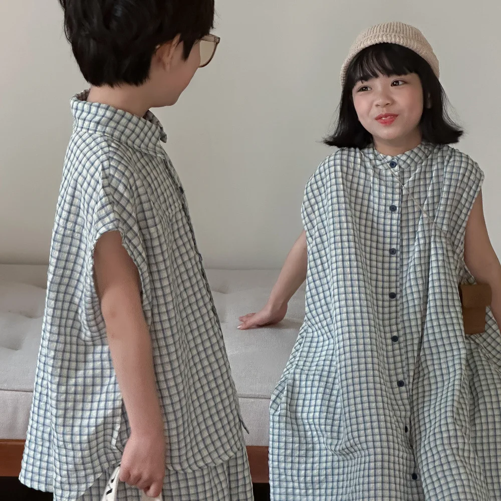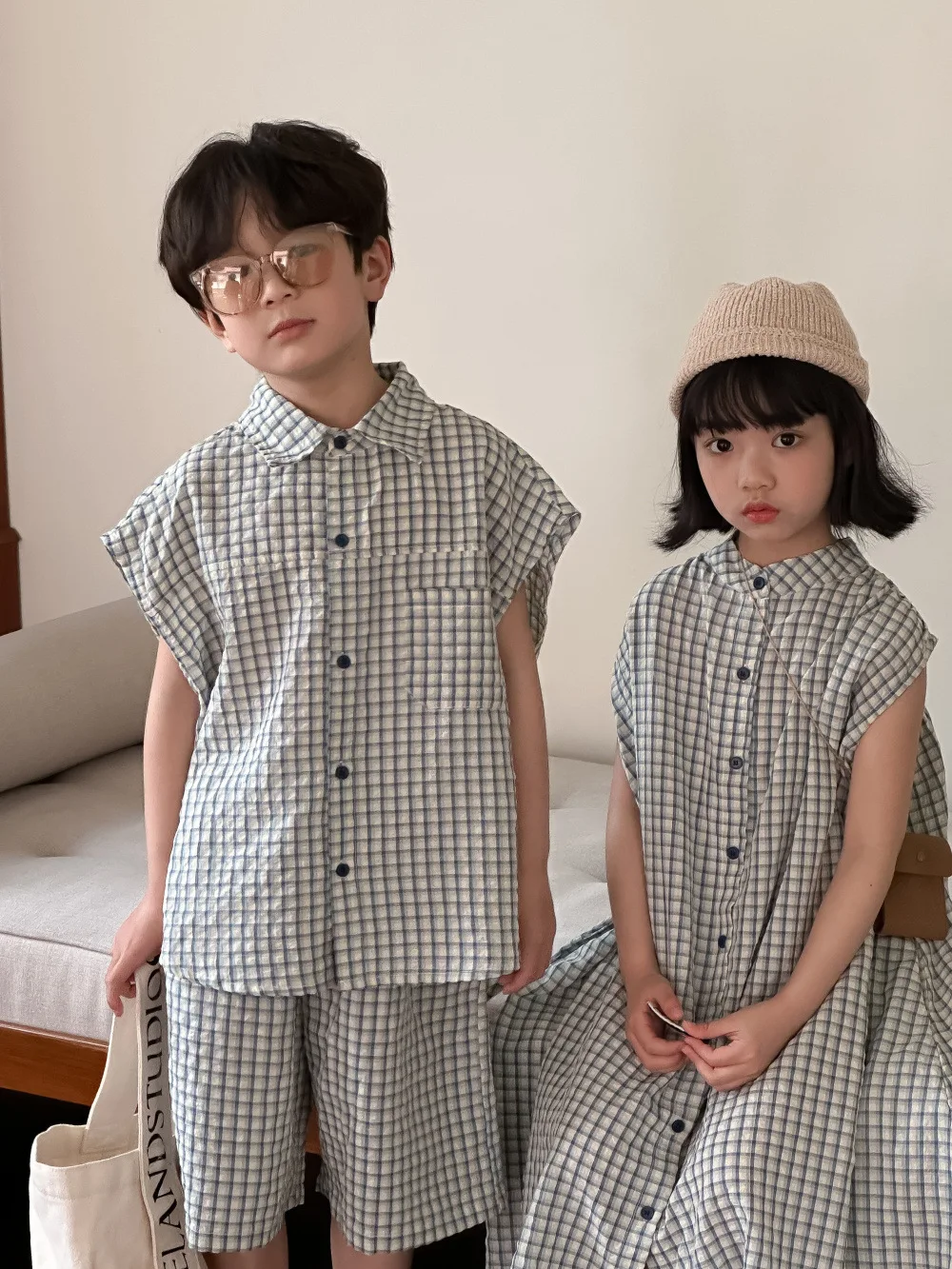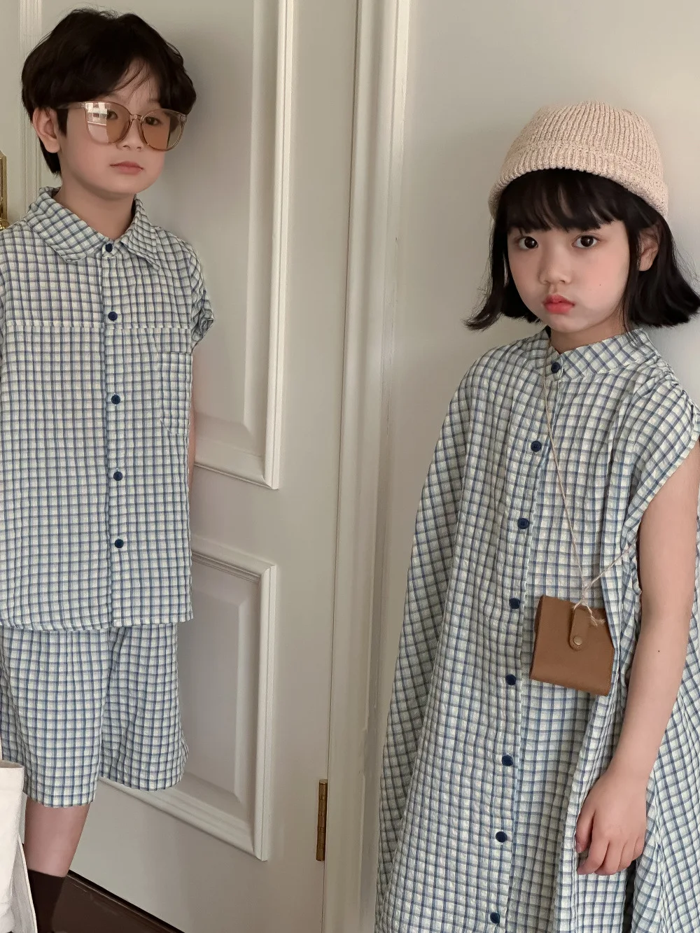キッズセットアップ 2点セット/ワンピース ボーイズ半袖シャツ+ショートパンツ/ガールズノースリーブフロントオープンワンピ チェック リンクコーデ 兄弟姉妹 お揃いコーデ【mh0004885】
