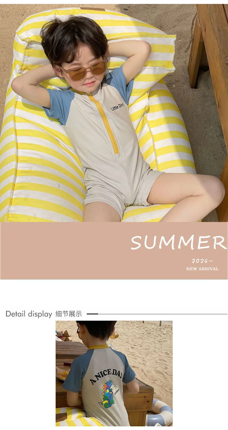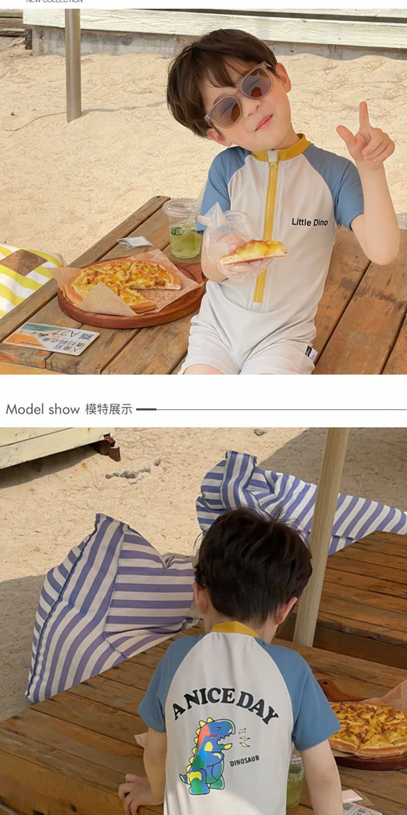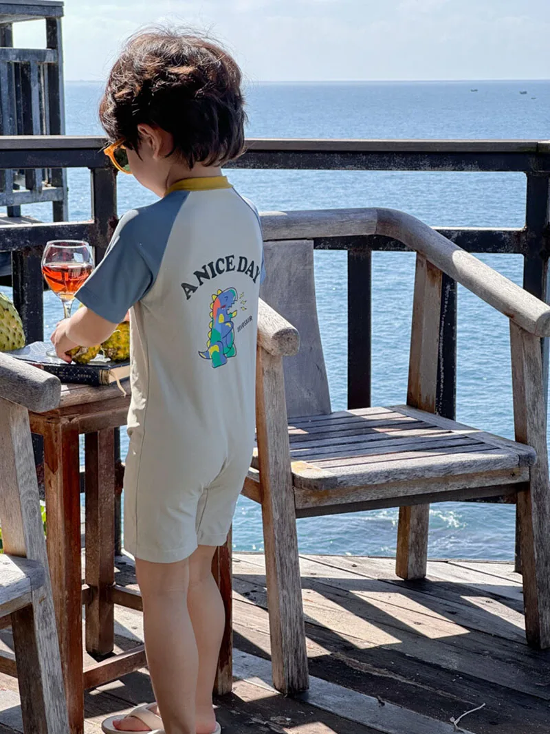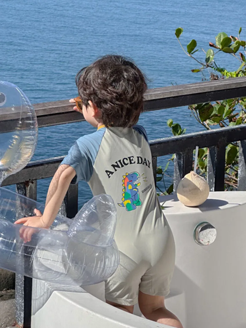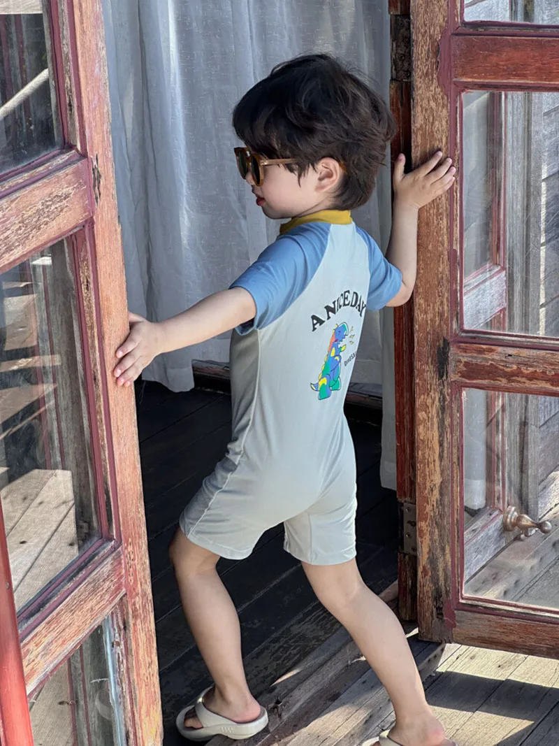 キッズ水着 半袖ラッシュガード つなぎ ワンピース スイムウェア 恐竜ダイナソープリント【mh0005114】