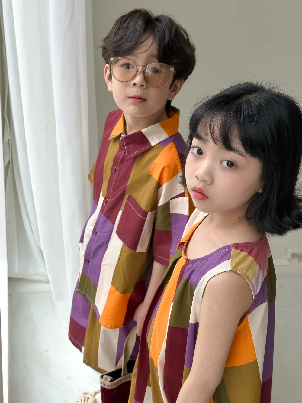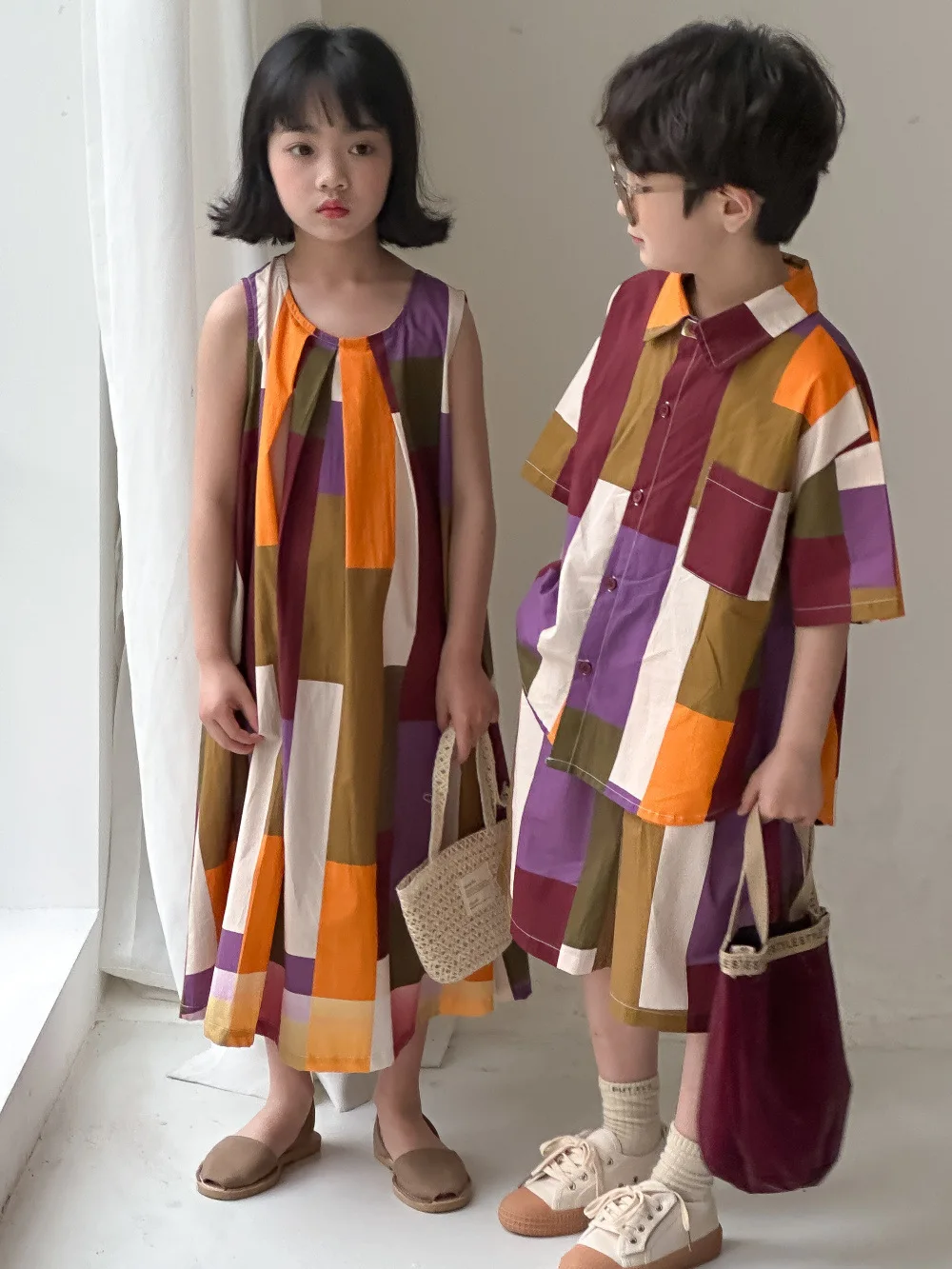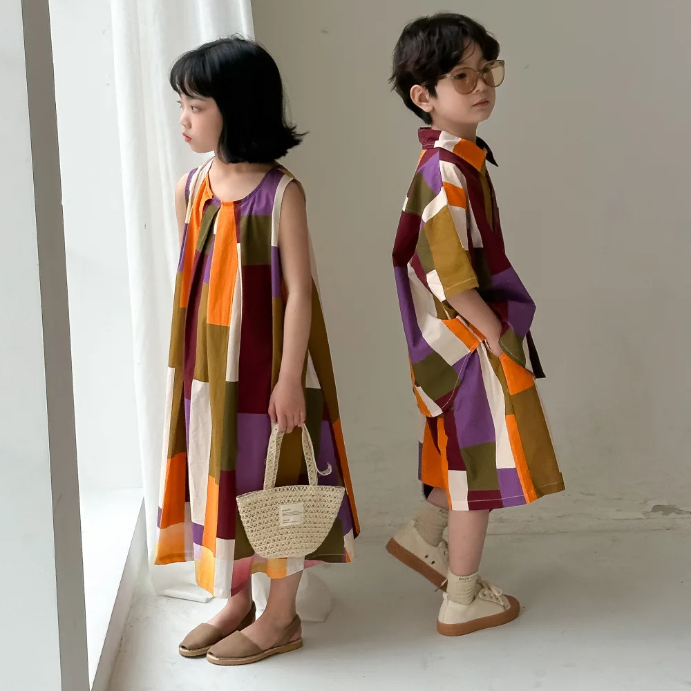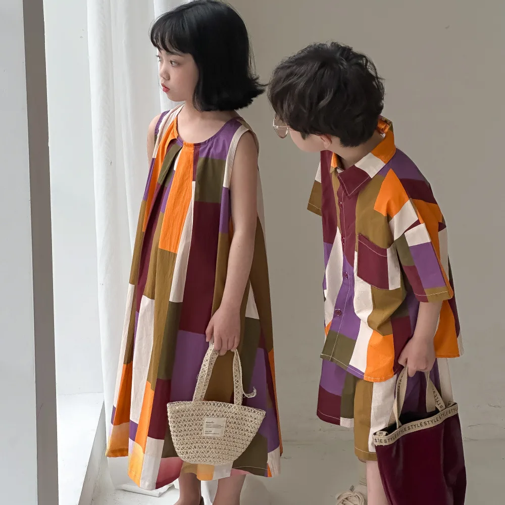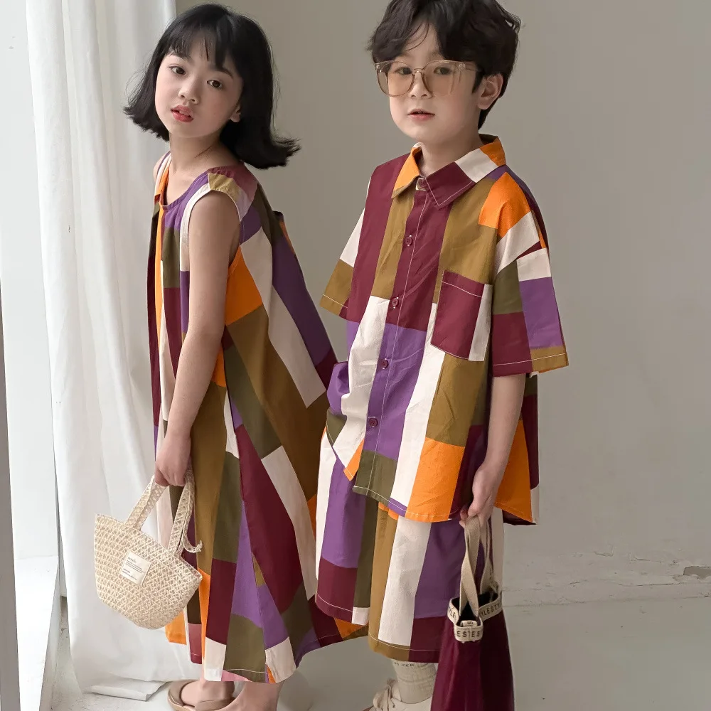 キッズセットアップ 2点セット/ワンピース ボーイズ半袖シャツ+ショートパンツ/ガールズノースリーブワンピース 幾何学チェック リンクコーデ 兄弟姉妹 お揃いコーデ【mh0005179】