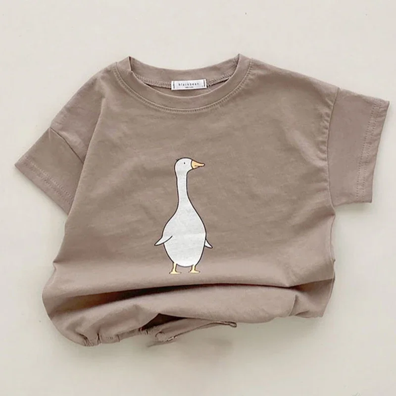 このかわいいベビーロンパースは、韓国スタイルの夏用ベビー服で、半袖で涼しく着られます。犬やあひるの柄がプリントされたデザインで、Tシャツタイプのラウンドカラーです。肌触りの良いコットン素材で、薄手のジャンプスーツタイプなので、赤ちゃんの服として最適です。暑い夏でも快適に過ごせる、お子様のお洒落な一着です。