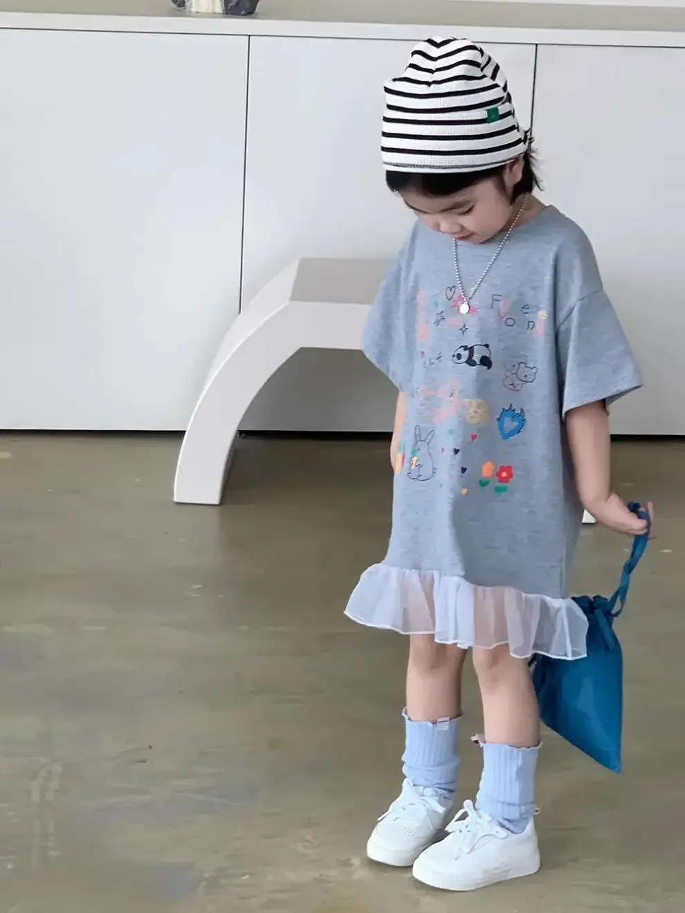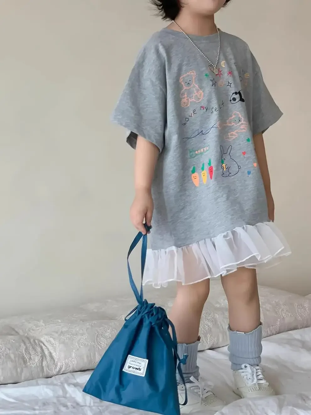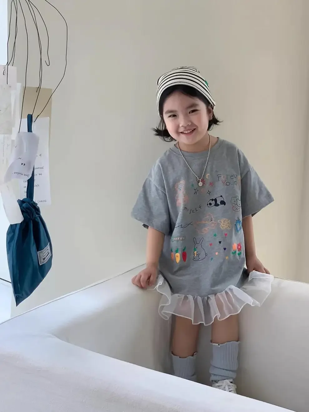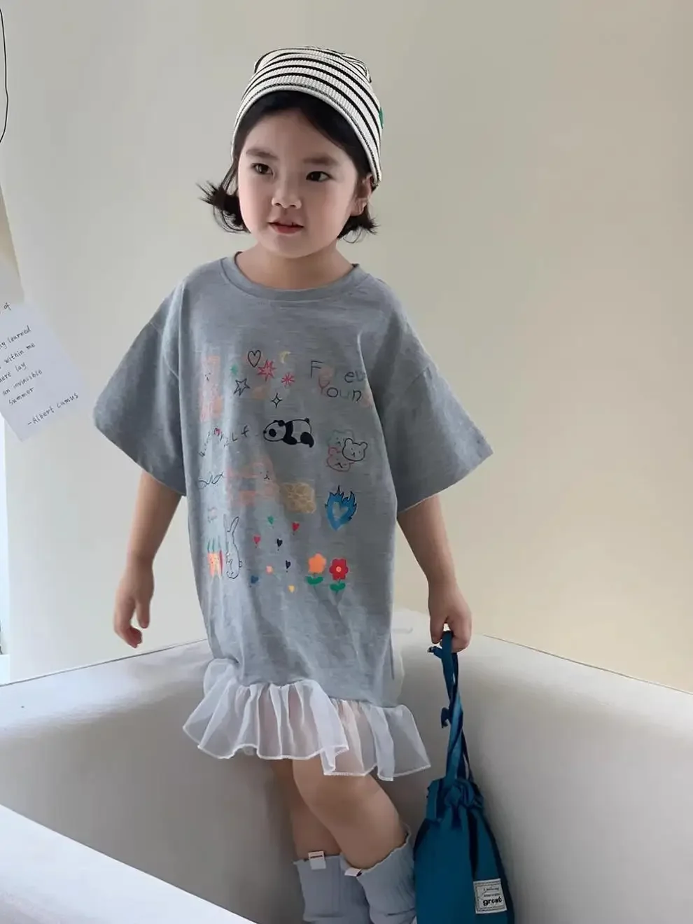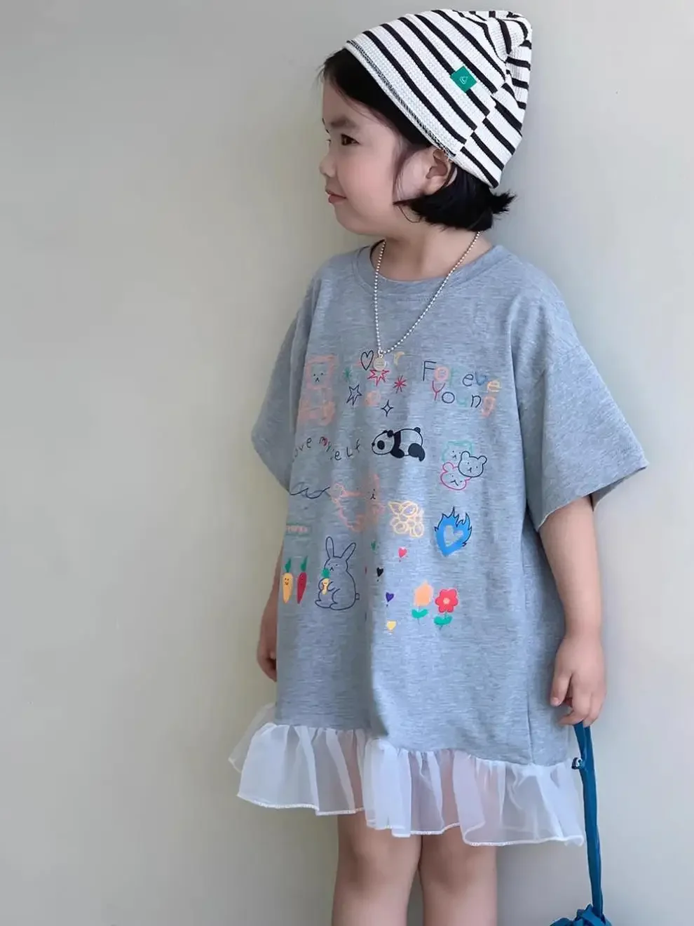 キッズワンピース 半袖Tシャツワンピース チュチュチュールフリル お絵描きプリント グレー【mh0006109】