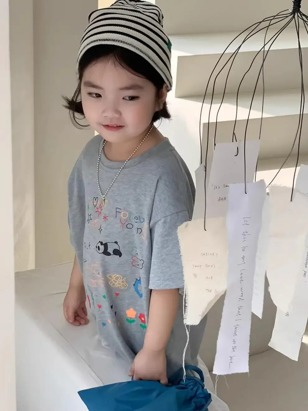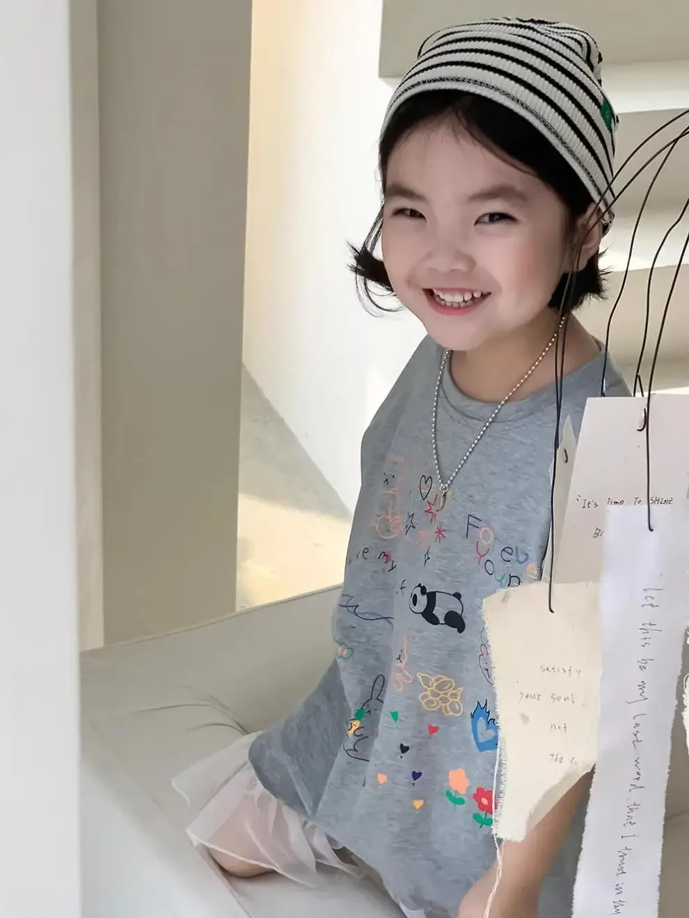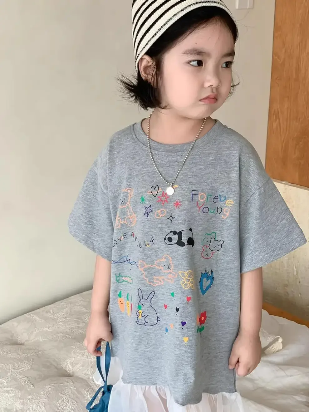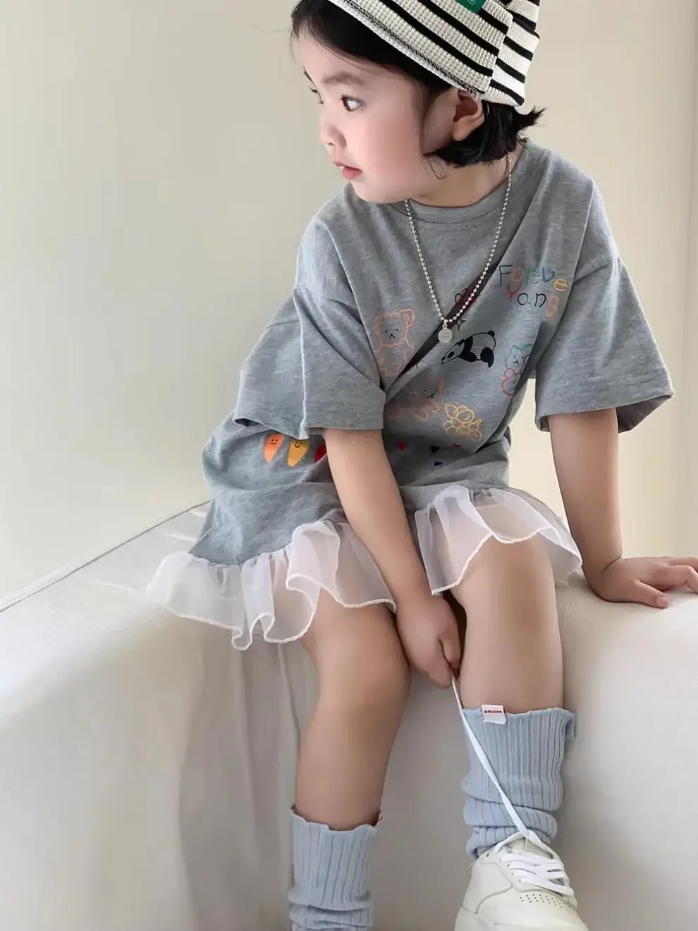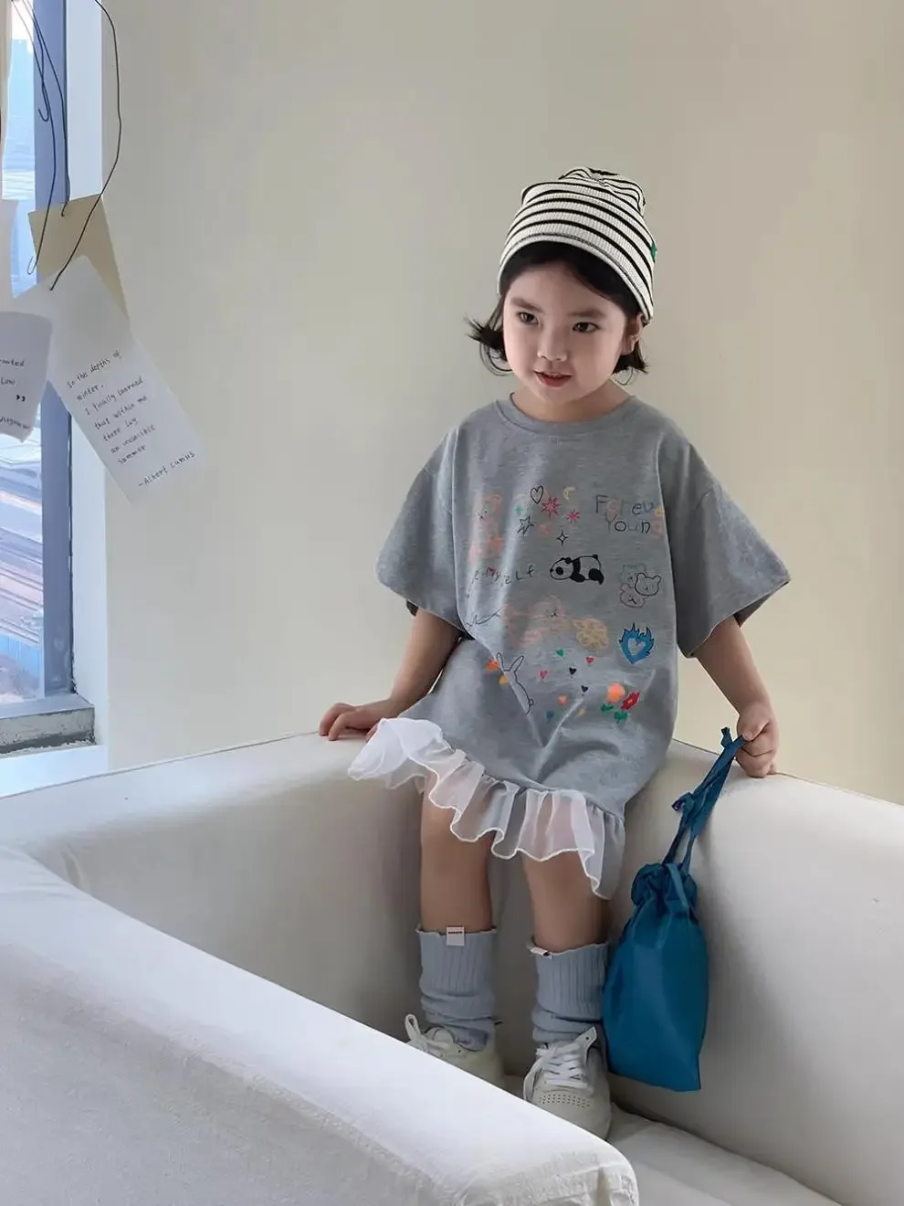 キッズワンピース 半袖Tシャツワンピース チュチュチュールフリル お絵描きプリント グレー【mh0006109】