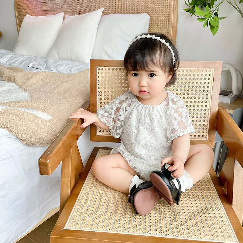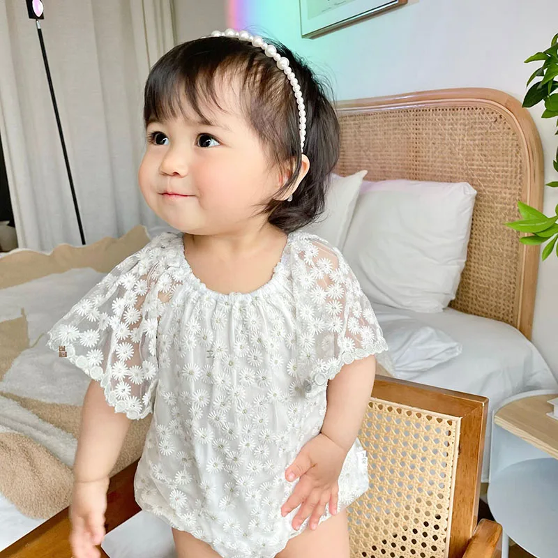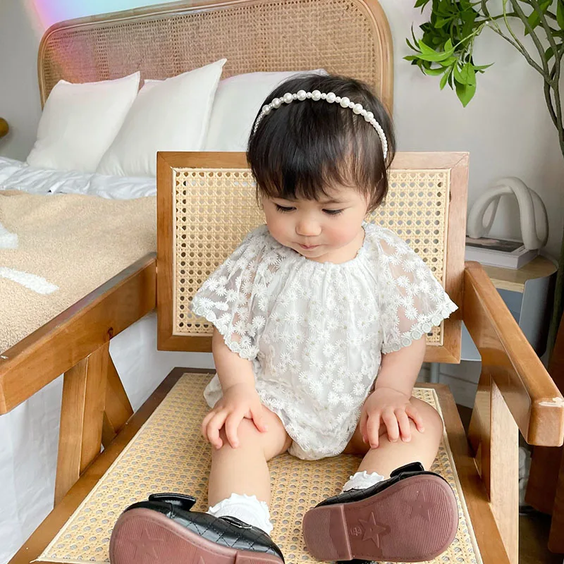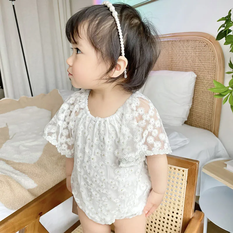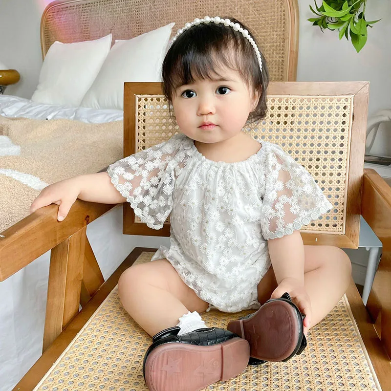 このエレガントなベビーロンパースは、夏にぴったりの半袖とフラワーレースの刺繍が特徴です。ベージュの色合いが贅沢な印象を与え、おしゃれな女の子にぴったりのアイテムです。柔らかいメッシュ素材で、赤ちゃんの肌にやさしく、涼しく快適に過ごせます。新生児にお勧めのボディスーツです。