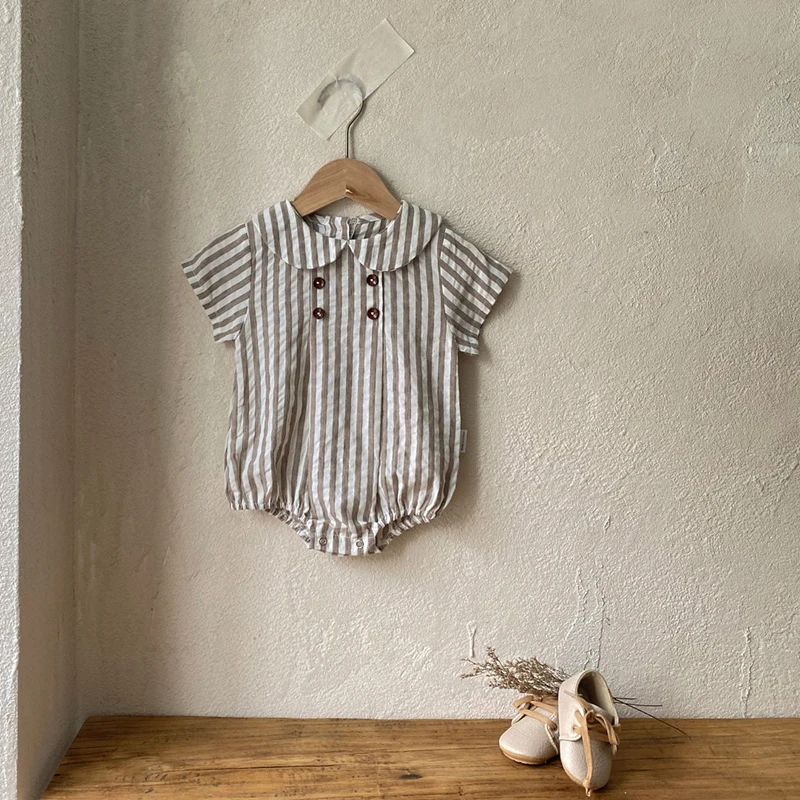 ベビーロンパース 半袖丸襟ボディスーツ 無地/ストライプ 2カラー【mh0006534】
