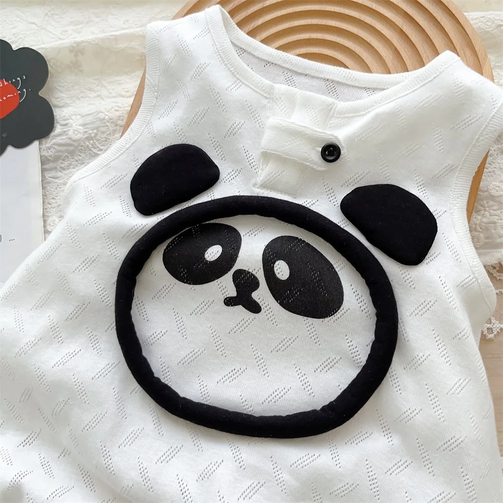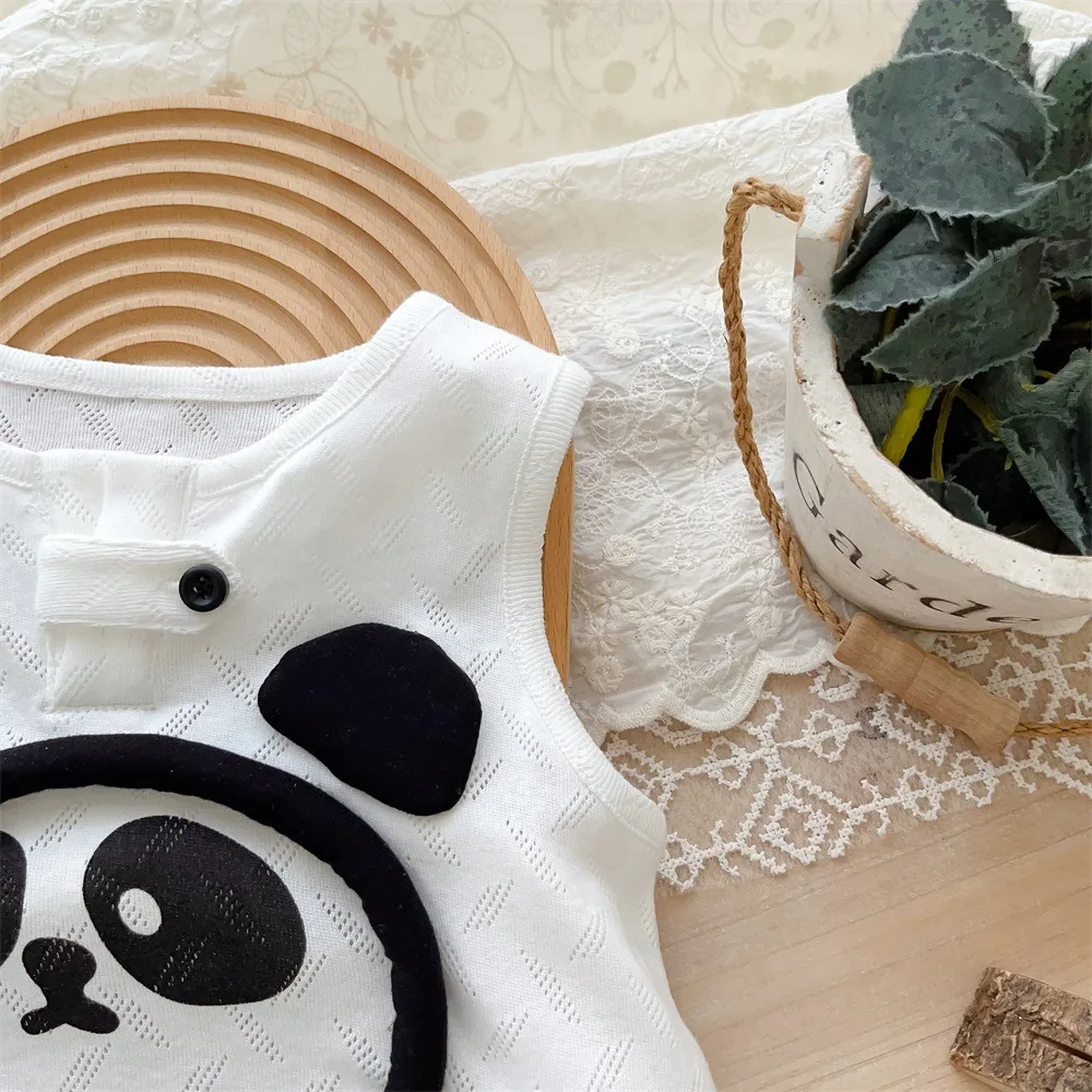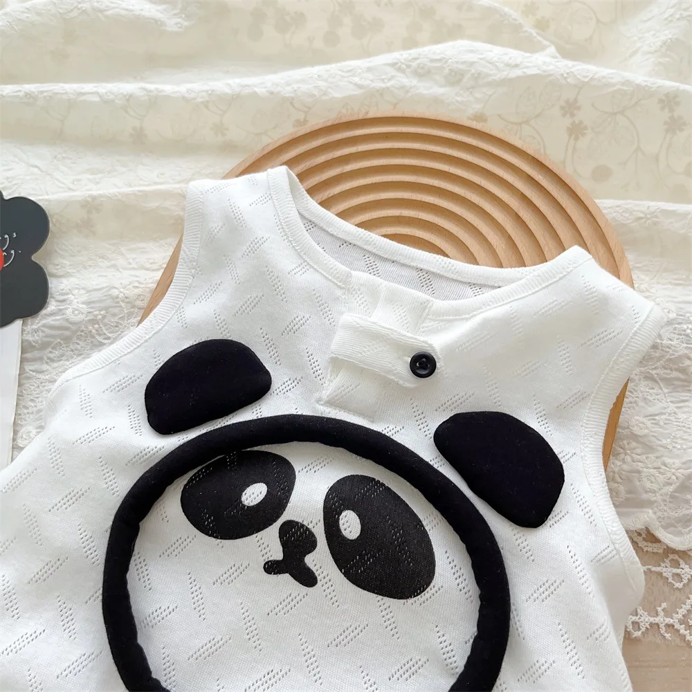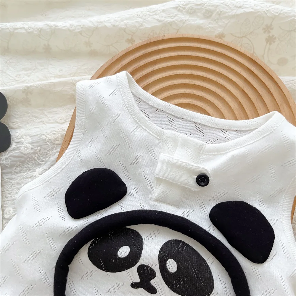 #ベビーロンパース #レースニット #ノースリーブ #パンダアップリケ #カジュアルスタイル #夏のベビー服 #かわいいデザイン