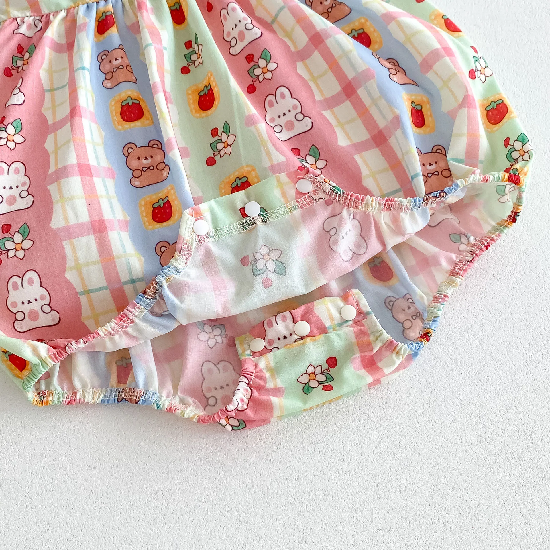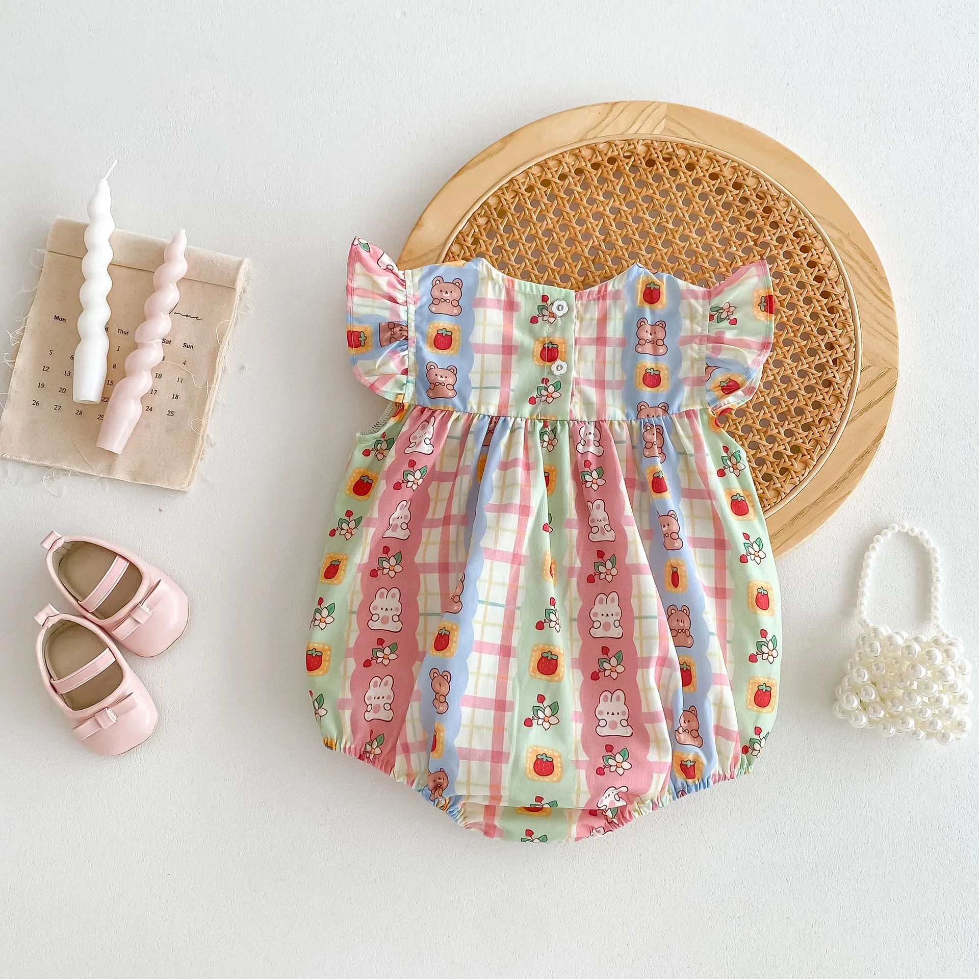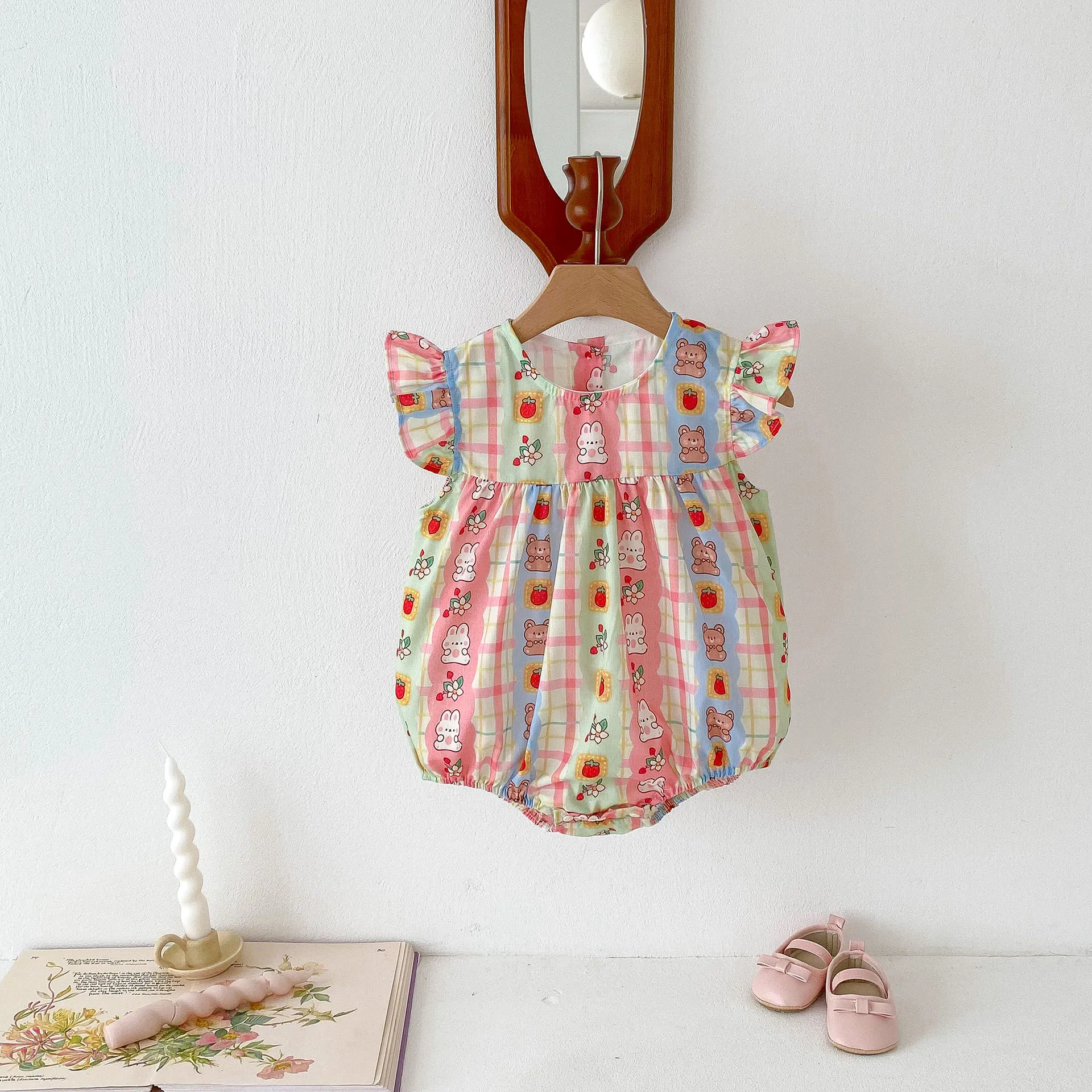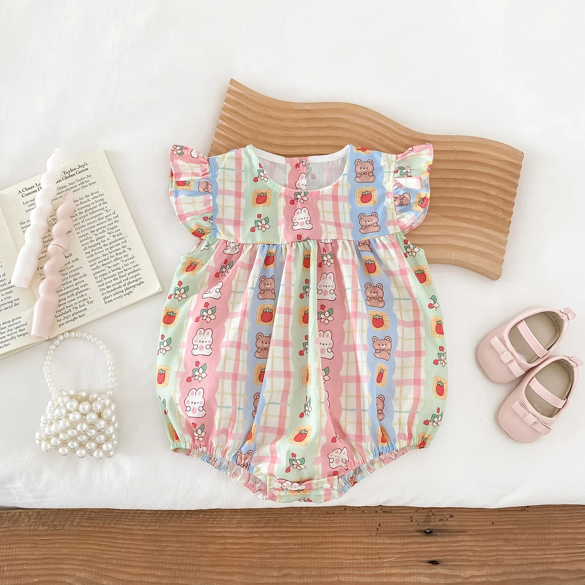 可愛らしいくまベアとうさぎのストライプレトロプリントが特徴のベビーロンパースです。フリルスリーブが女の子らしい華やかさを引き立て、デザインもおしゃれでキュート。柔らかなコットン素材で、赤ちゃんの肌に優しく、快適な着心地を提供します。スナップボタン付きで着脱もスムーズ。デイリーユースから特別な日まで、あらゆるシーンで活躍するロンパースをお楽しみください。