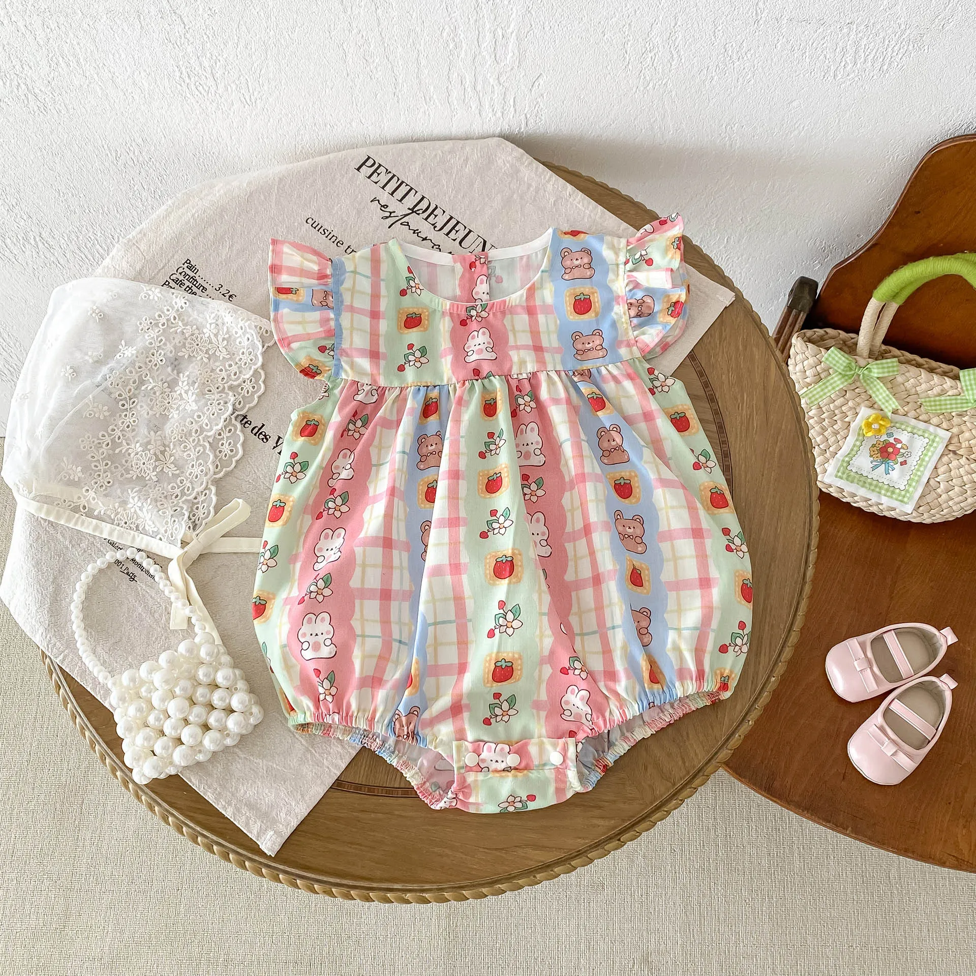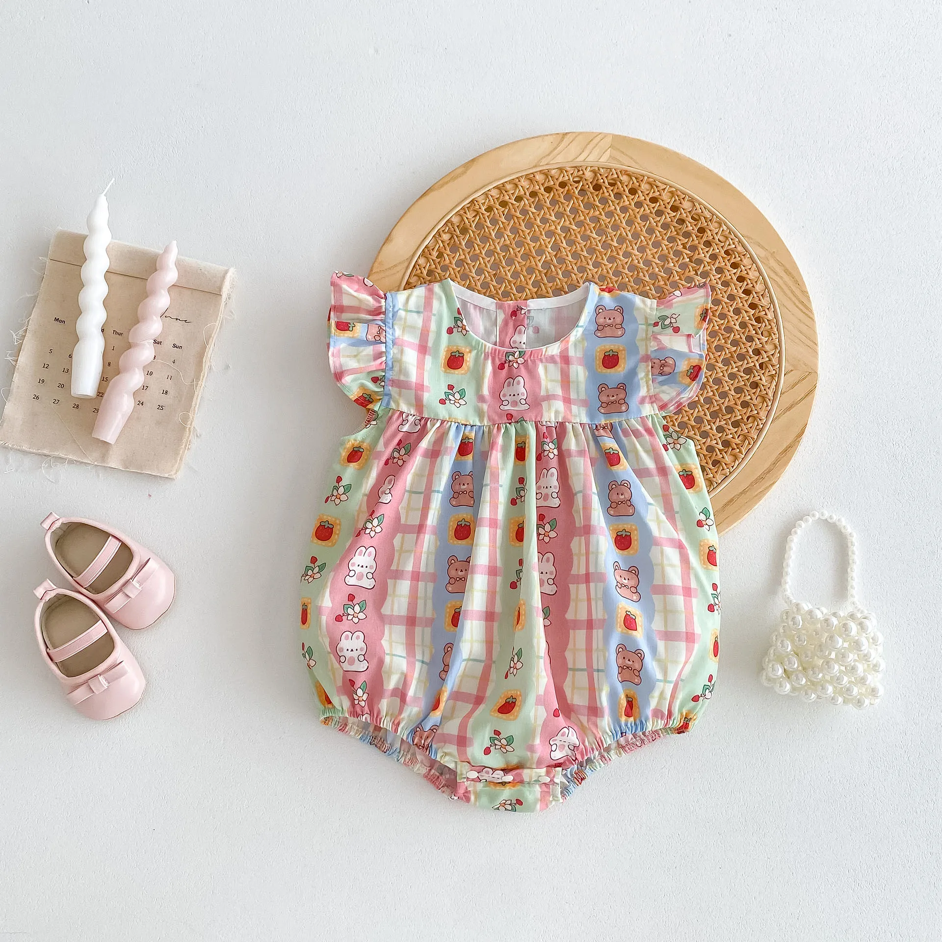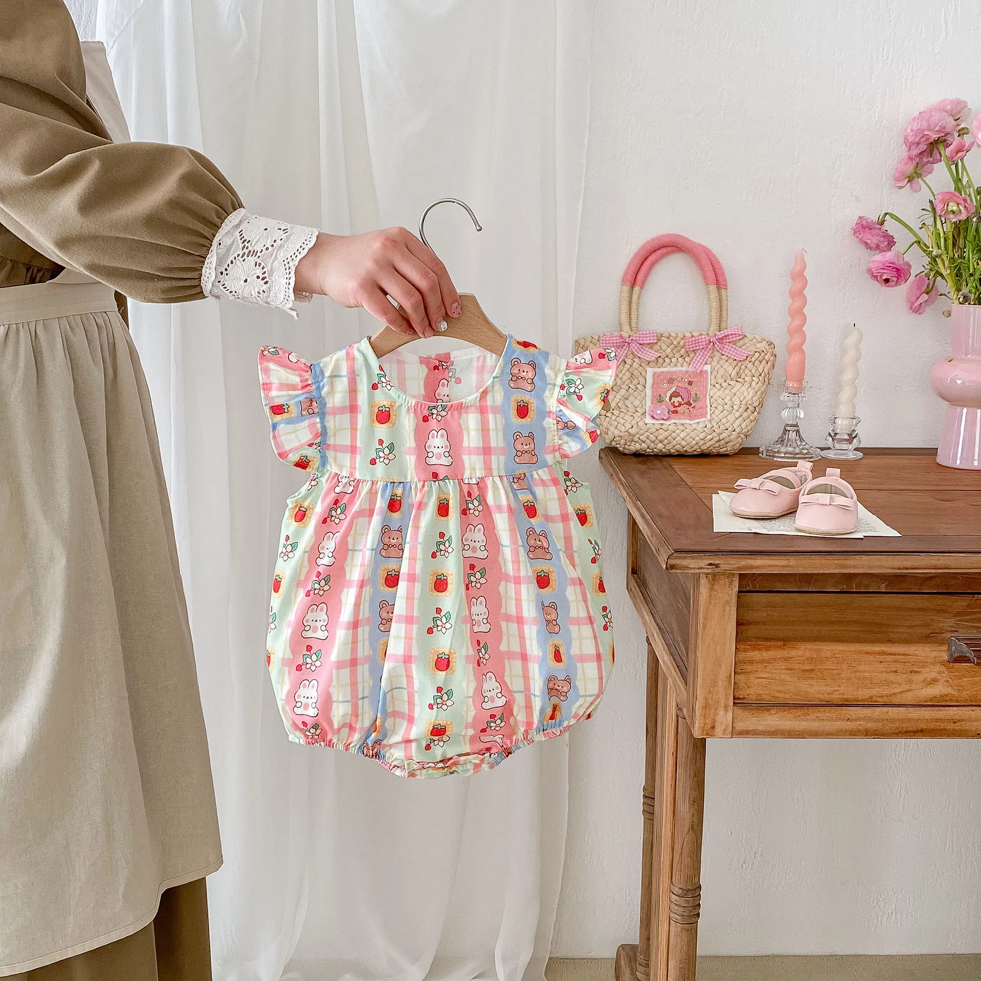 可愛らしいくまベアとうさぎのストライプレトロプリントが特徴のベビーロンパースです。フリルスリーブが女の子らしい華やかさを引き立て、デザインもおしゃれでキュート。柔らかなコットン素材で、赤ちゃんの肌に優しく、快適な着心地を提供します。スナップボタン付きで着脱もスムーズ。デイリーユースから特別な日まで、あらゆるシーンで活躍するロンパースをお楽しみください。