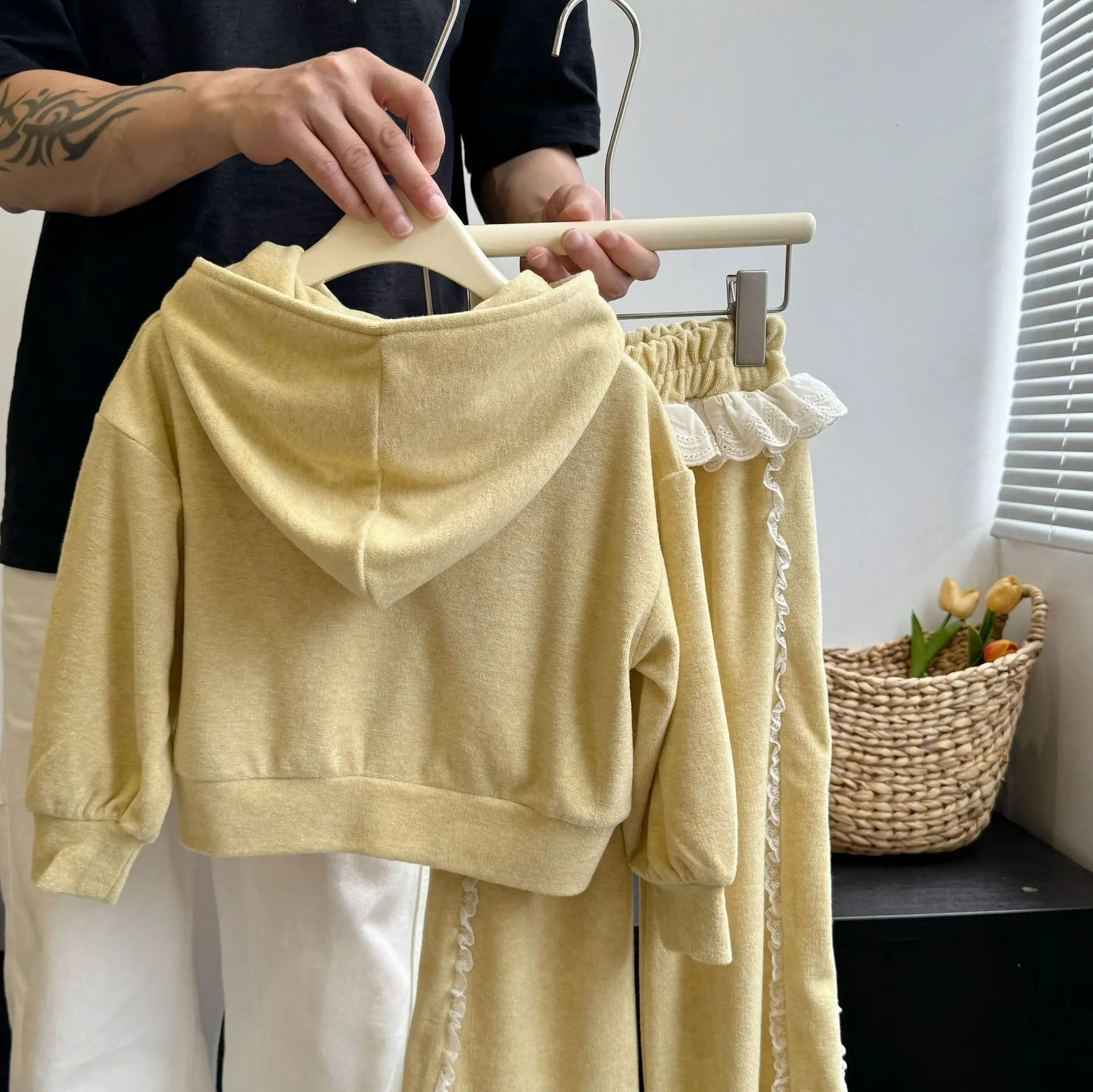 キッズセットアップ 2点セット フーディジップアップ長袖パーカー+サイドフリルワイドルーズスウェットパンツ 2カラー【mh0007340】