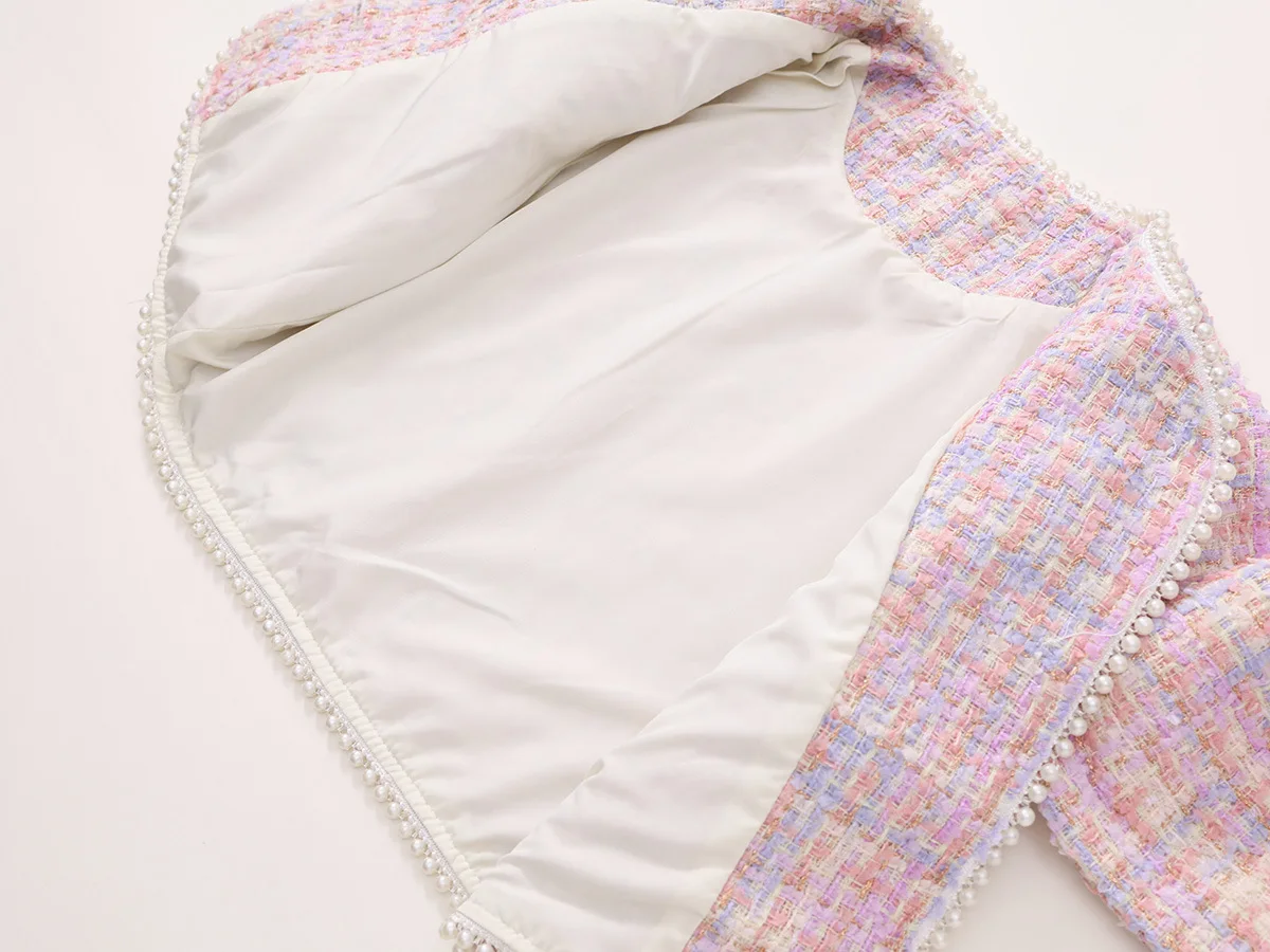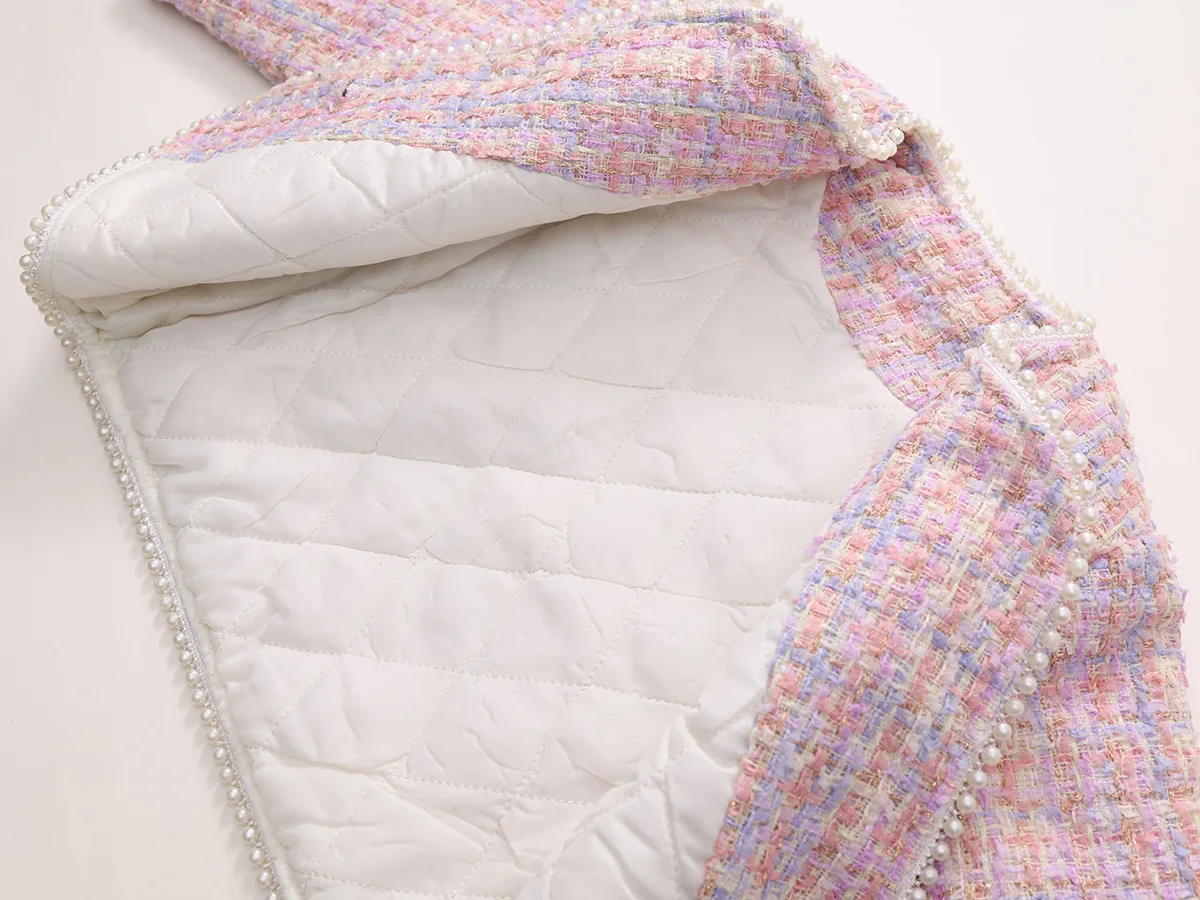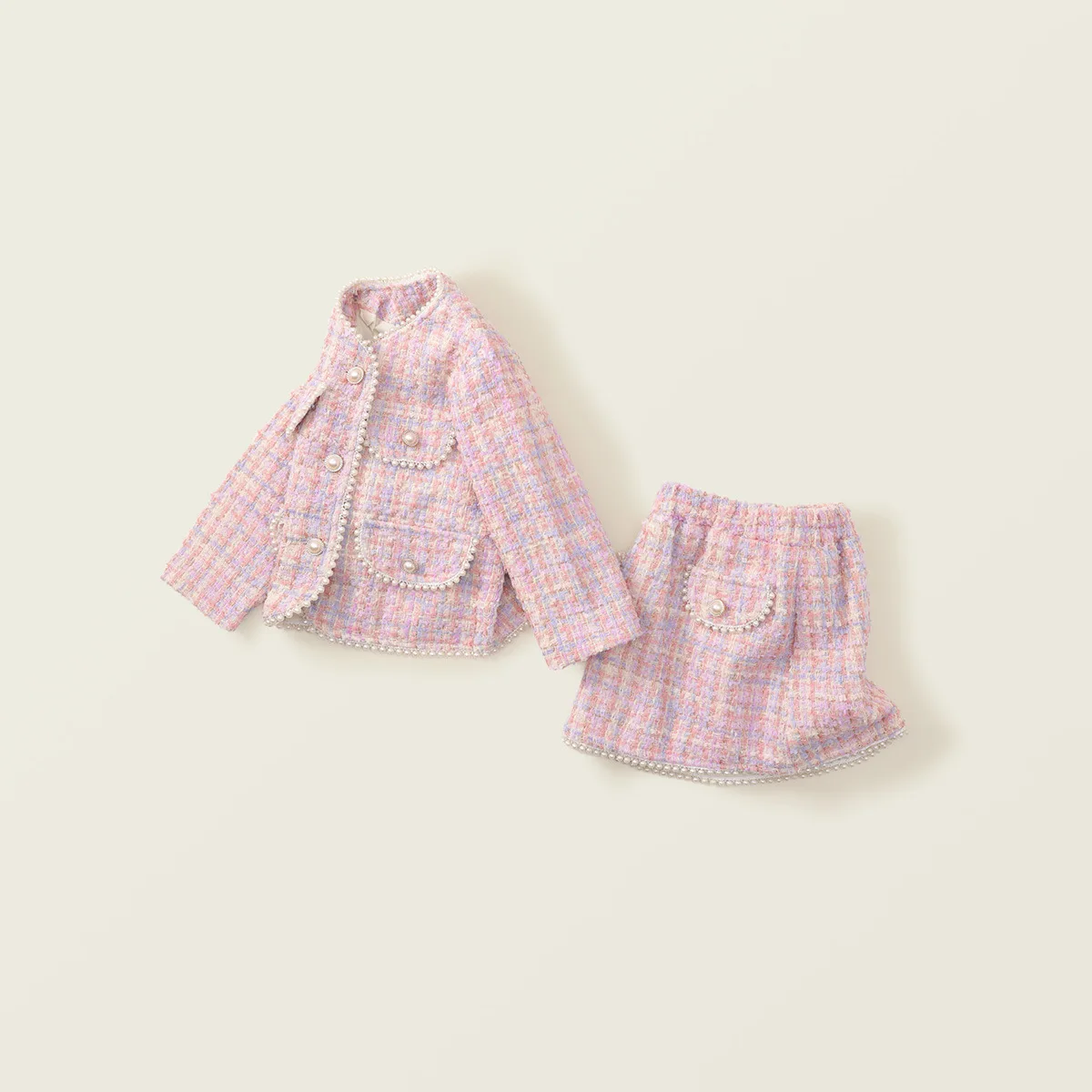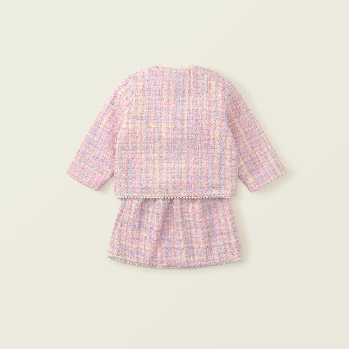 キッズスーツセットアップ 2点セット ツイードパールボタンジャケット+台形スカート 厚手/薄手 ピンク【mh0007498】