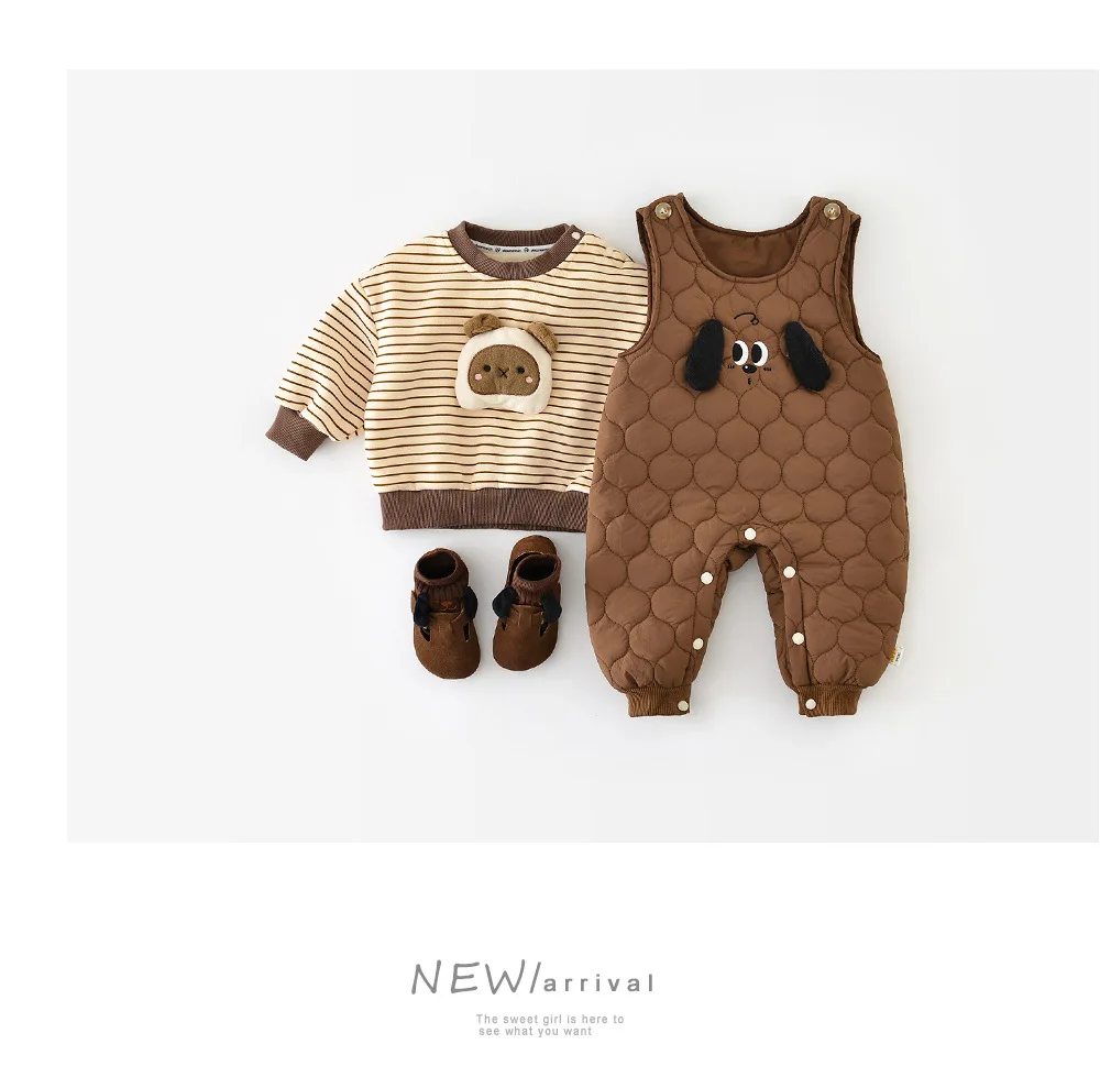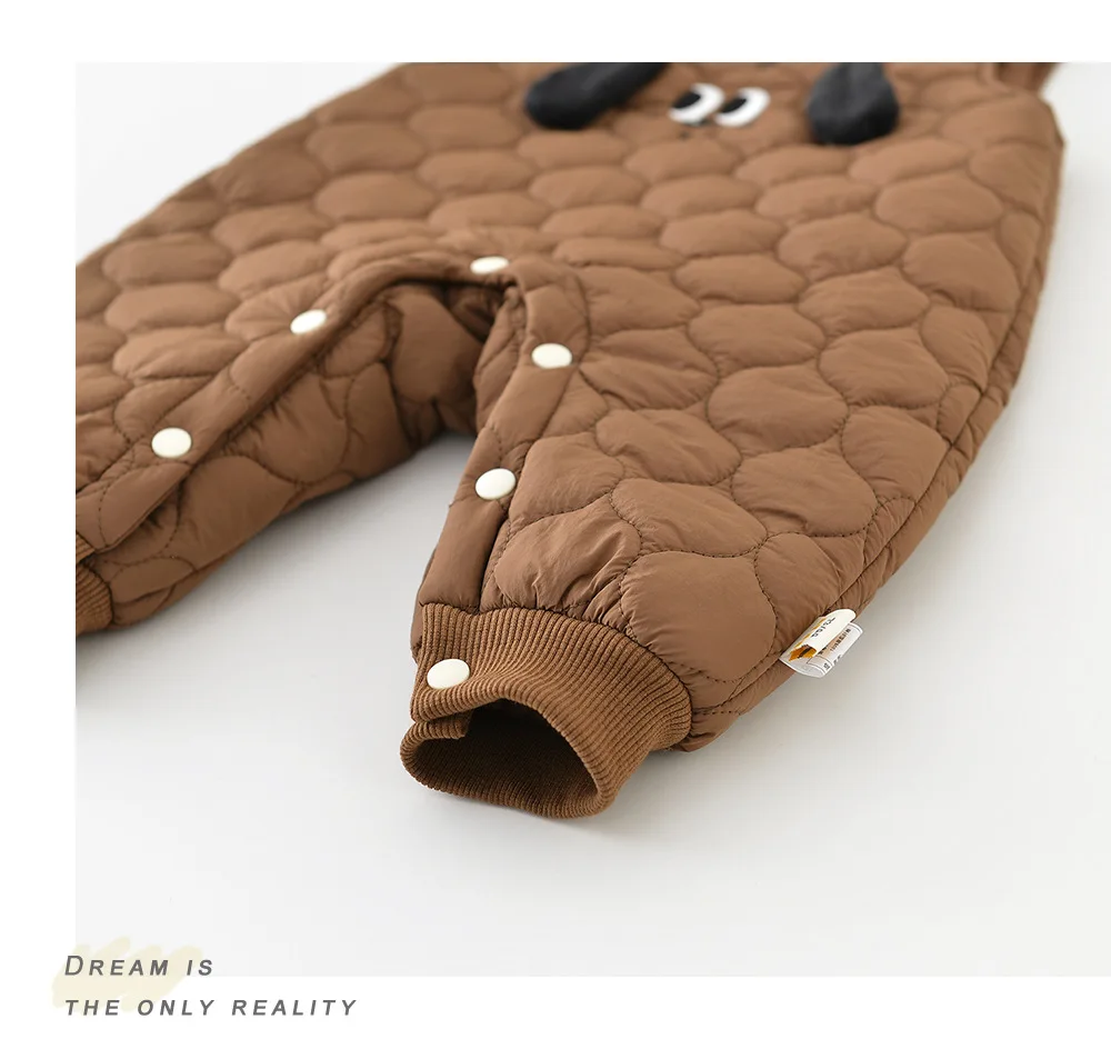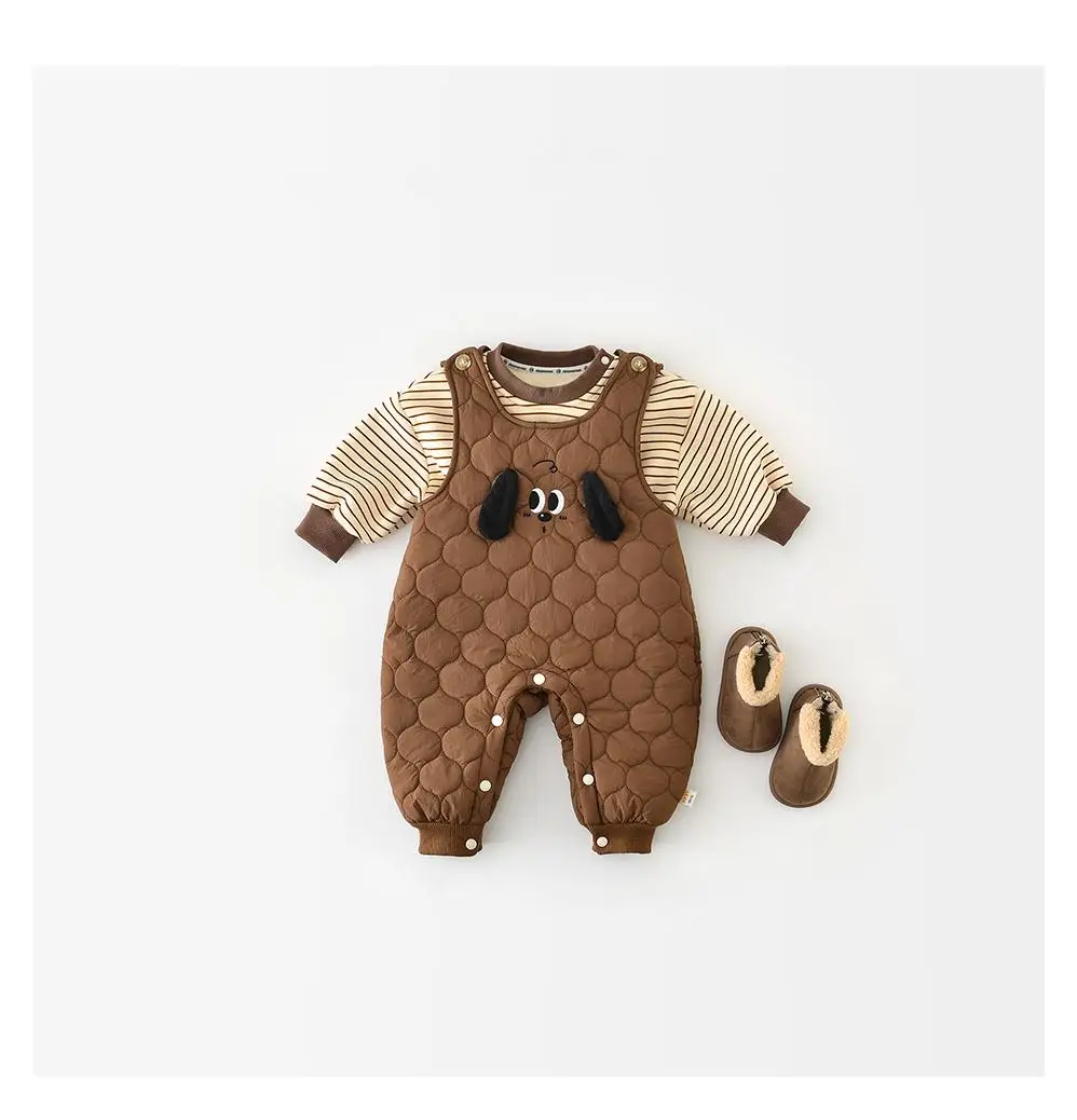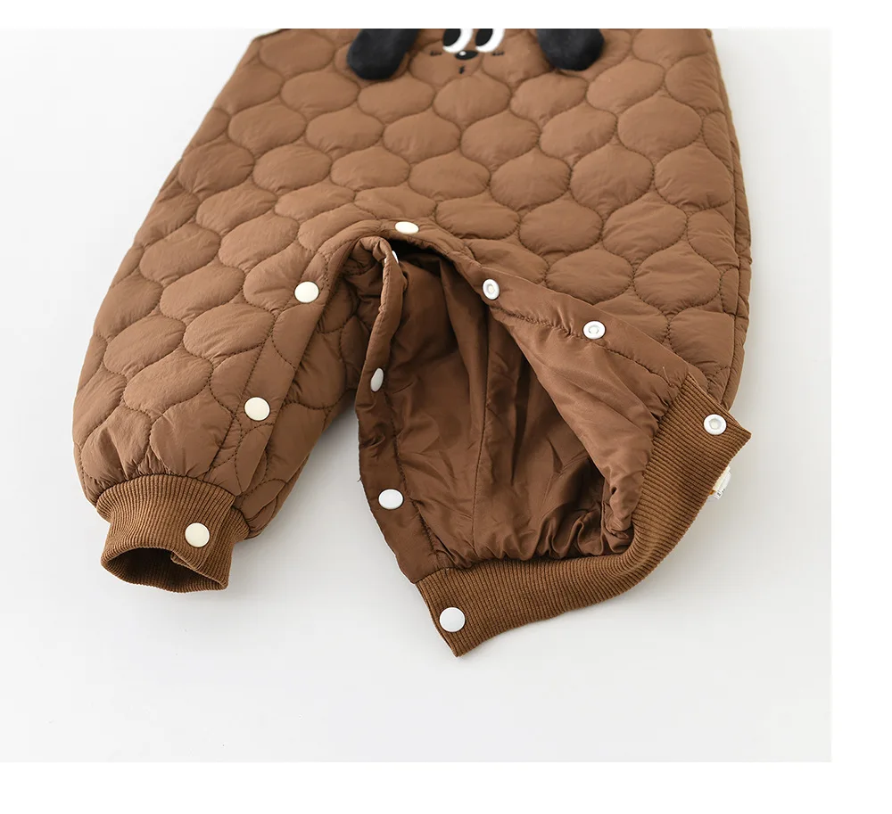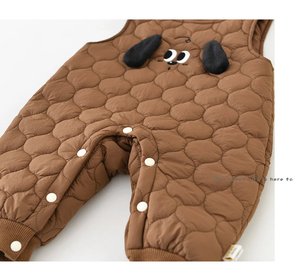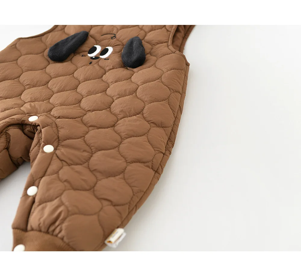 #ベビー服 #ベビージャンプスーツ #犬アップリケ #ロンパース #キルティングデザイン #冬のベビー服 #フリースロンパース
