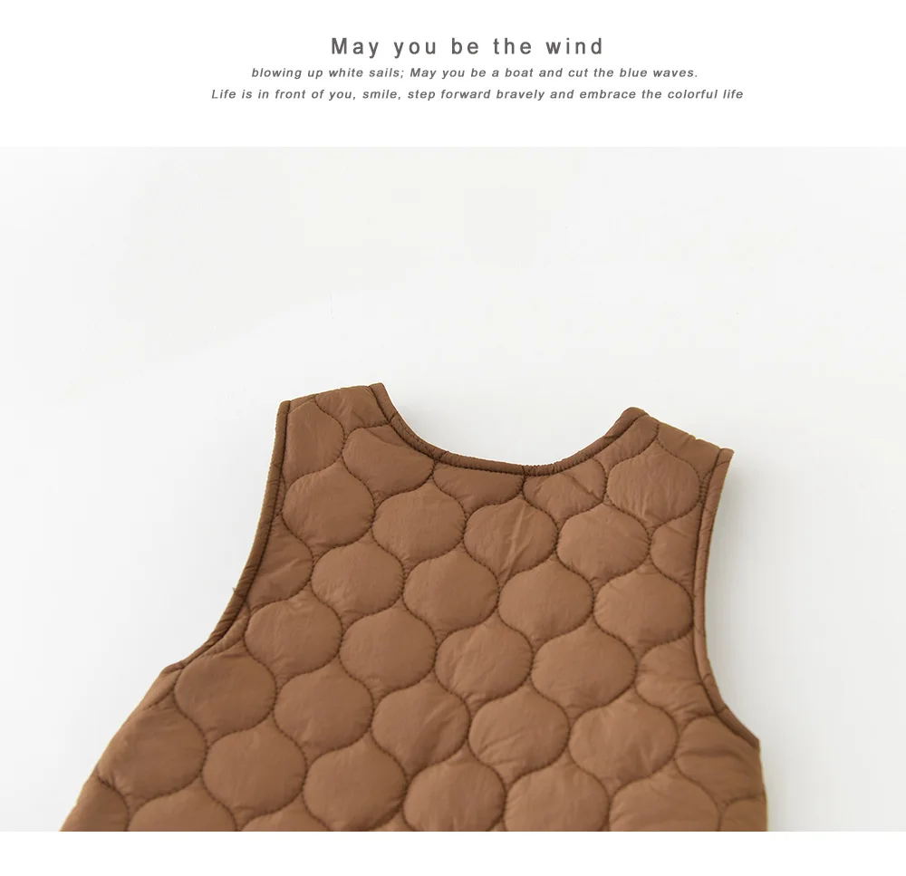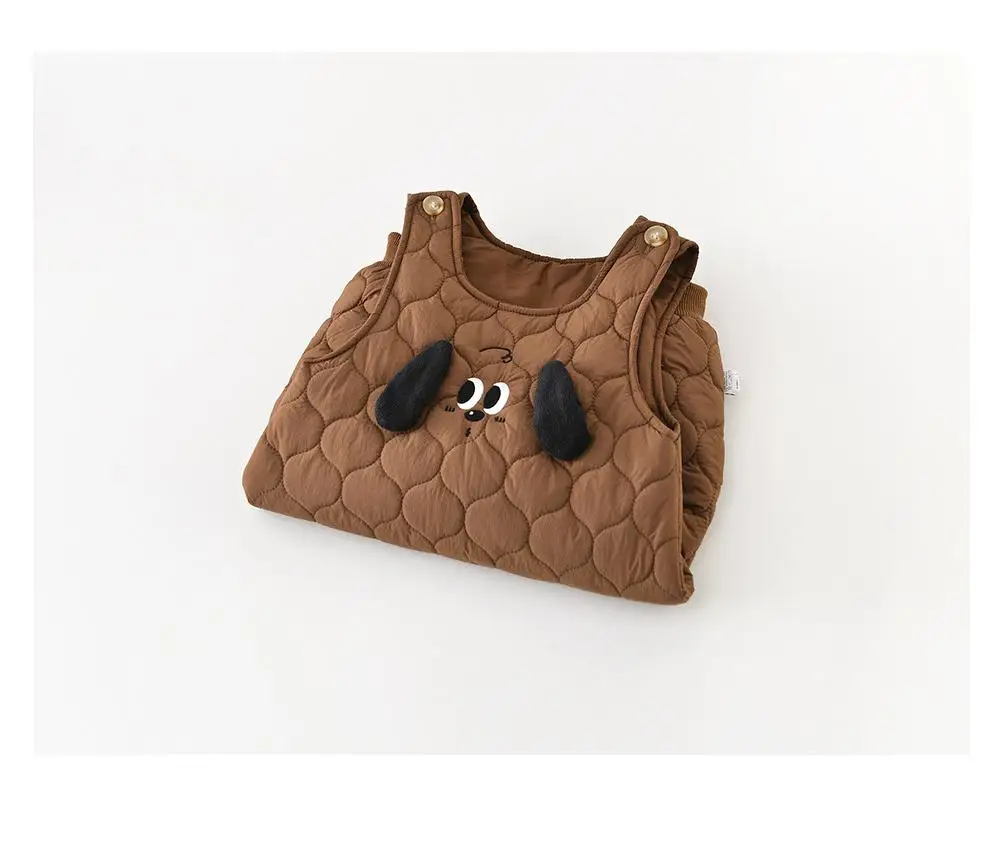 犬ドッグアップリケが施されたキルティングノースリーブロンパースは、寒い季節でもお子さまを暖かく包み込むアイテムです。柔らかなフリース素材とプラスベロアの厚手生地がしっかりと保温し、温かく快適な着心地を提供します。ノースリーブデザインで動きやすく、ロンパース型のシンプルで可愛らしいデザインが特徴です。お出かけやお昼寝時にも活躍し、犬のアップリケが可愛さを引き立てます。寒い冬にぴったりの、実用的でおしゃれなジャンプスーツです。