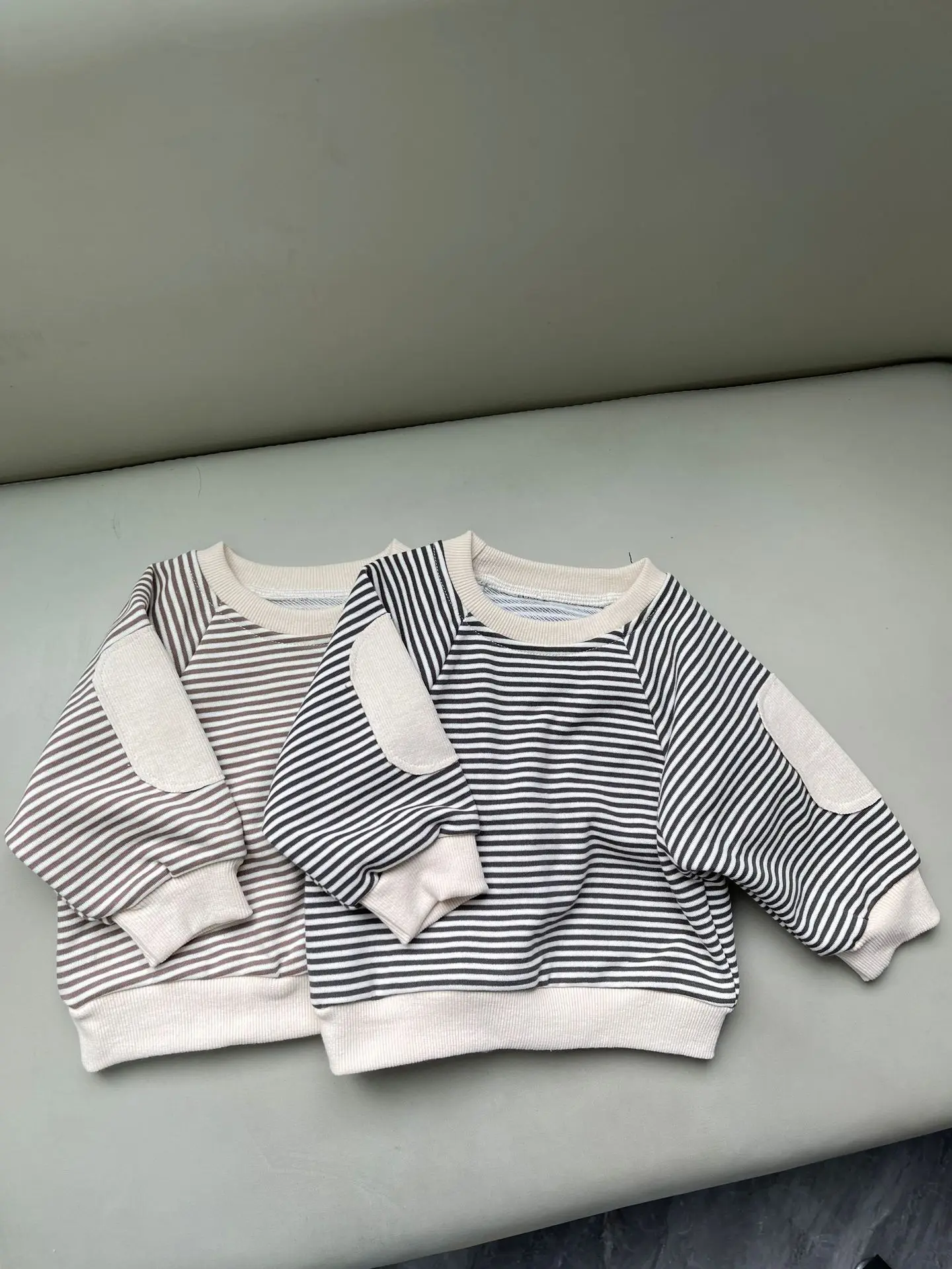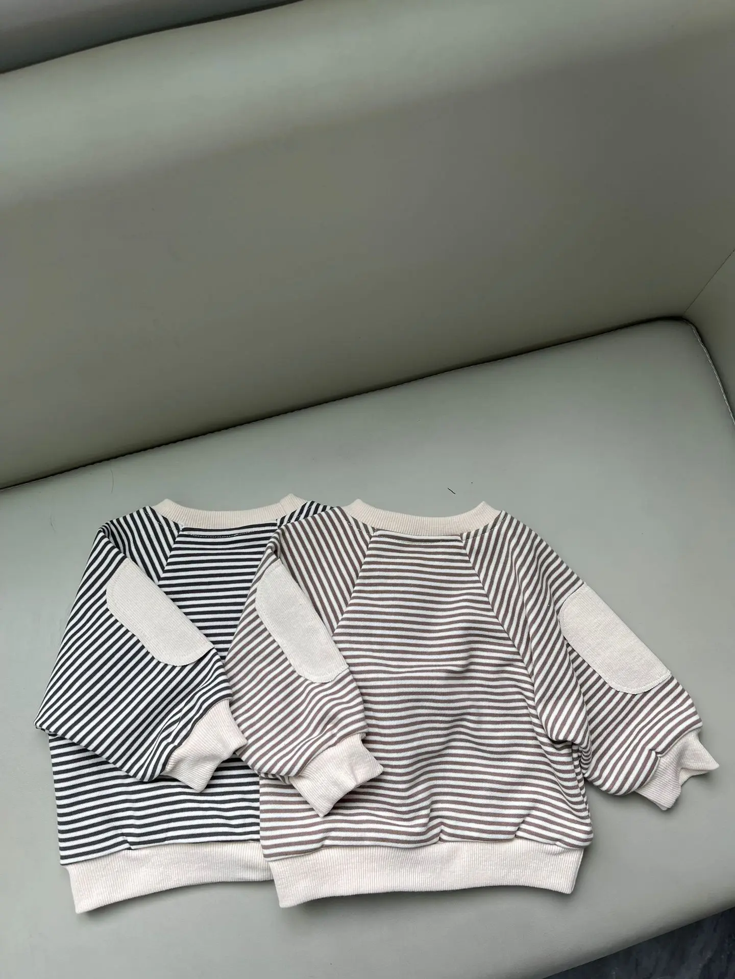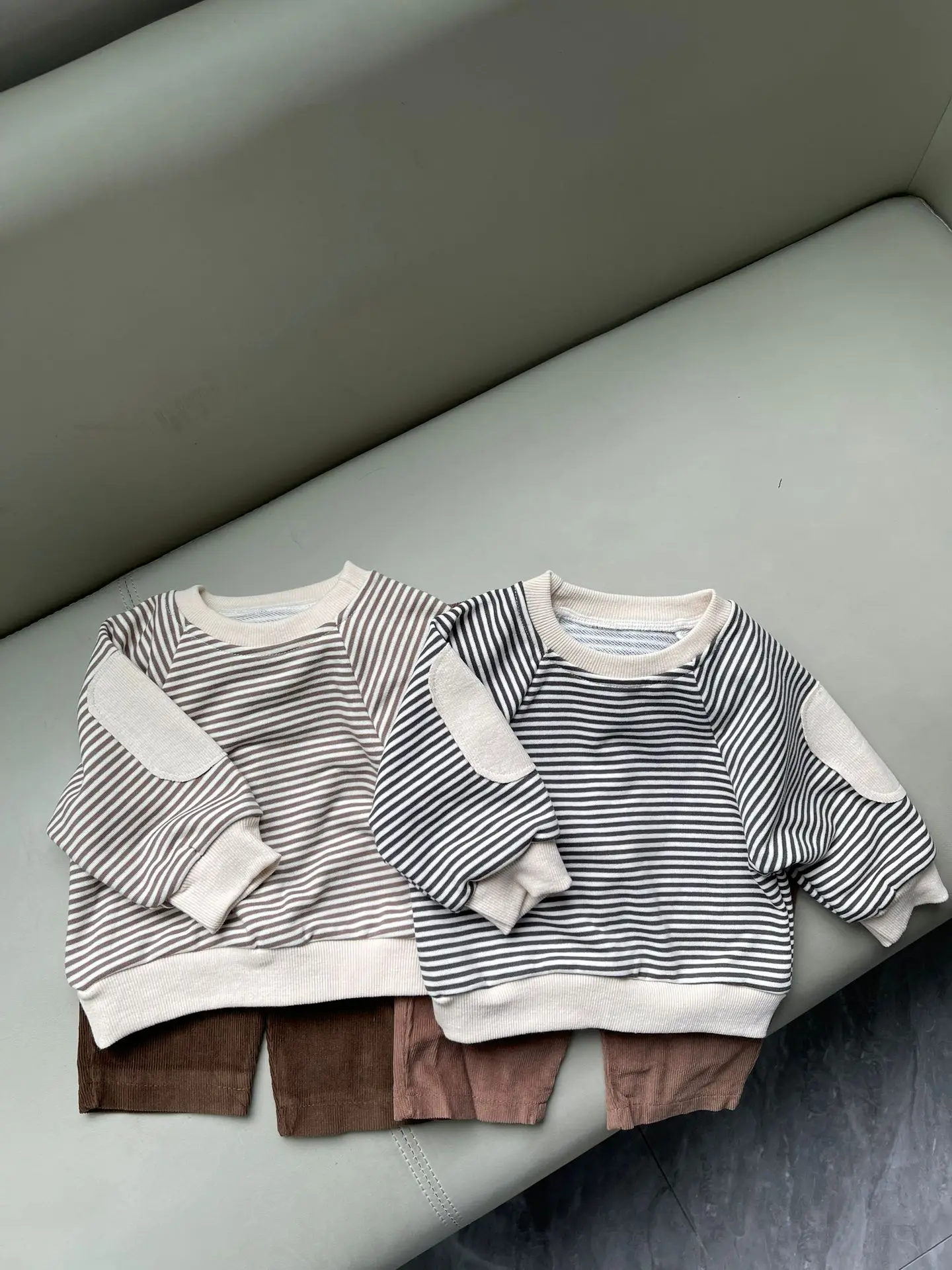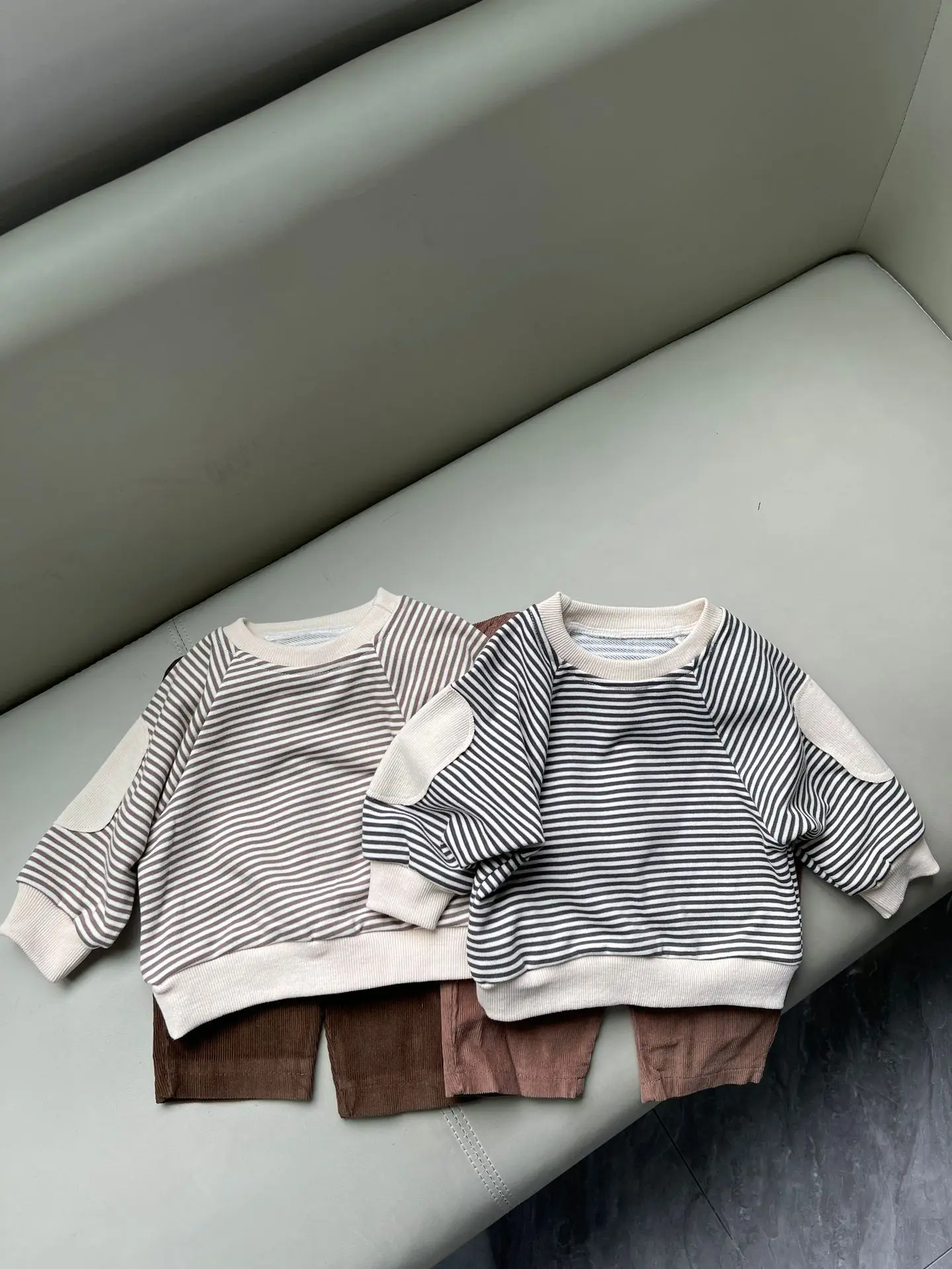 #ベビーファッション #ボーダーTシャツ #肘パッチ #長袖トップス #カジュアルスタイル #赤ちゃん用服 #韓国子供服