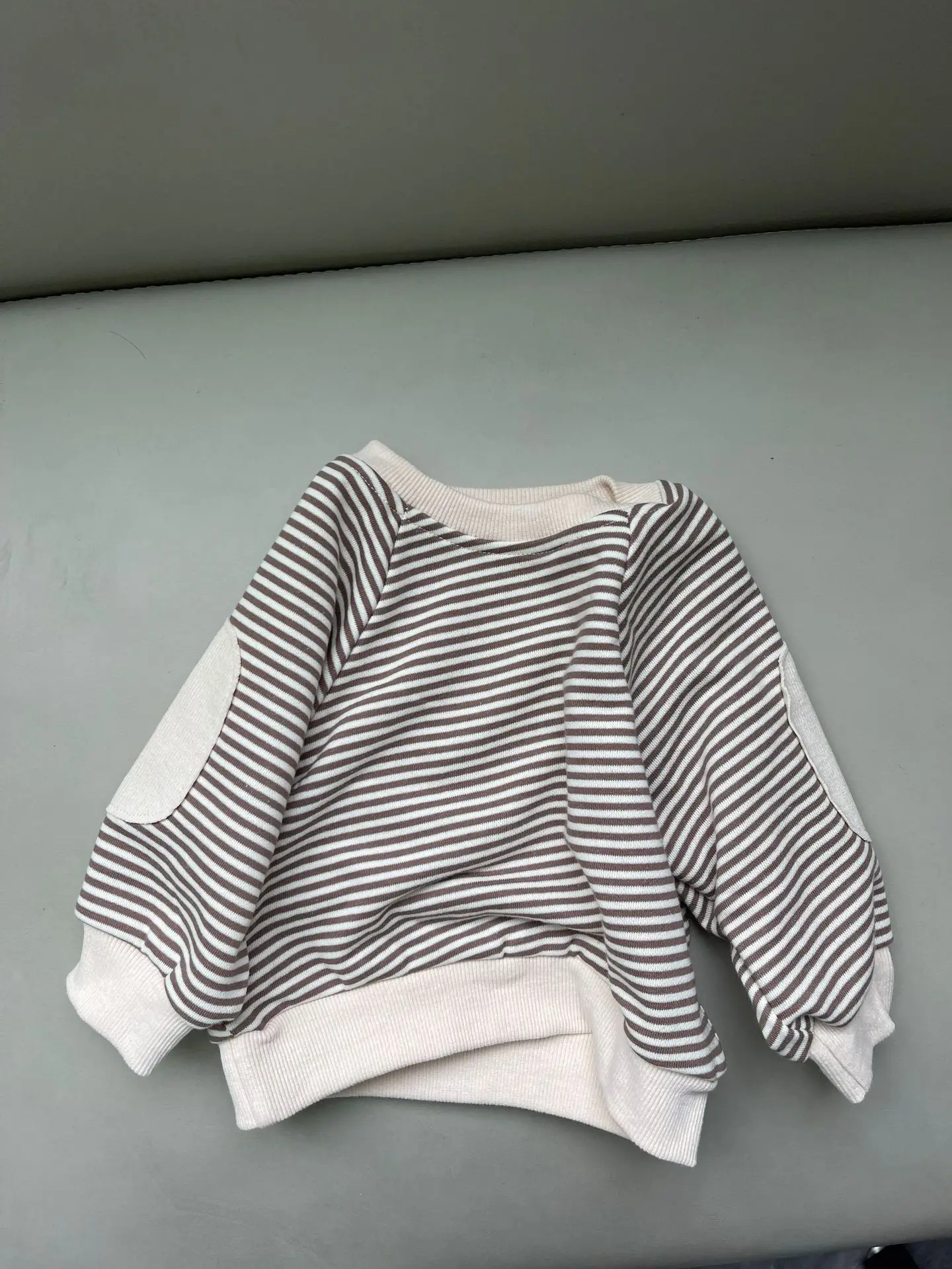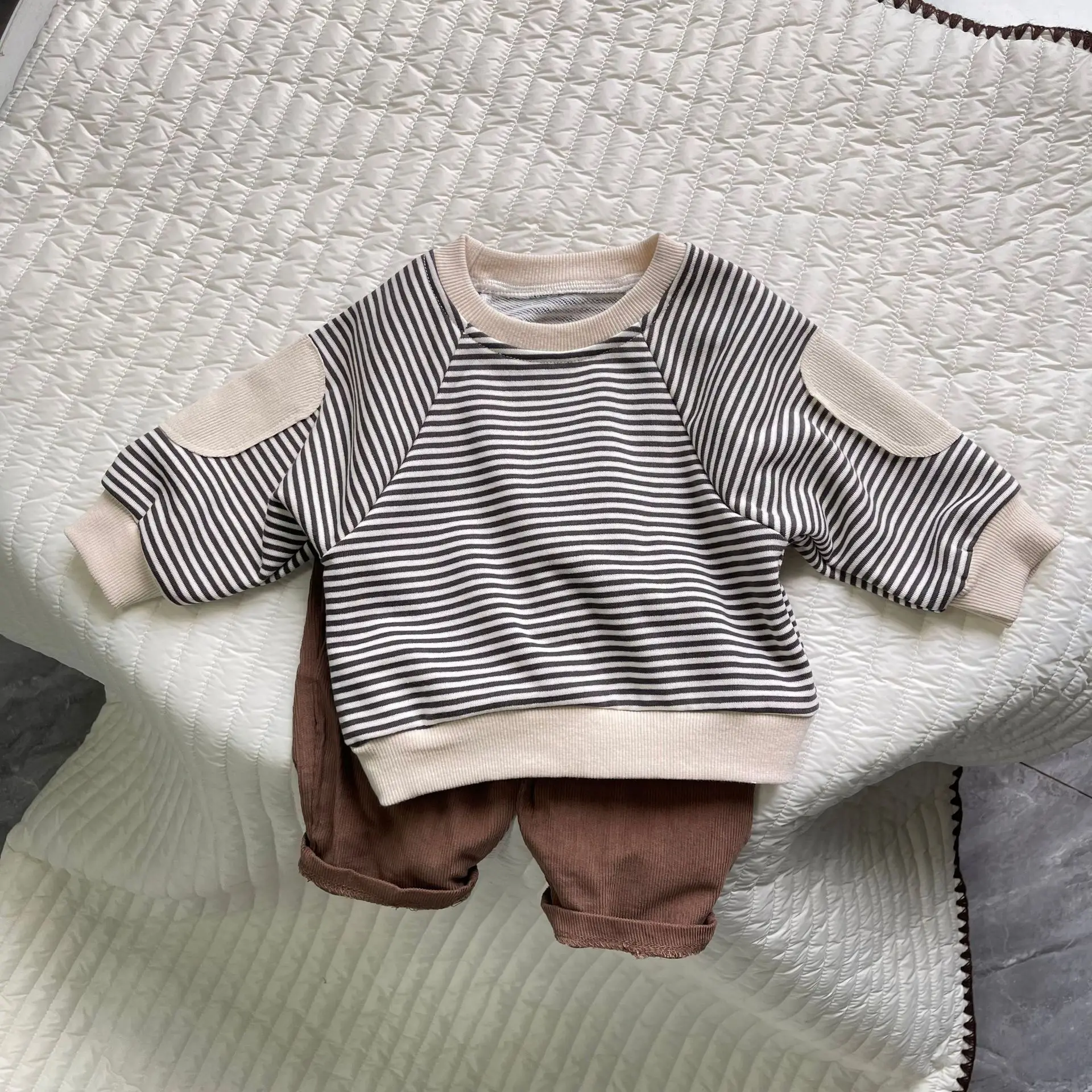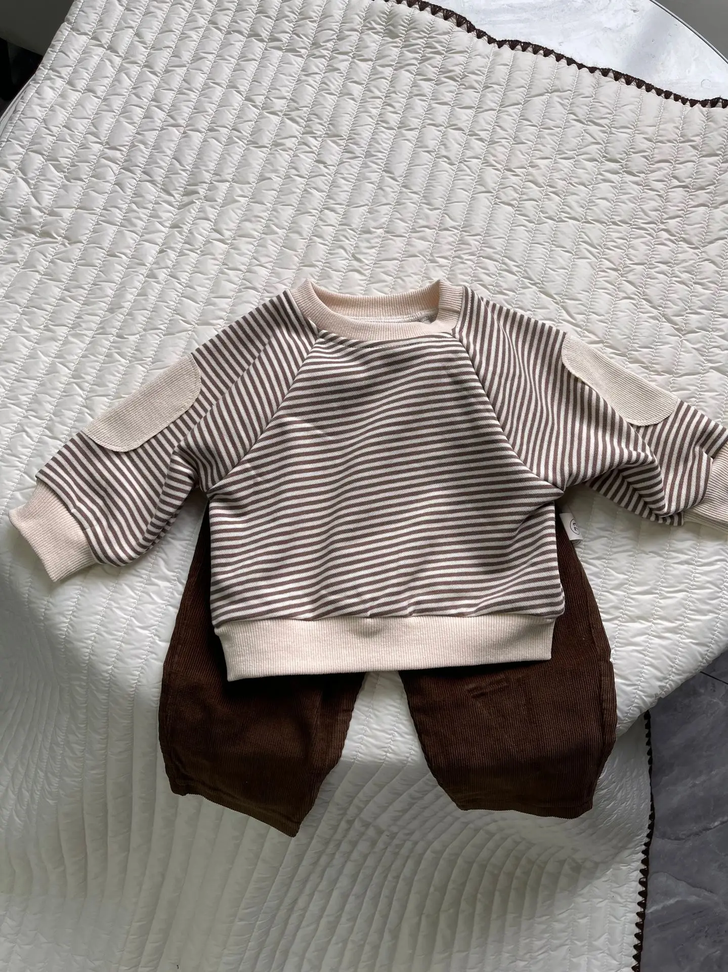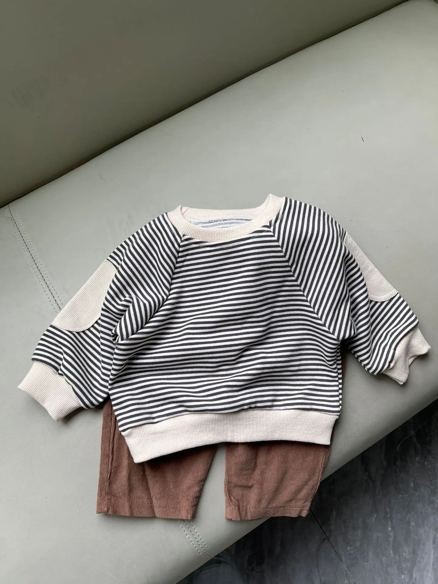 #ベビーファッション #ボーダーTシャツ #肘パッチ #長袖トップス #カジュアルスタイル #赤ちゃん用服 #韓国子供服