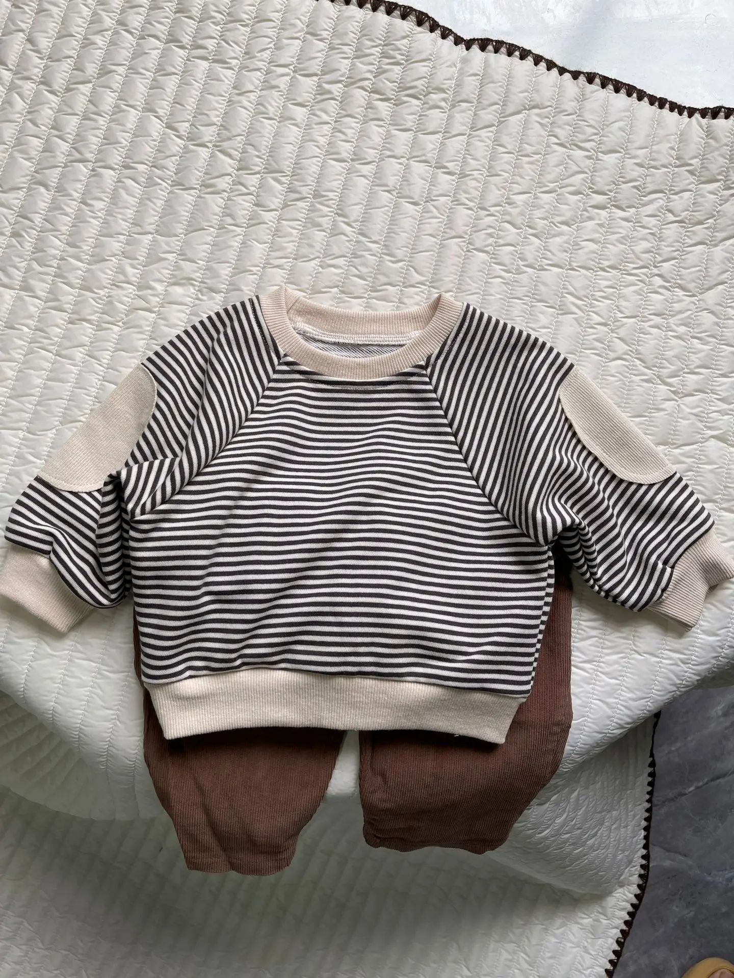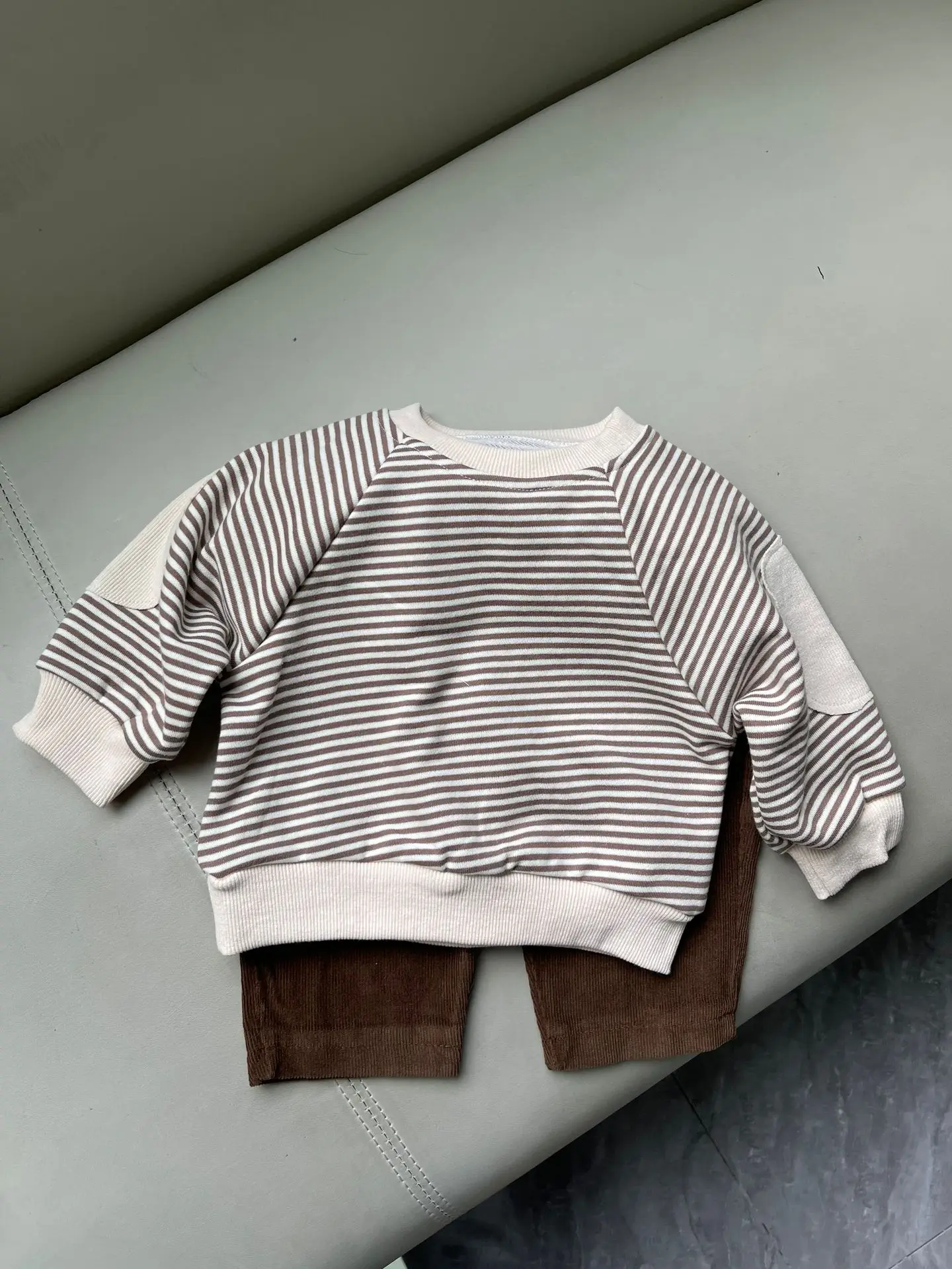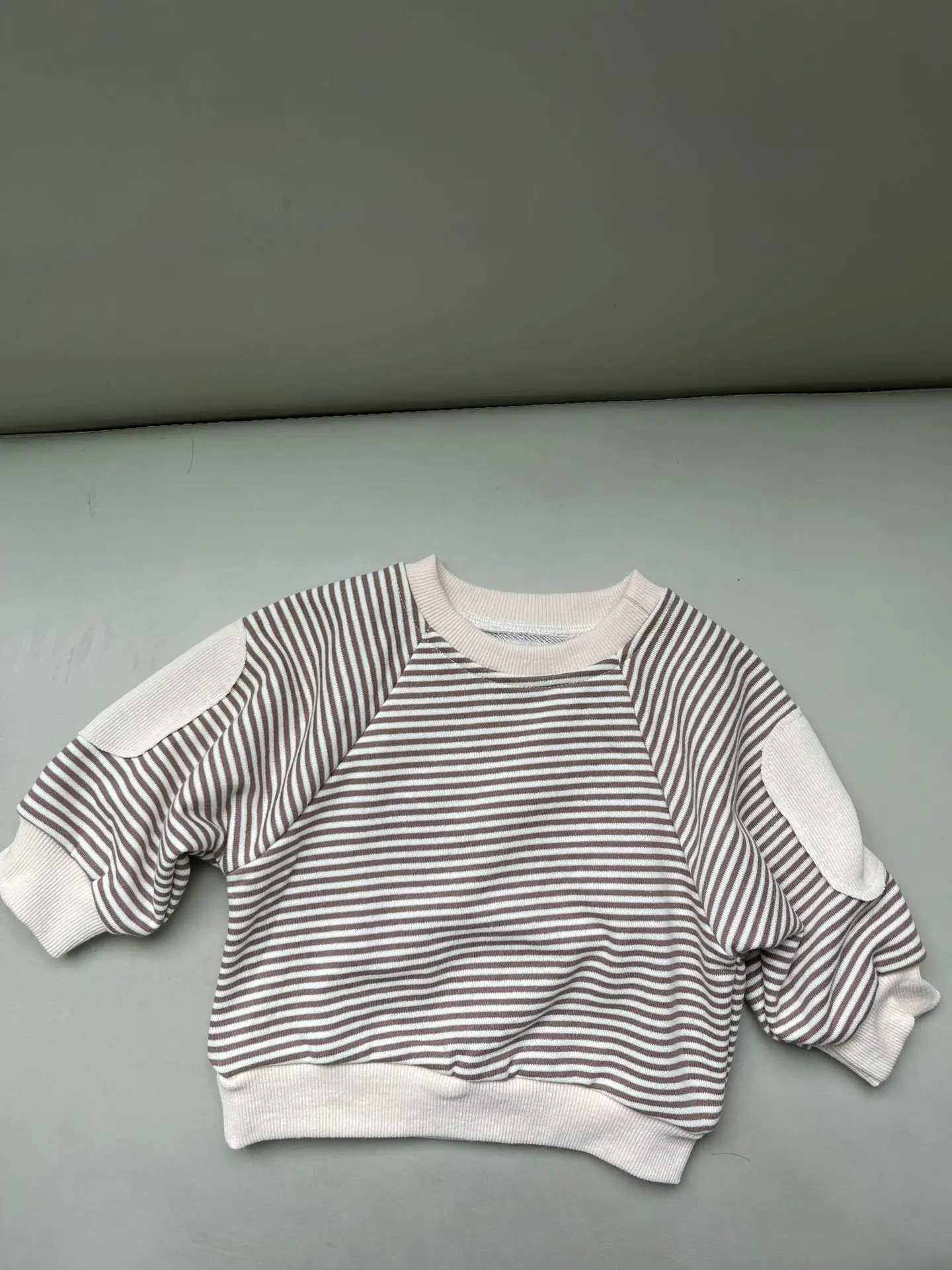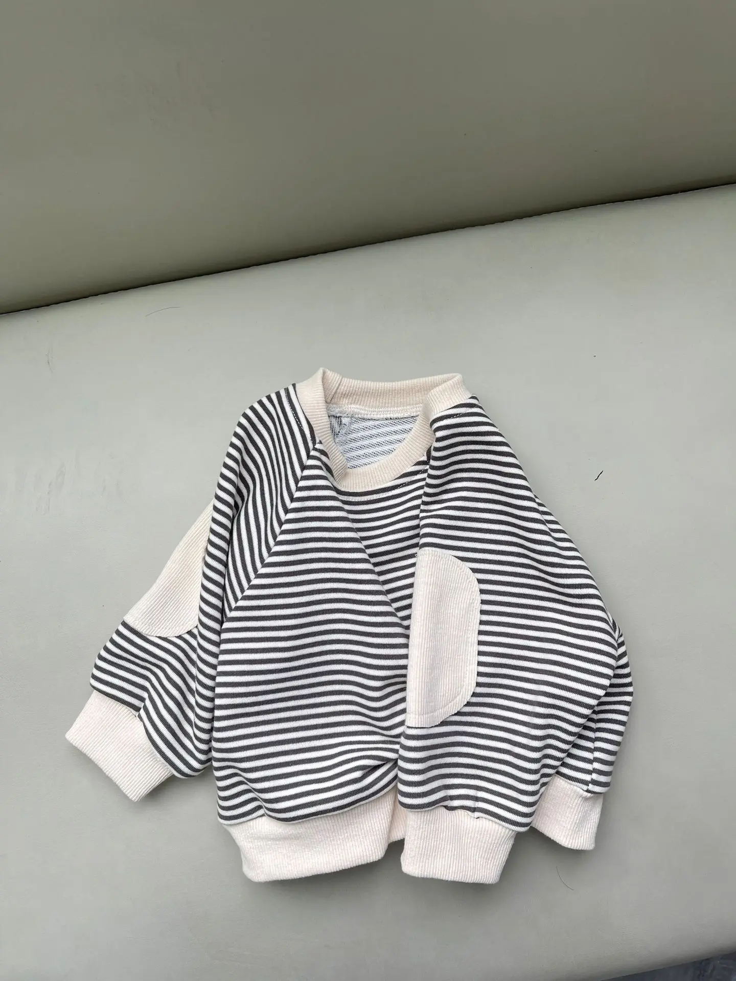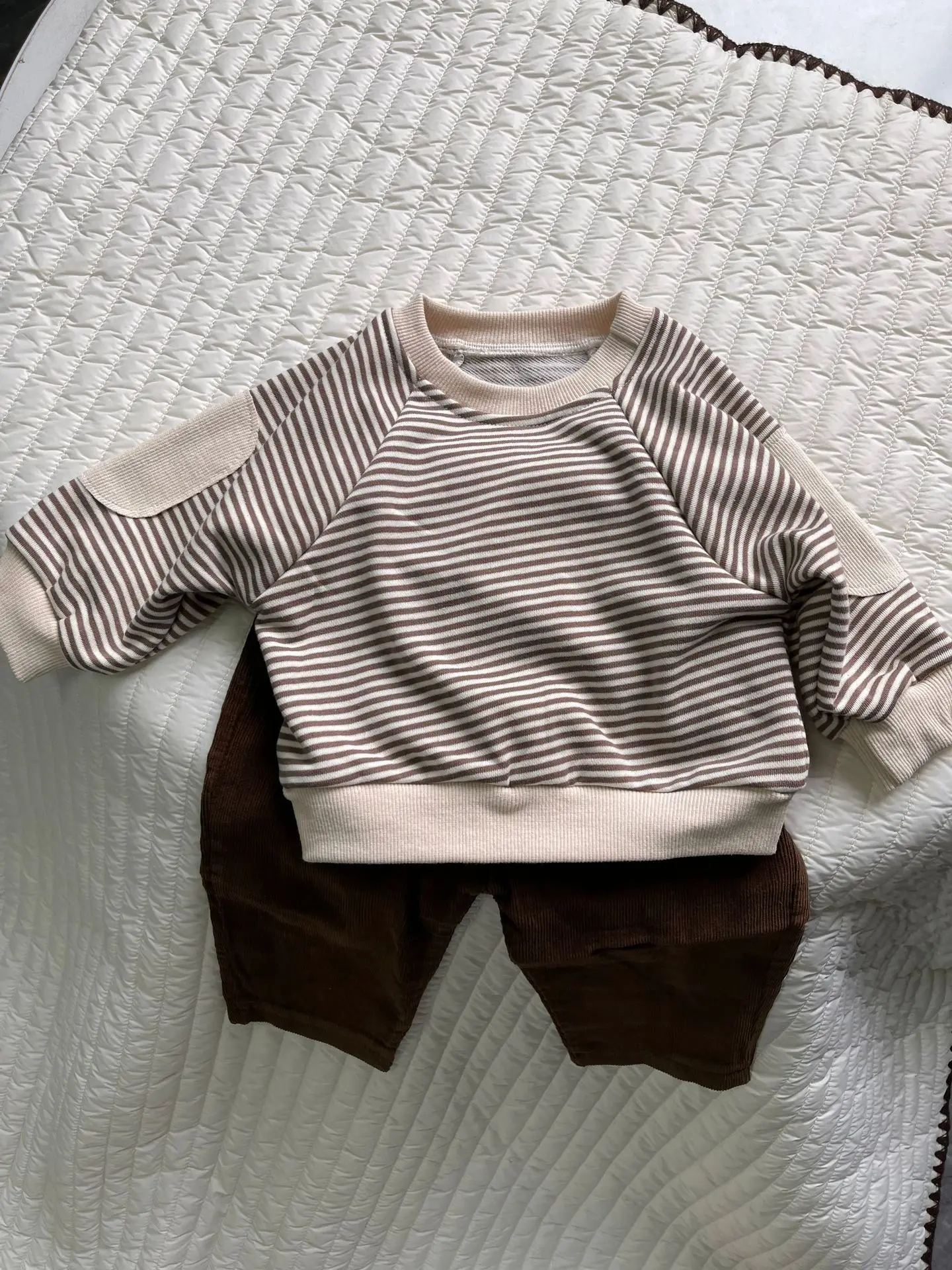 #ベビーファッション #ボーダーTシャツ #肘パッチ #長袖トップス #カジュアルスタイル #赤ちゃん用服 #韓国子供服