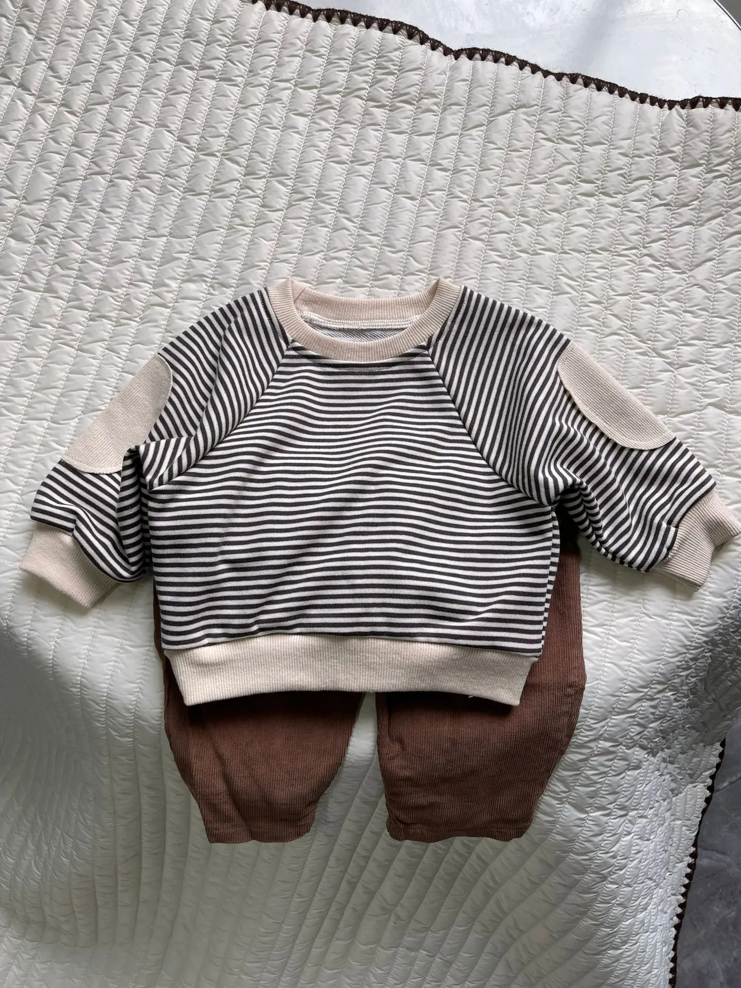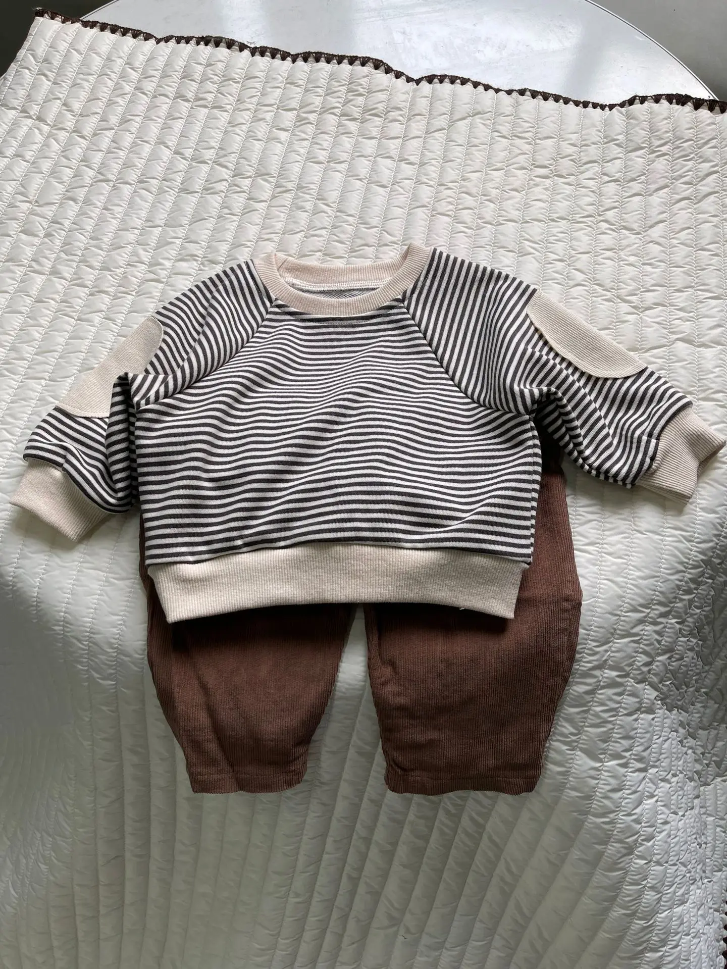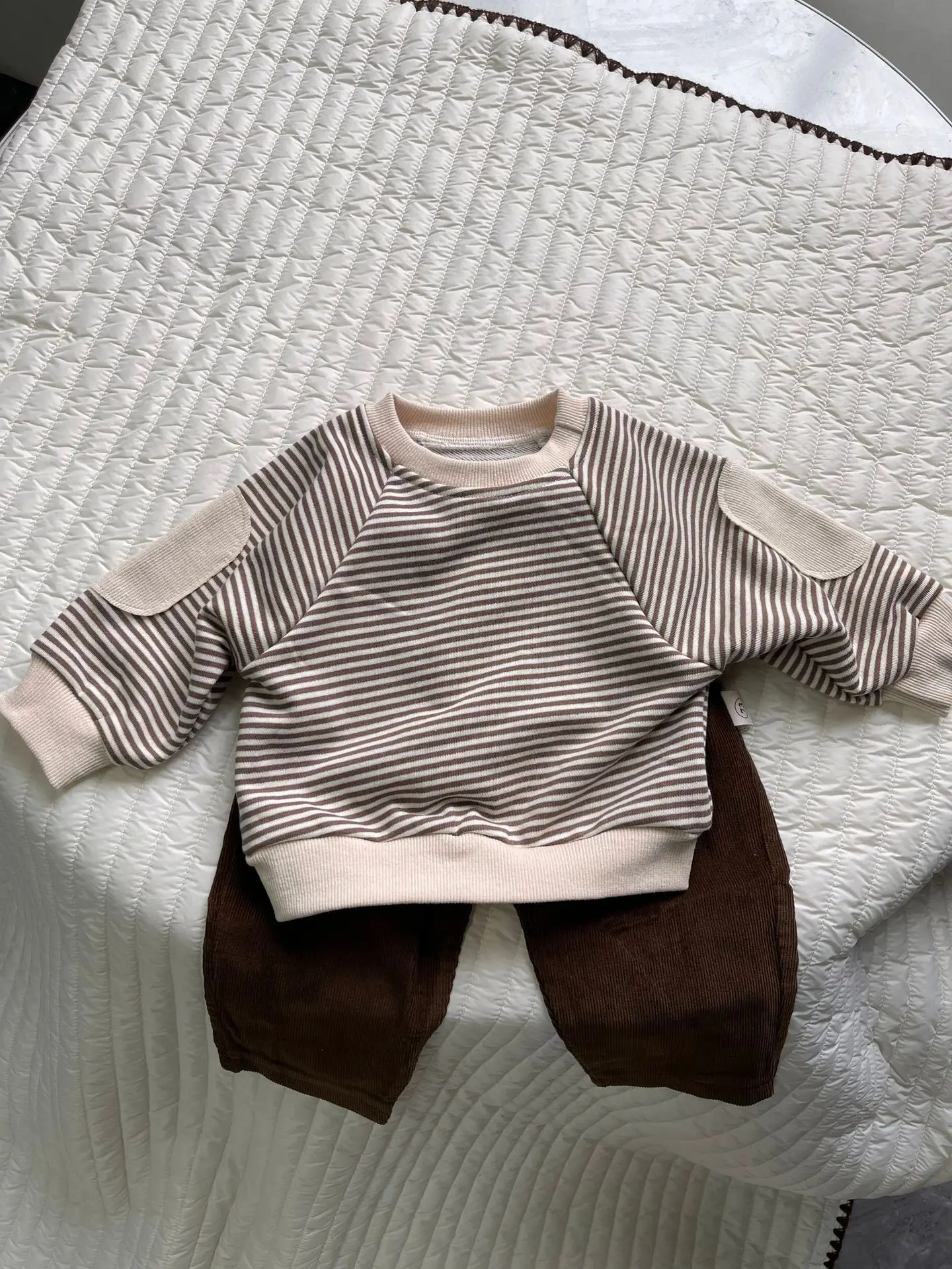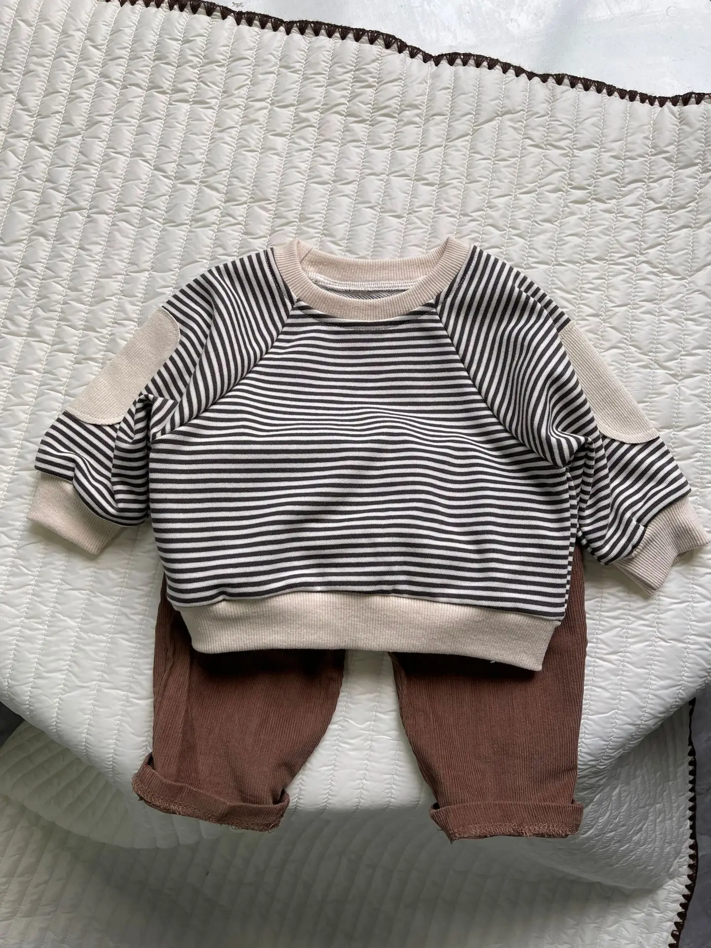 #ベビーファッション #ボーダーTシャツ #肘パッチ #長袖トップス #カジュアルスタイル #赤ちゃん用服 #韓国子供服