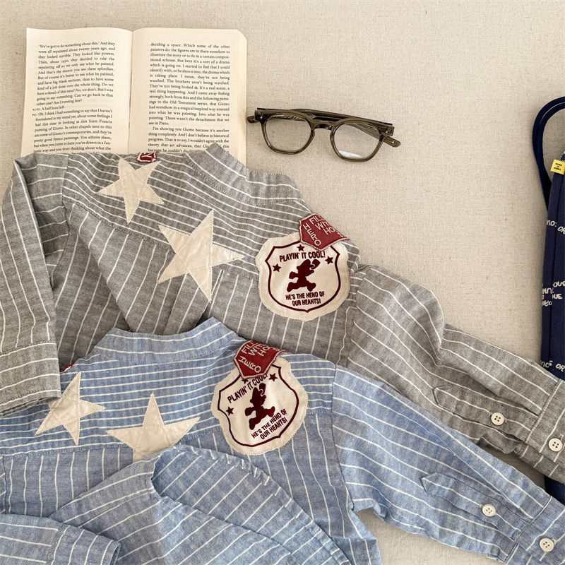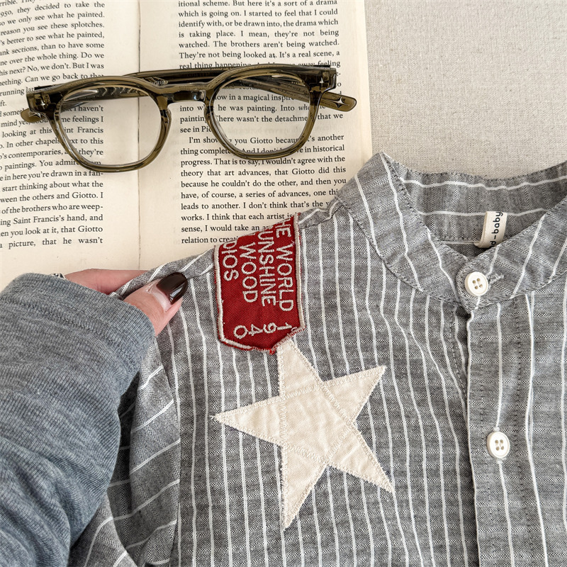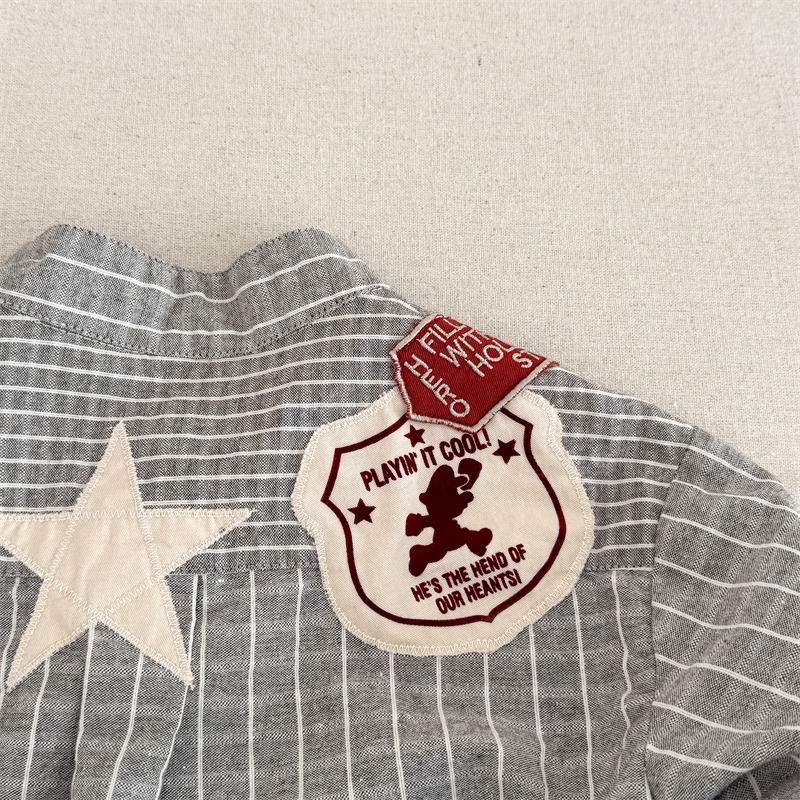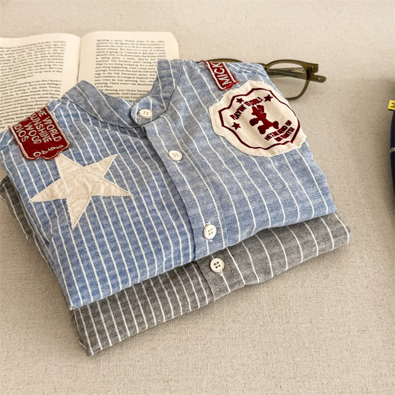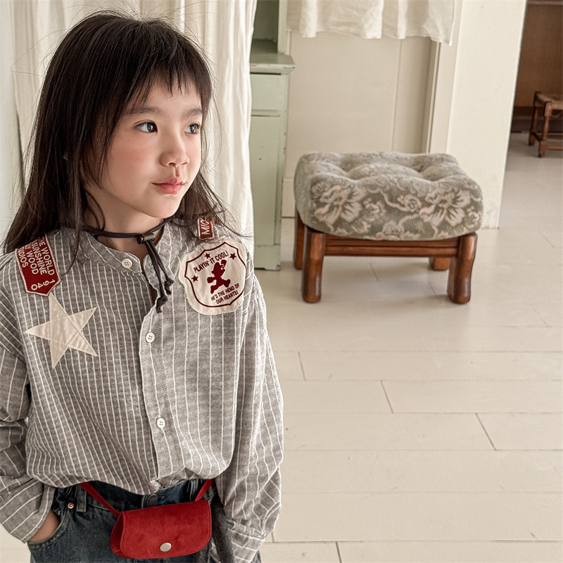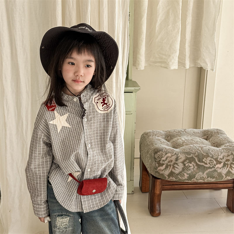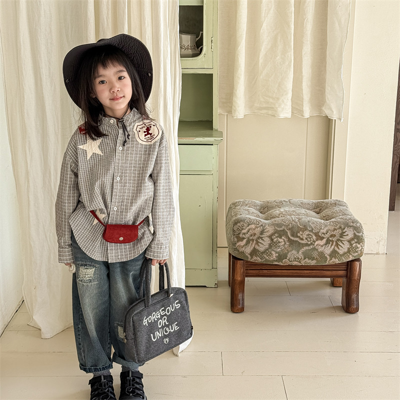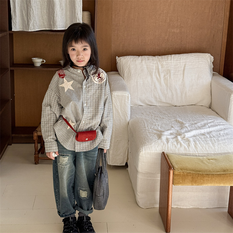 キッズトップス チェックノーカラーウェスタンパッチワーク長袖シャツ【mh0009016】