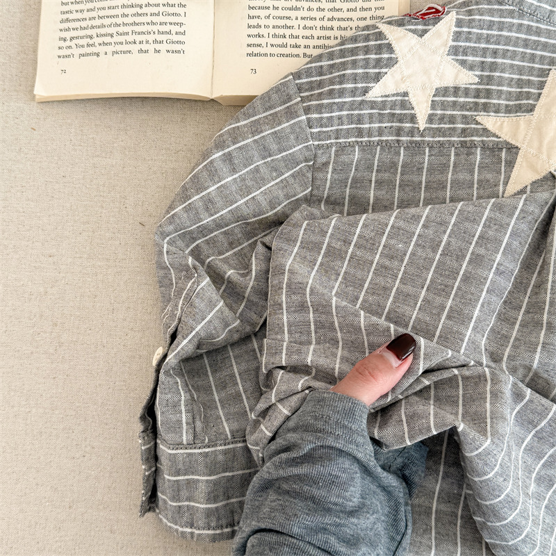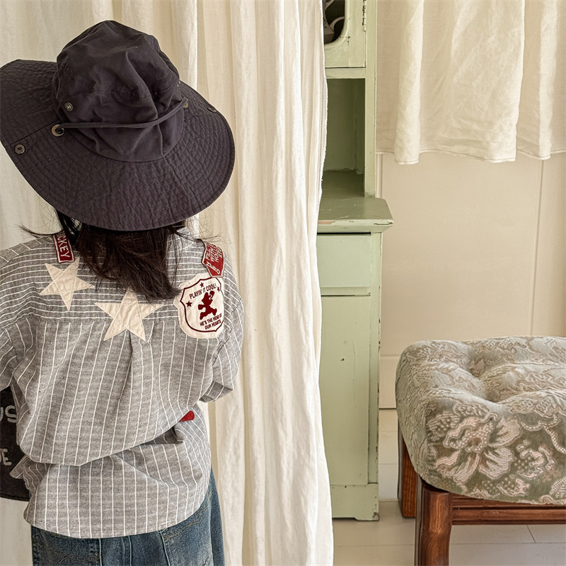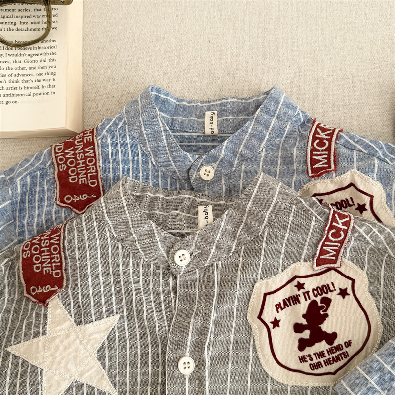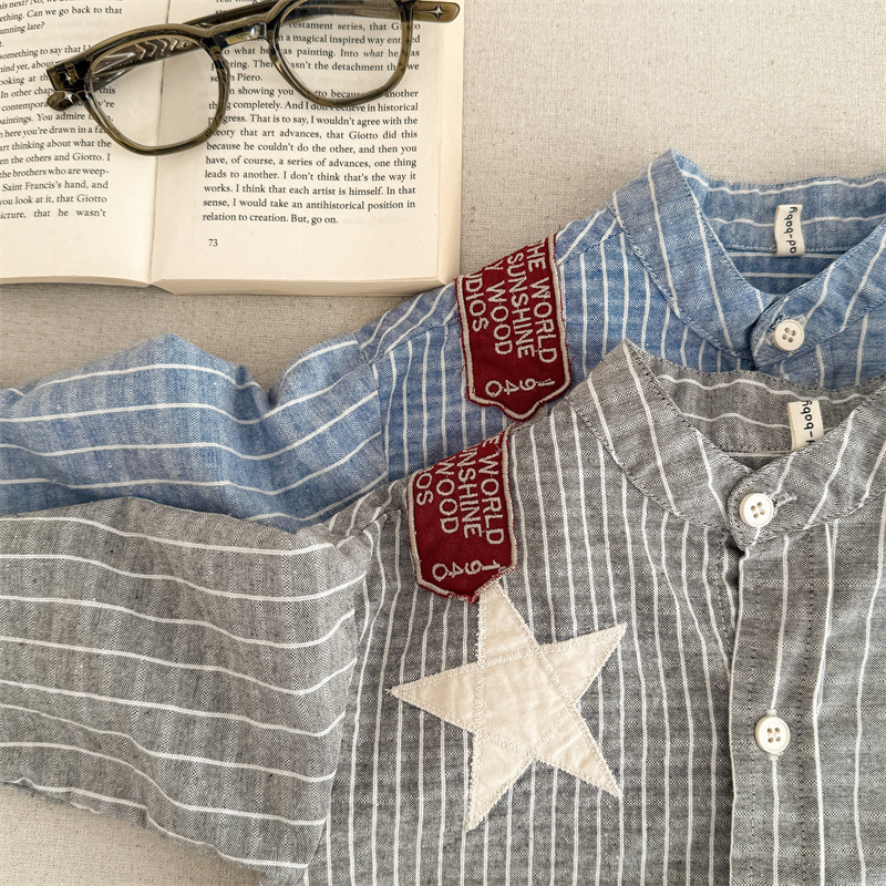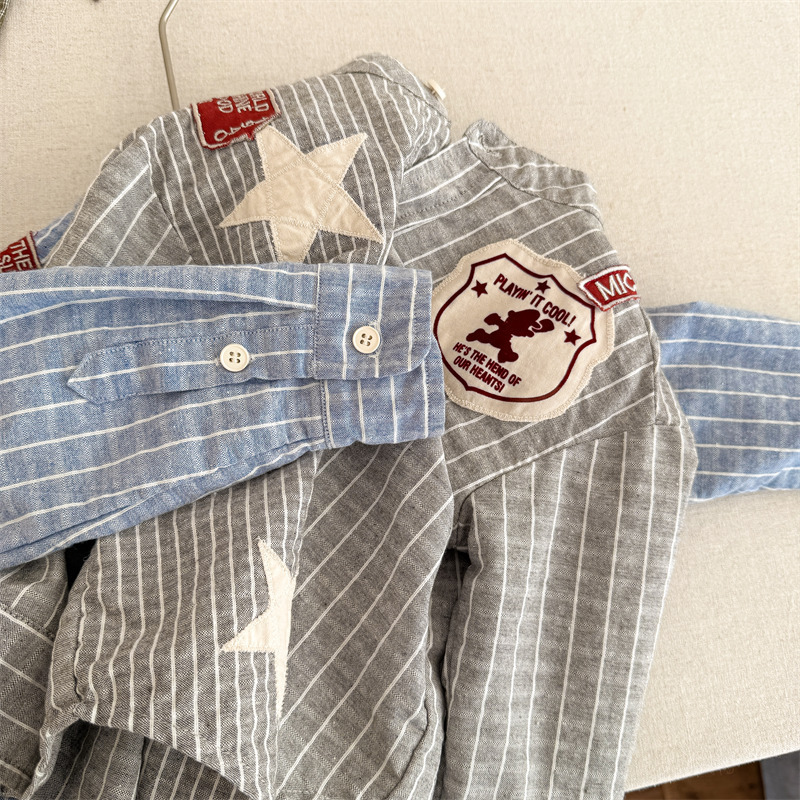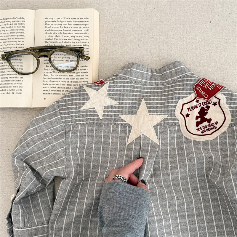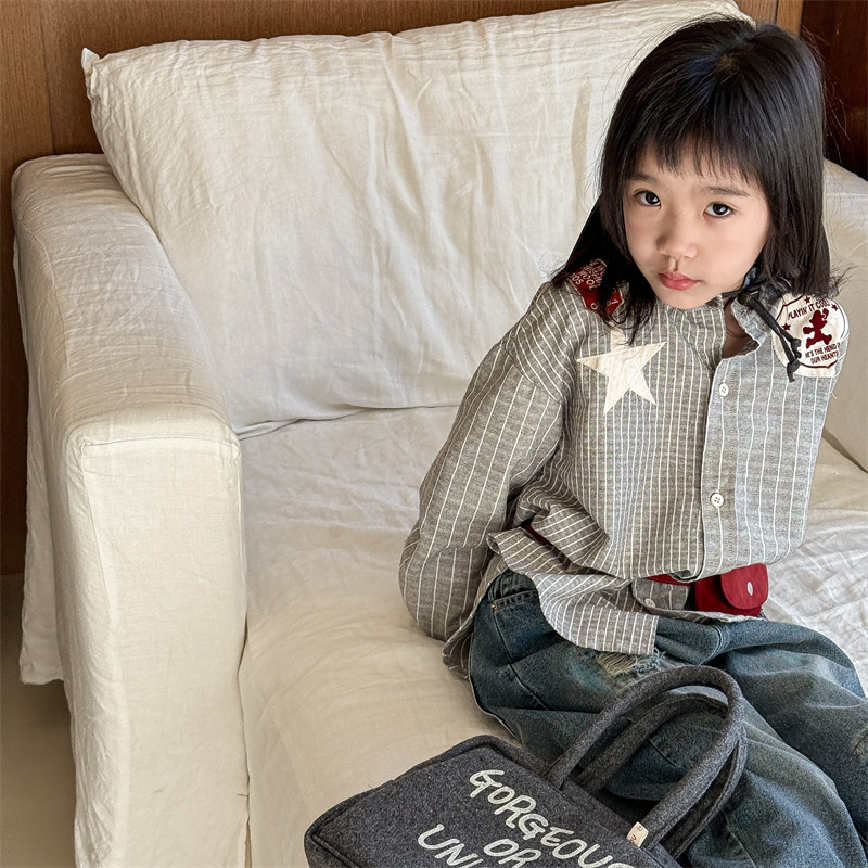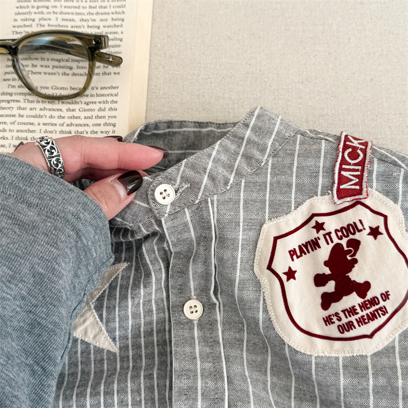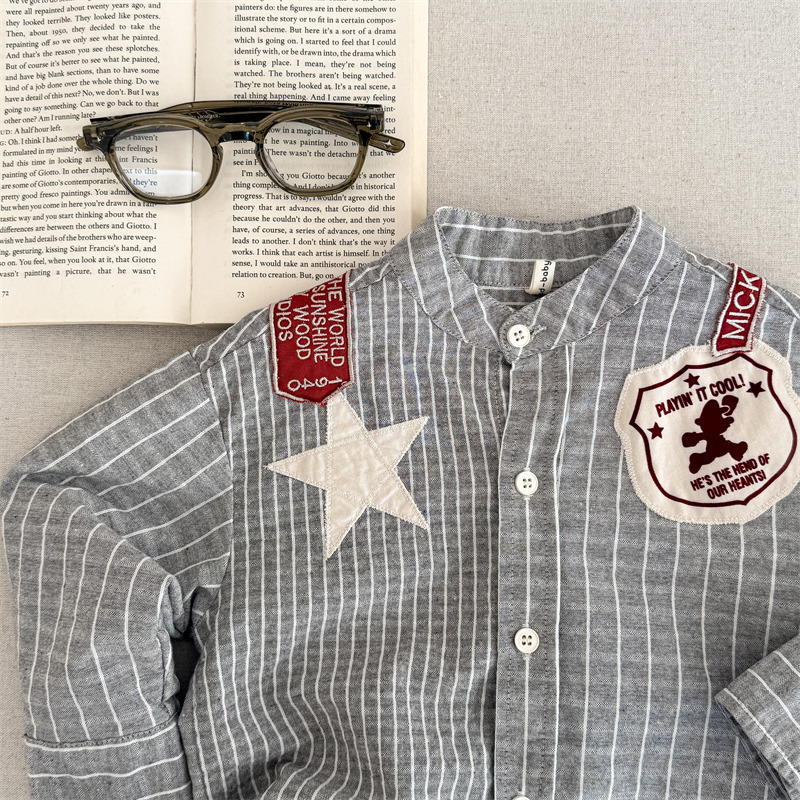 キッズトップス チェックノーカラーウェスタンパッチワーク長袖シャツ【mh0009016】