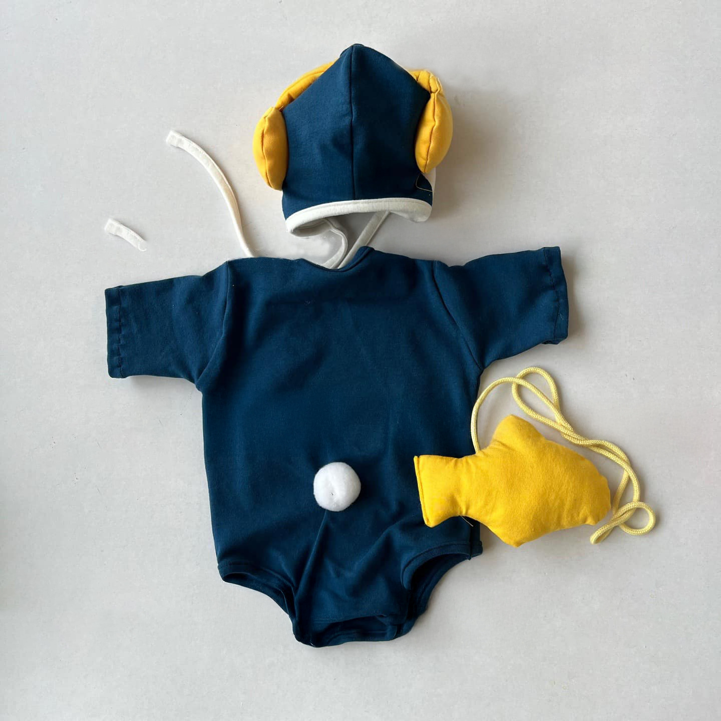 ペンギンをモチーフにした可愛らしい半袖ボディスーツ、帽子、お魚ポシェットの3点セット。ふんわりとしたシルエットと特徴的なカラーリングで、小さなペンギンになりきれるデザインです。柔らかな素材で快適な着心地を実現し、動きやすさも抜群。お魚モチーフのポシェットがアクセントになり、写真撮影やイベントにもぴったりです。