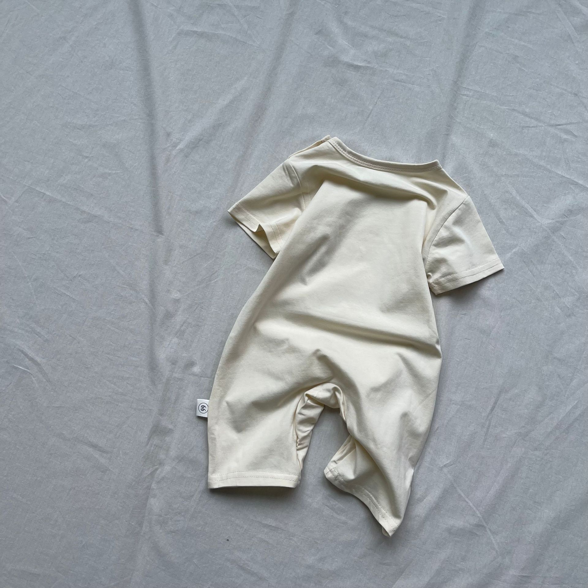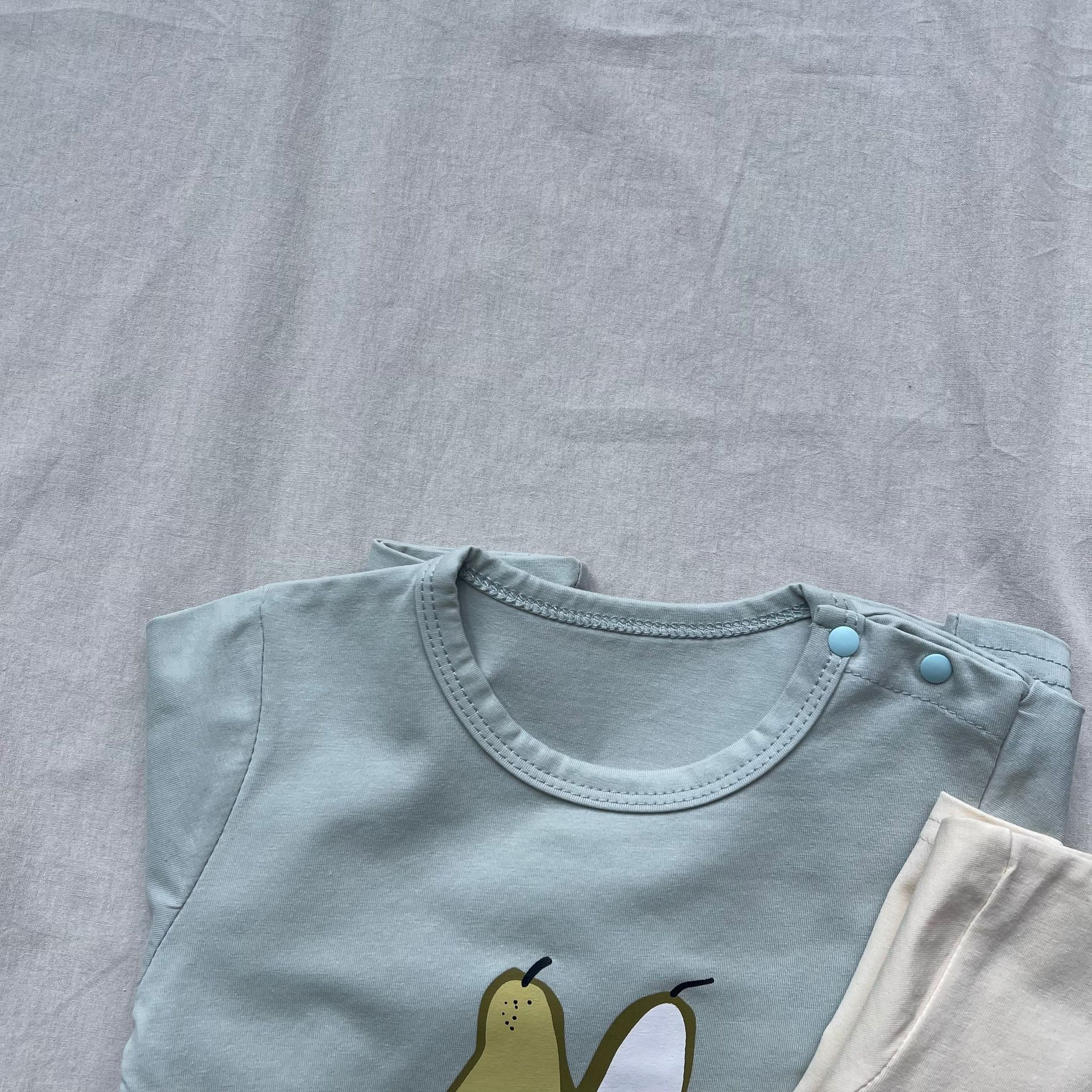 フルーツ柄が可愛らしい半袖ボディスーツです。梨やバナナのプリントが施され、ナチュラルで爽やかな雰囲気を演出します。柔らかなコットン素材を使用しており、赤ちゃんの肌に優しく、快適な着心地を提供。股部分はスナップボタン仕様で、おむつ替えもスムーズに行えます。シンプルながらも遊び心のあるデザインで、一枚でもインナーとしても活躍するアイテムです。暑い季節のお出かけやお部屋着としてもぴったりの一着です。