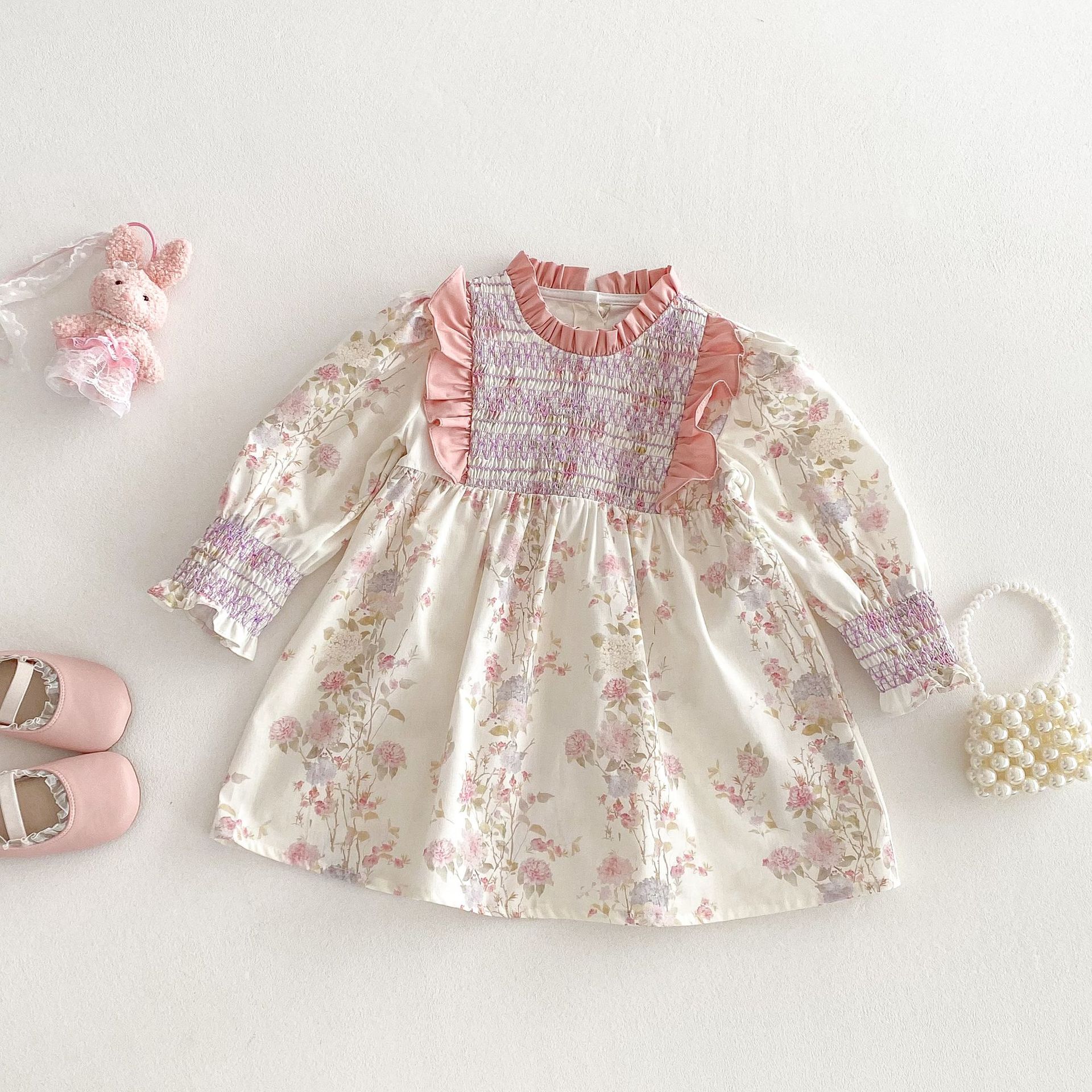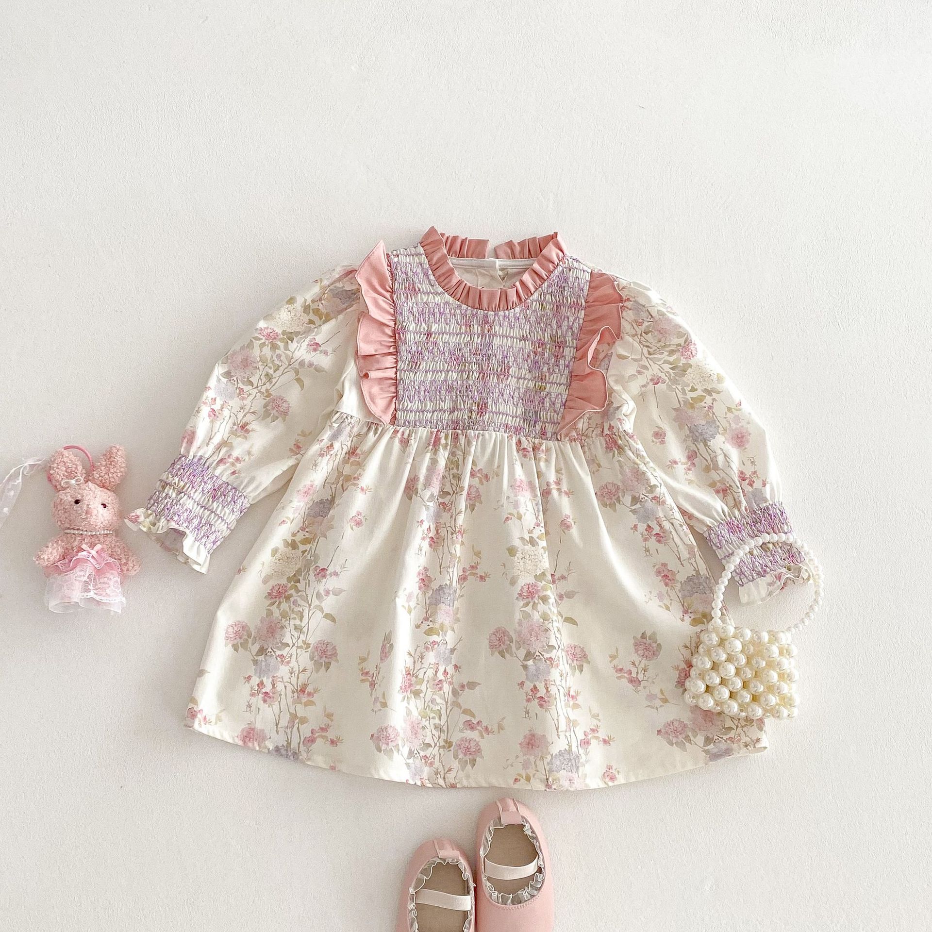 シャーリングフリルフラワープリント長袖ワンピース【mh0009240】