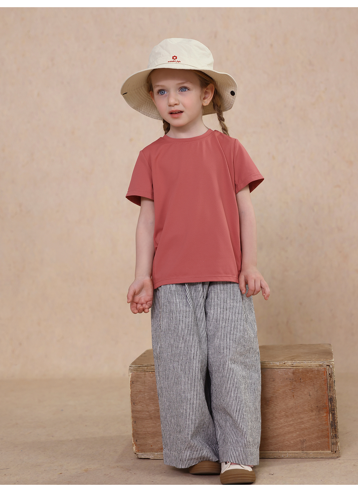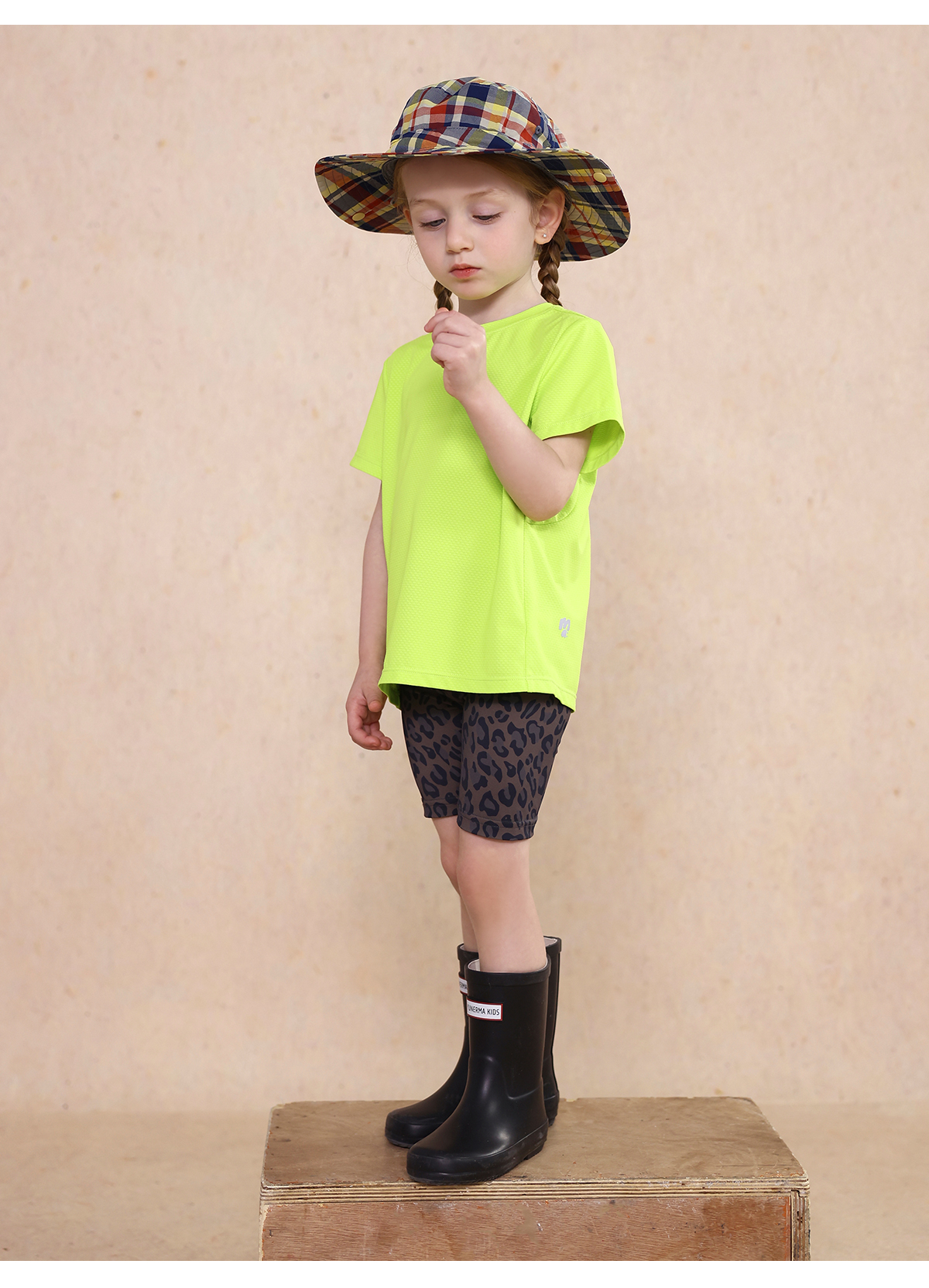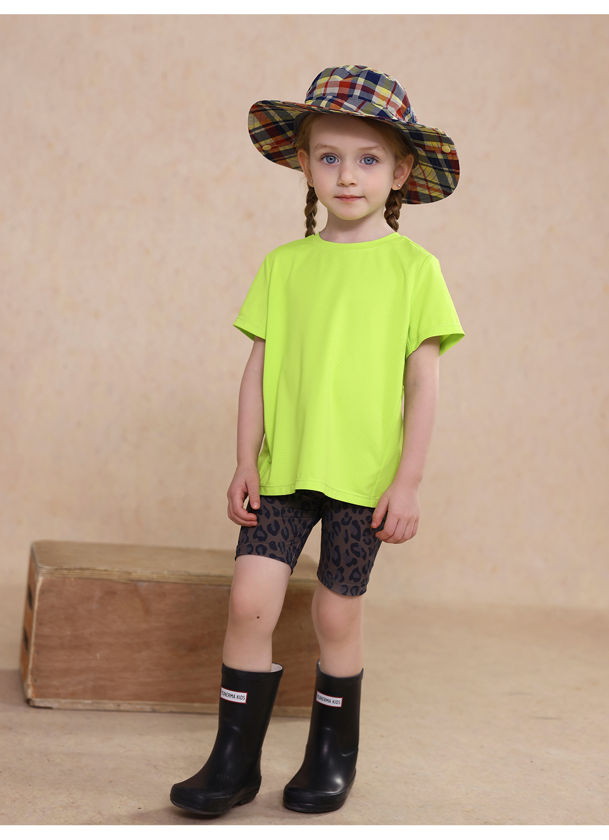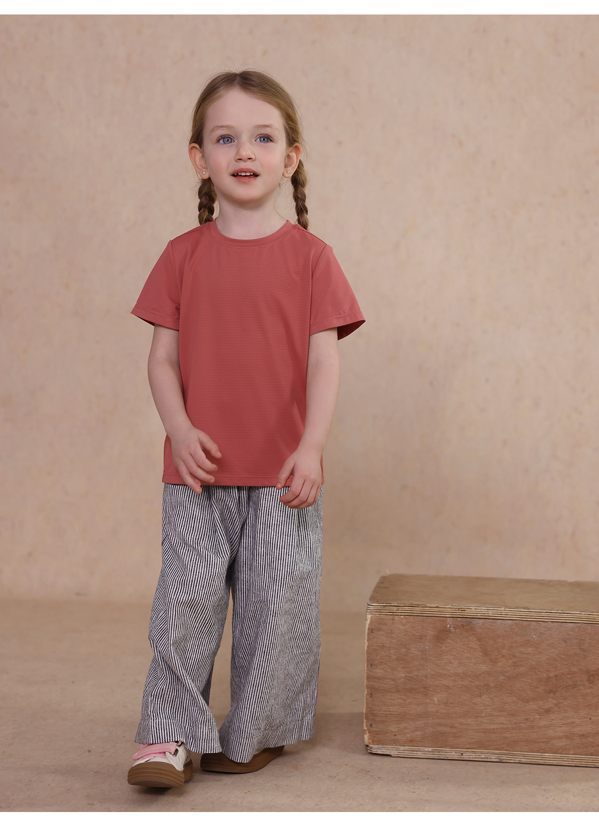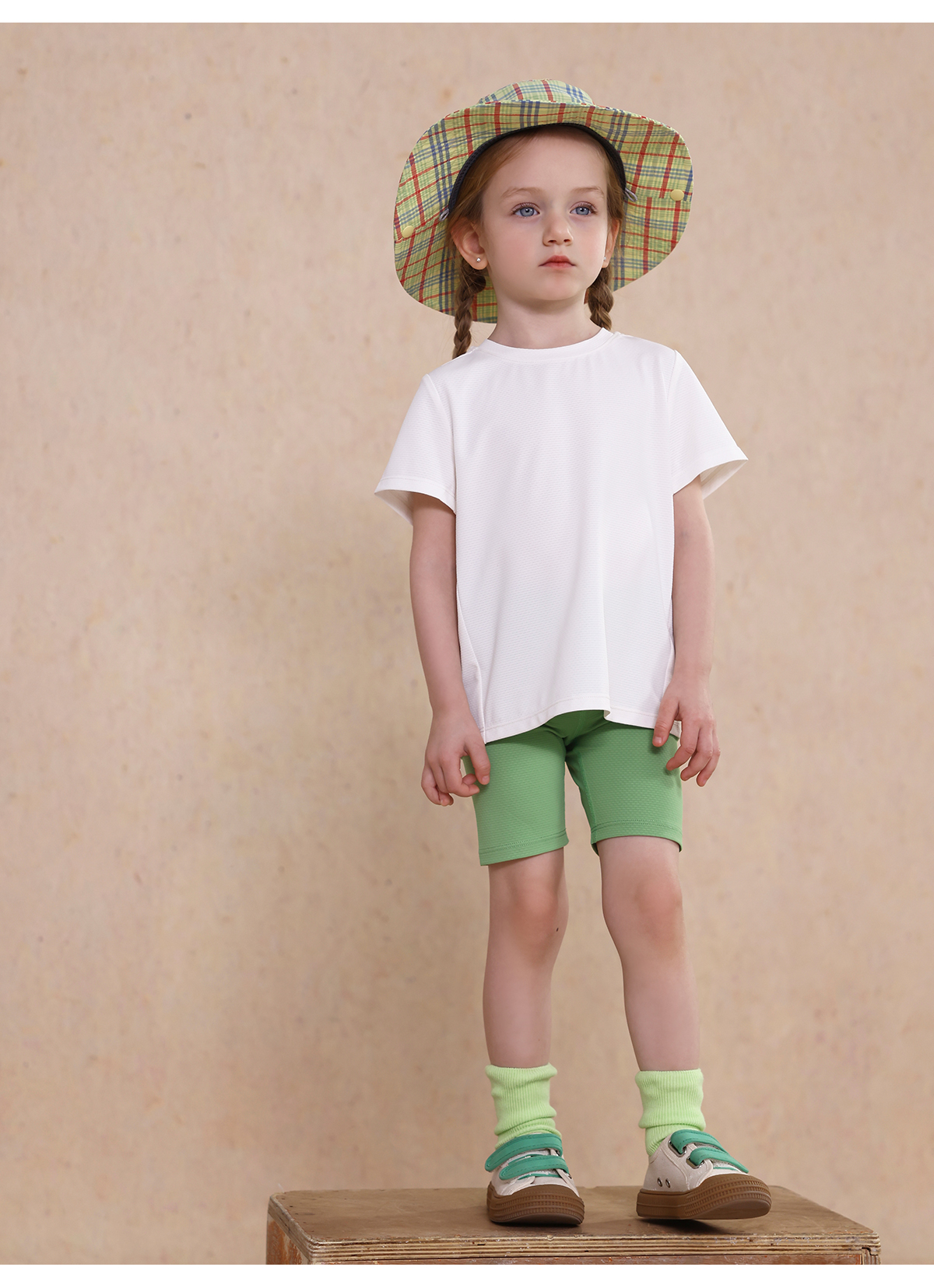 通気性と軽さを兼ね備えた、女の子向けの夏用サンスクリーンTシャツです。UPF50+の紫外線カット効果で、外遊びやお出かけ時のUV対策にしっかり対応。速乾性のあるメッシュ風素材は汗ばむ季節でも快適な着心地を保ち、さらりとした肌触りが特徴です。デザインは海外テイストを取り入れた洗練された印象で、シンプルながらコーディネートのアクセントにもなる一枚です。