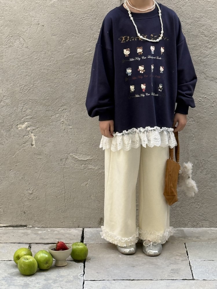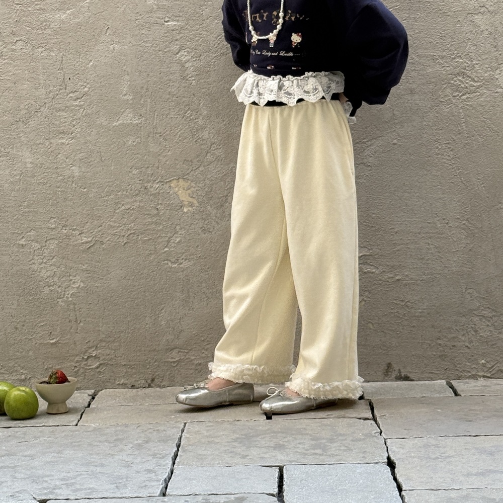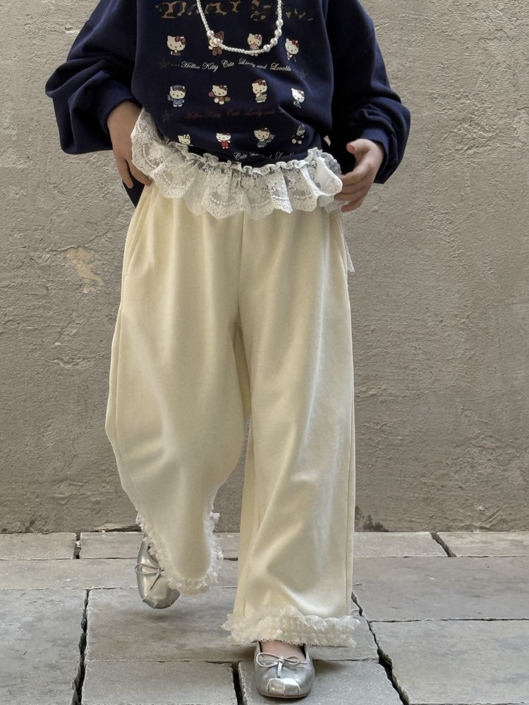裾にあしらわれた繊細なレースフリルが、さりげない可愛らしさをプラスするキッズ用ワイドルーズパンツです。春らしい軽やかな素材を使用し、ゆったりとしたワイドシルエットで、動きやすく快適な穿き心地。ベーシックなストレートレッグのデザインなので、様々なトップスと合わせやすく、着回し力も抜群です。普段使いにはもちろん、ちょっとしたお出かけにもおすすめです。シンプルながらもガーリーな要素を取り入れた、おしゃれな一枚です。
