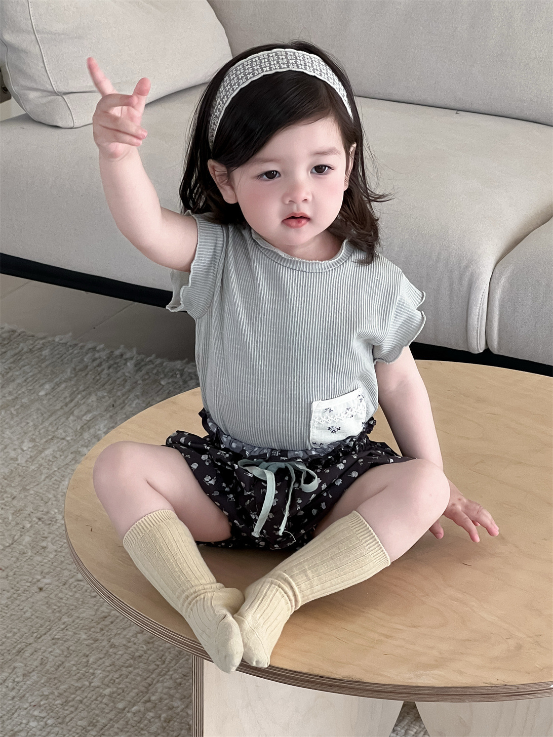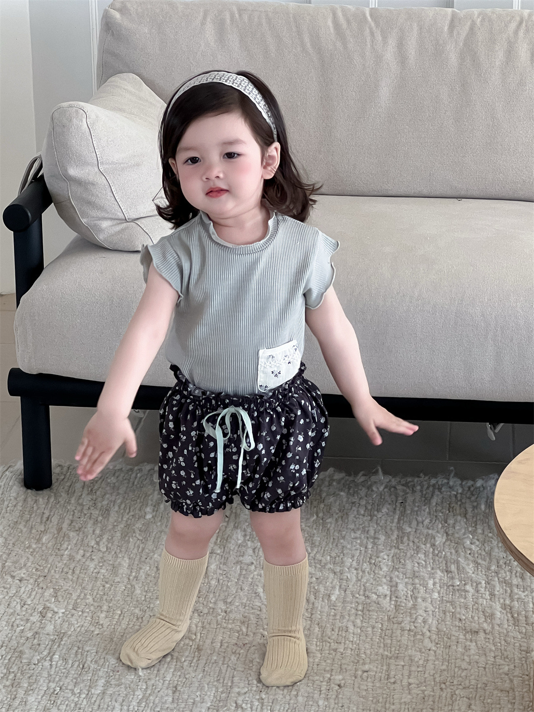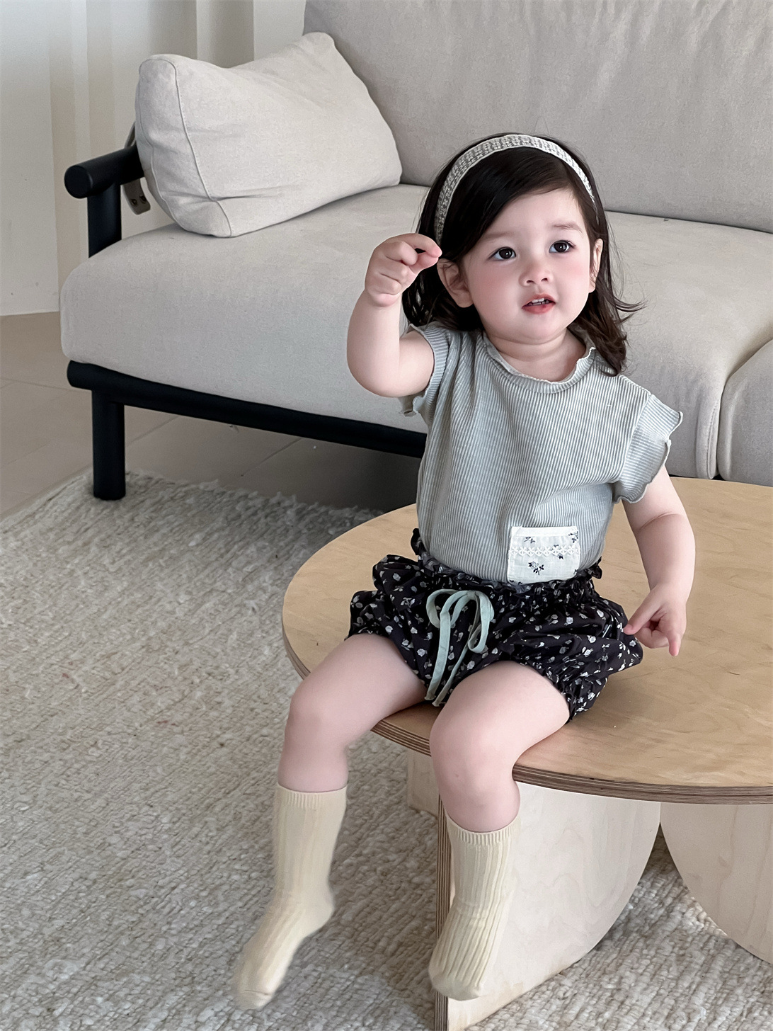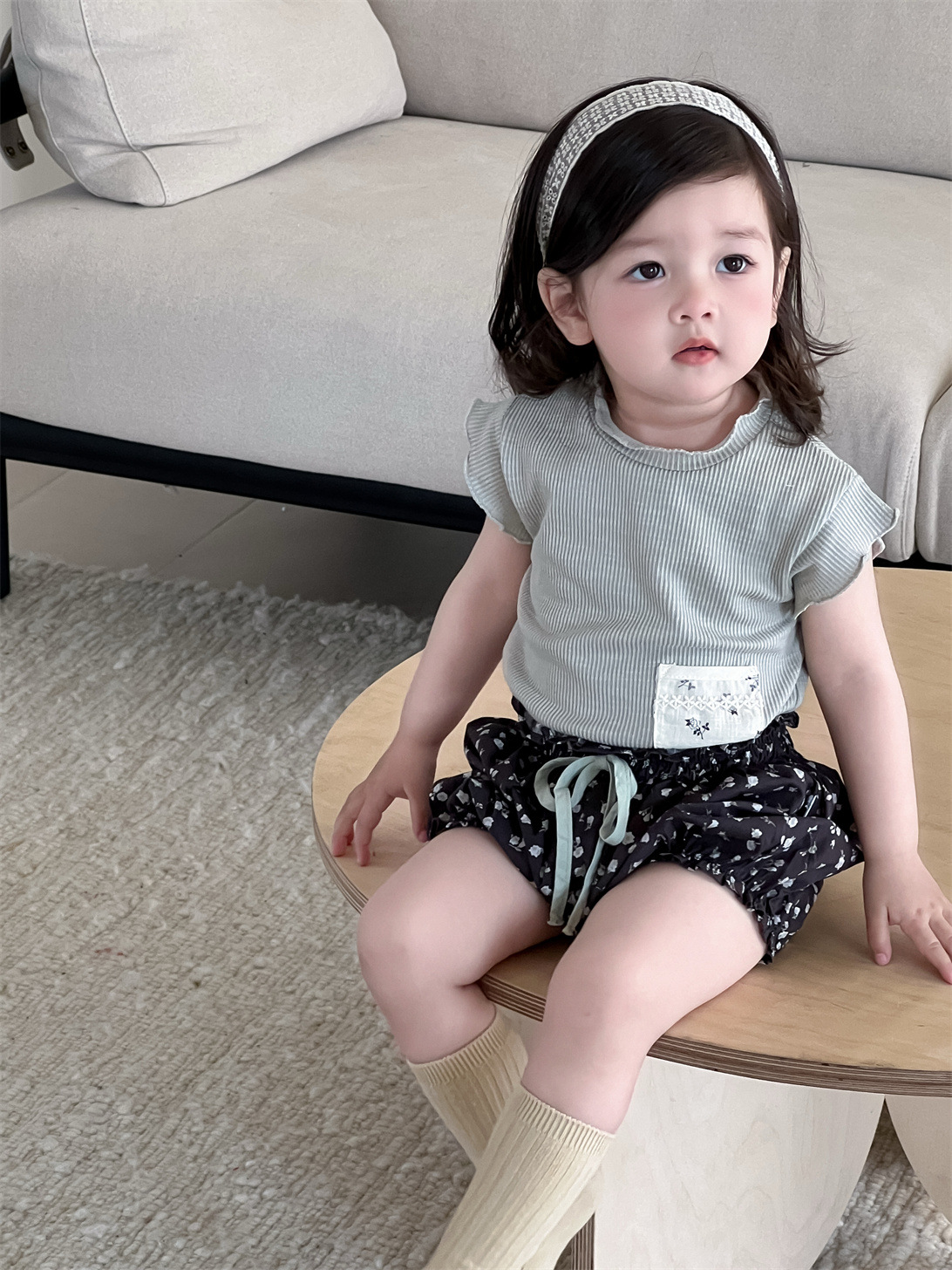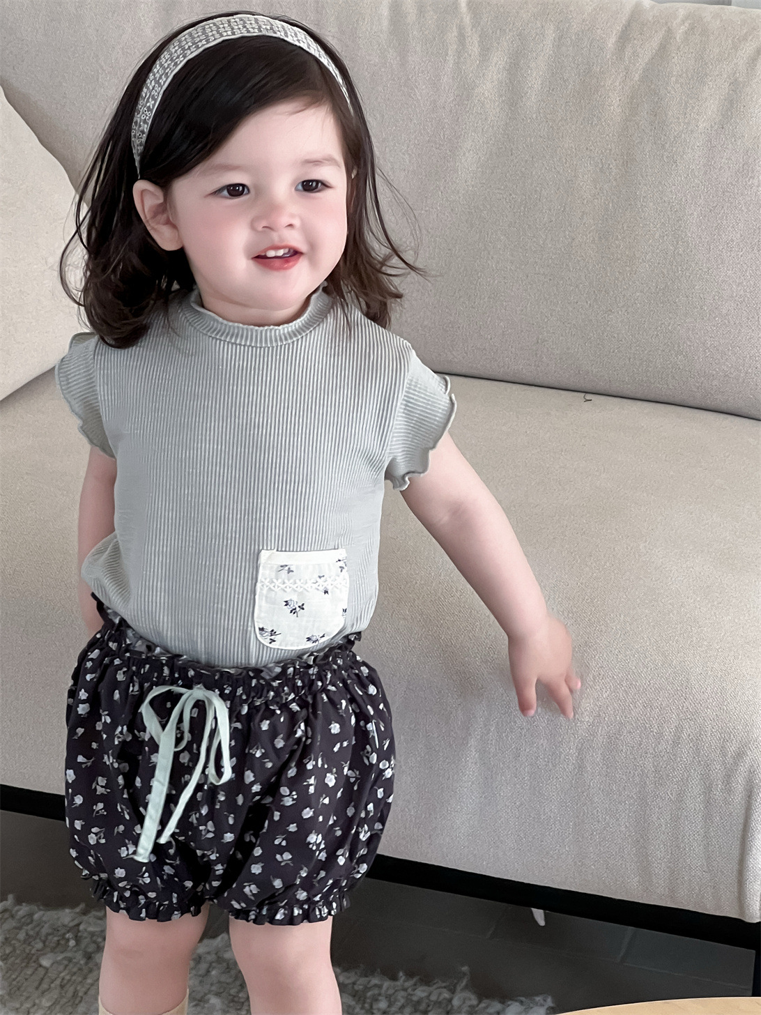 ポケットパッチワーク半袖Tシャツとフラワープリントバルーンショートパンツのセットアップです。半袖Tシャツはポケットのパッチワークデザインが特徴で、ショートパンツは可愛らしいフラワープリントとバルーンシルエットが魅力です。