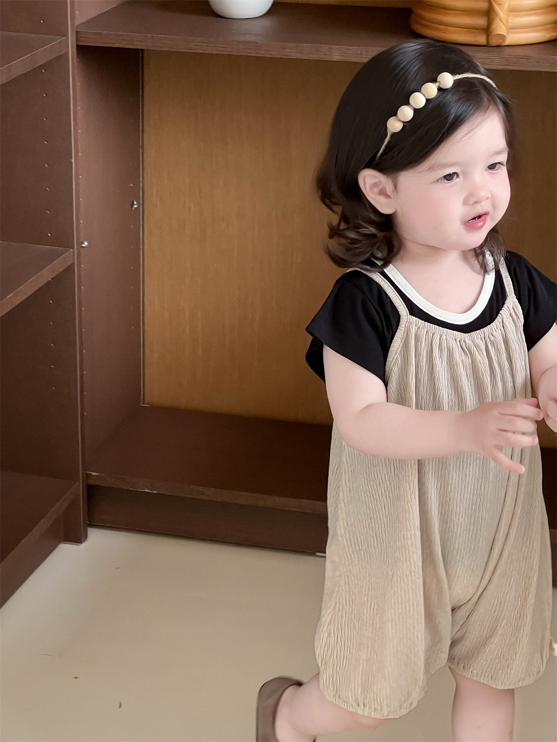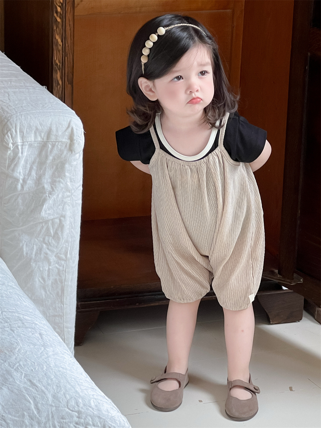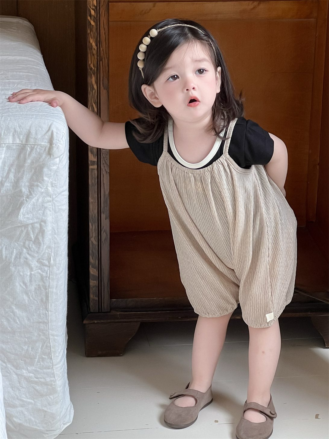 パイピングがアクセントの半袖Tシャツと、シンプルなキャミソールジャンプスーツのセットアップです。涼しく快適な薄手素材で、お子様の動きを妨げないゆったりとしたシルエットが特徴です。単独でも重ね着でも楽しめ、お子様の日常に彩りを添える一着です。