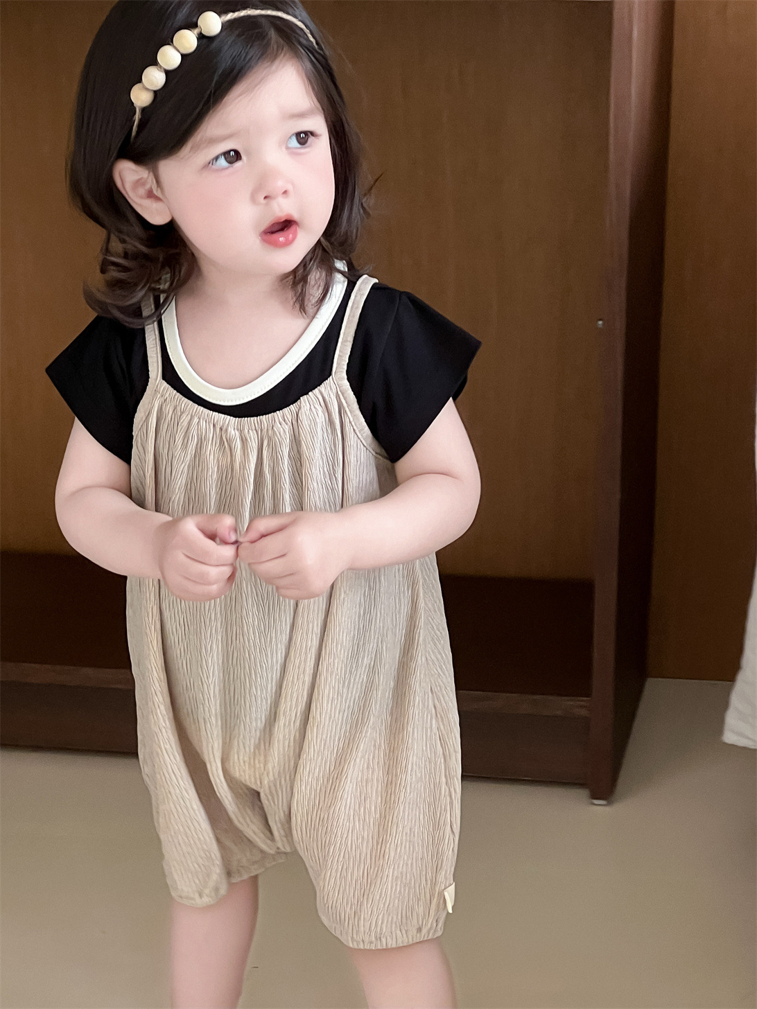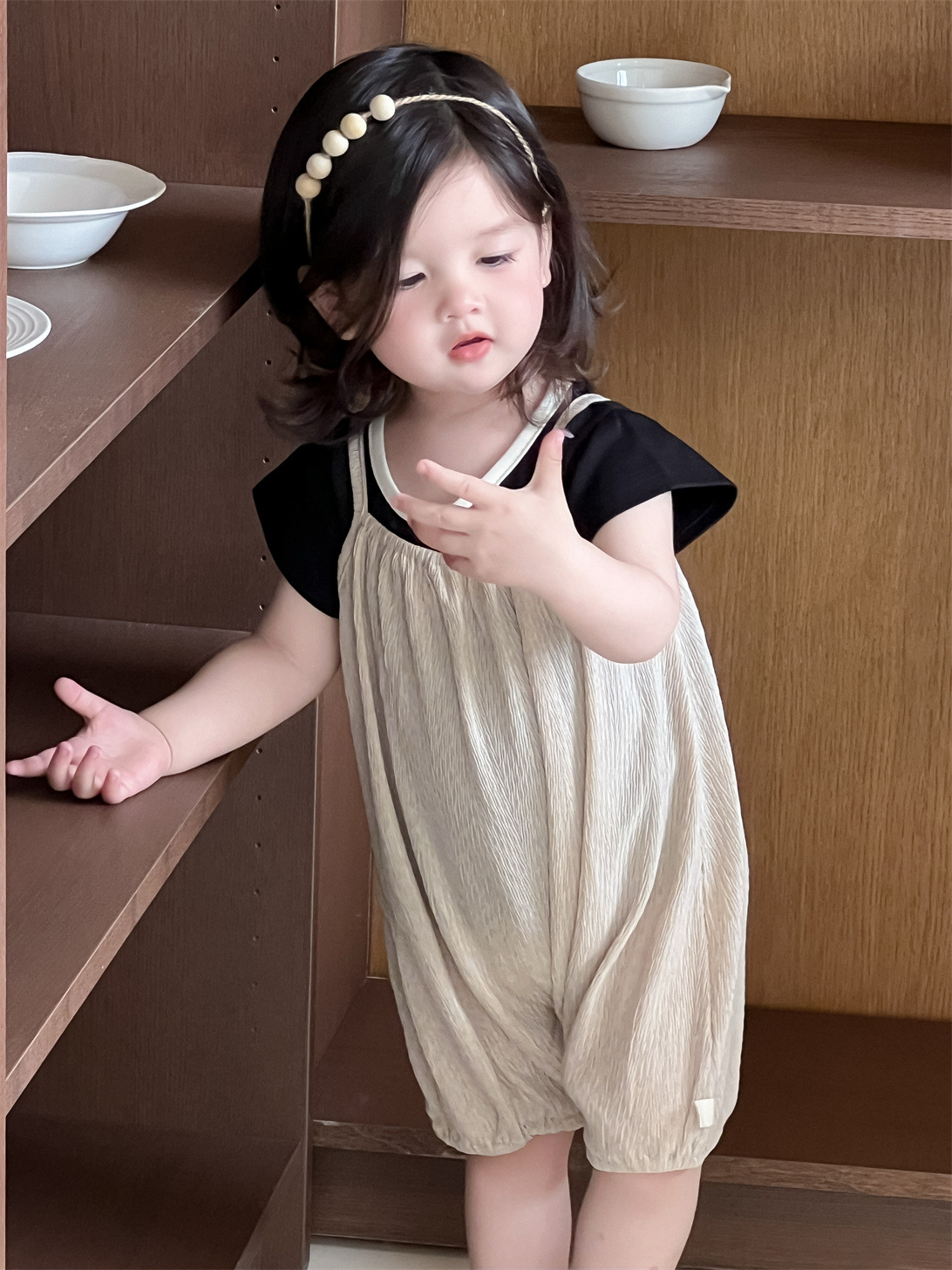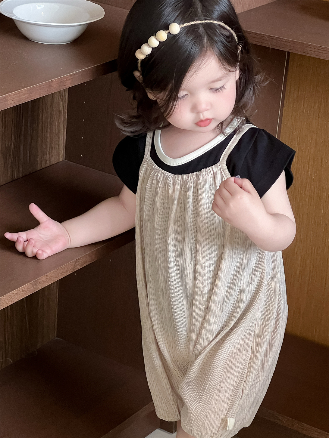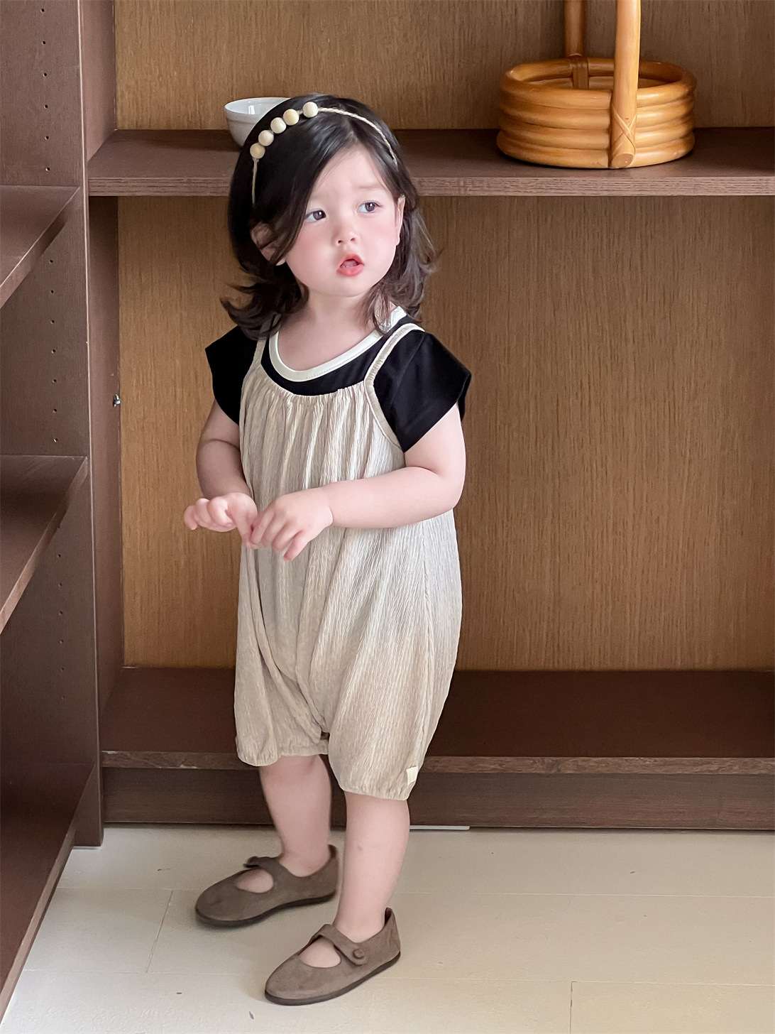 パイピングがアクセントの半袖Tシャツと、シンプルなキャミソールジャンプスーツのセットアップです。涼しく快適な薄手素材で、お子様の動きを妨げないゆったりとしたシルエットが特徴です。単独でも重ね着でも楽しめ、お子様の日常に彩りを添える一着です。