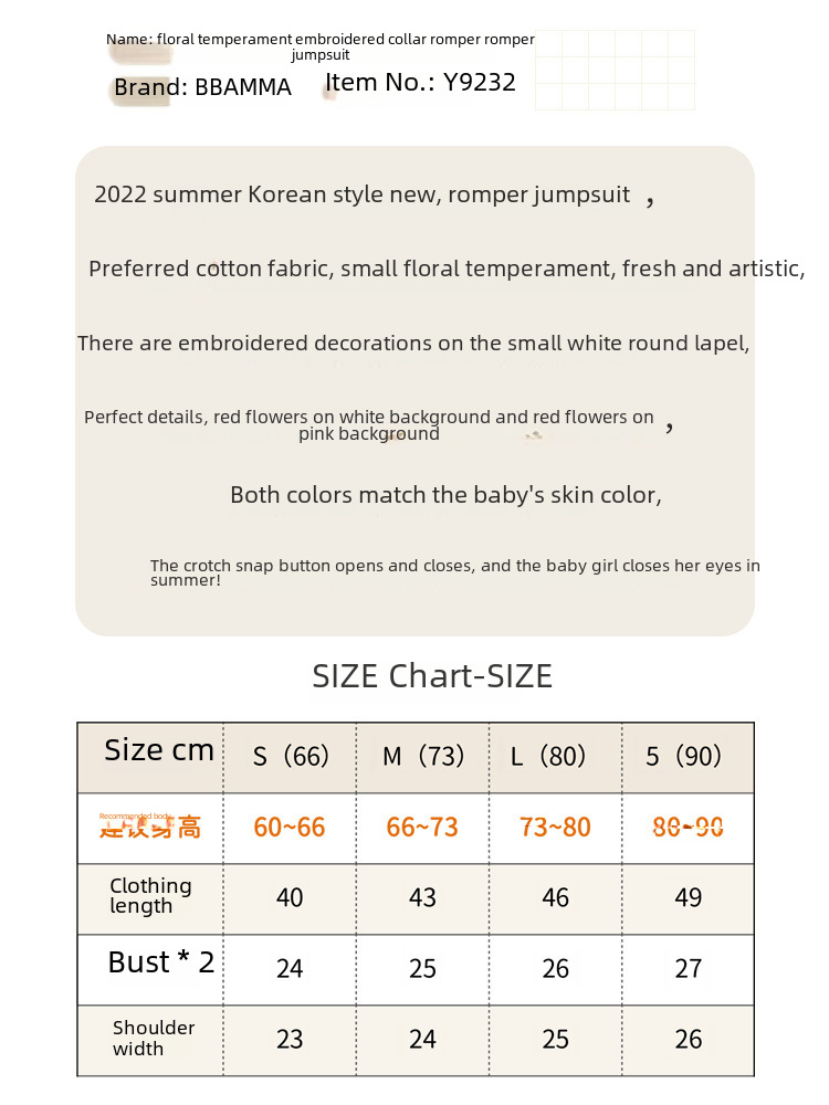 可憐な小花柄と繊細な刺繍が魅力のフラワー刺繍丸襟花柄プリント半袖ロンパースです。丸襟が可愛らしさを添え、夏のお出かけにぴったりの一枚です。