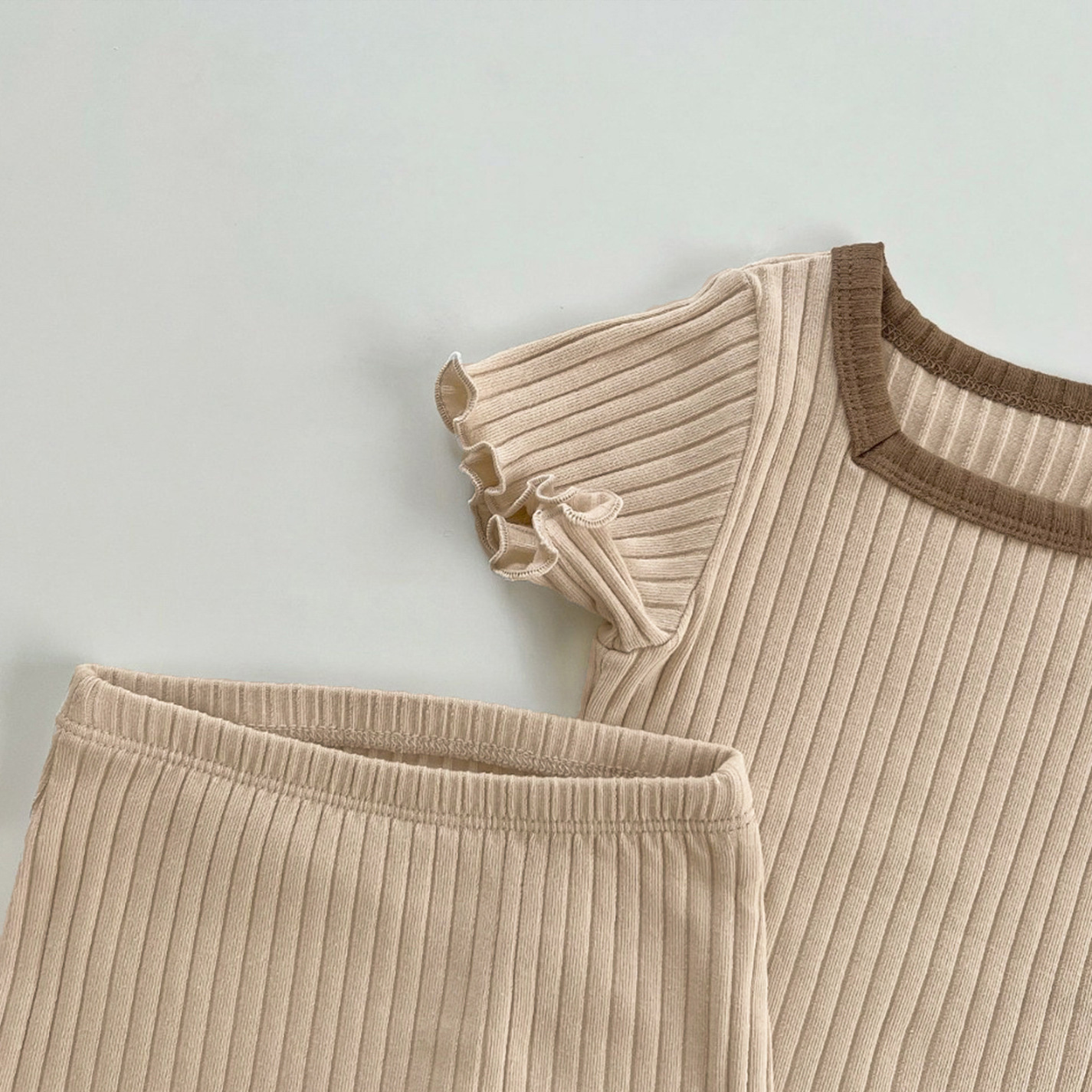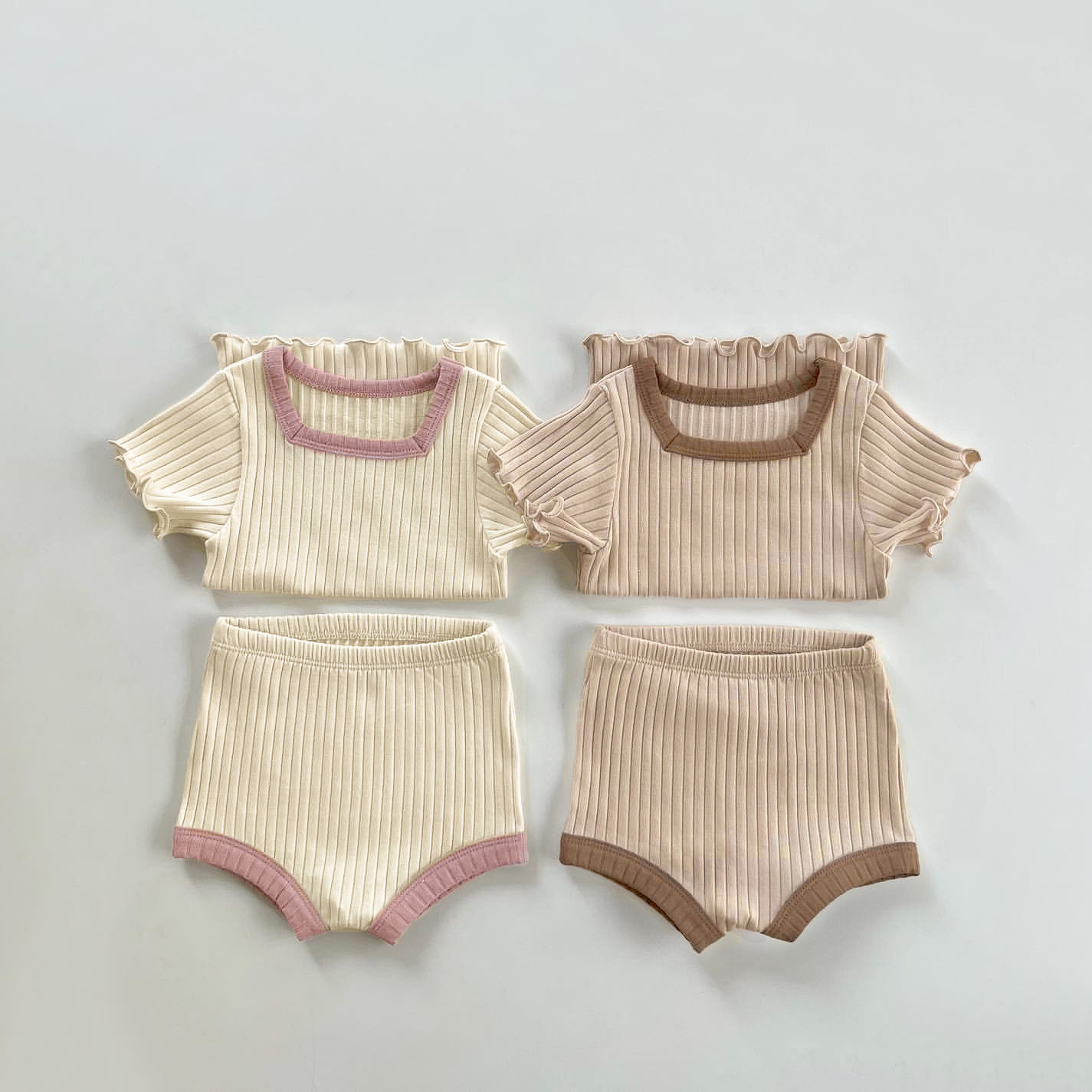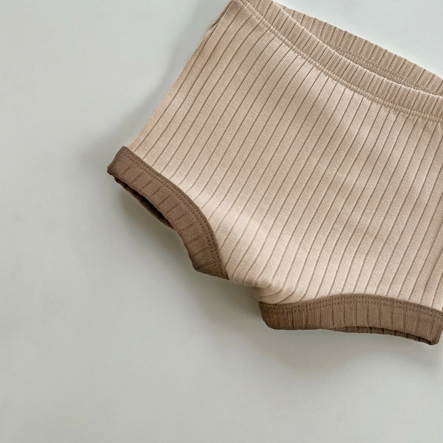 肌触りの良いコットン素材で仕立てられており、通気性も良く、暑い日でも赤ちゃんが快適に過ごせるように配慮しました。Tシャツの袖口や裾、ブルマパンツの縁にはコントラストカラーのパイピングが施されており、デザインのアクセントになっています。お部屋でのリラックスタイムやパジャマとしてはもちろん、ちょっとしたお出かけにもぴったりのセットです。