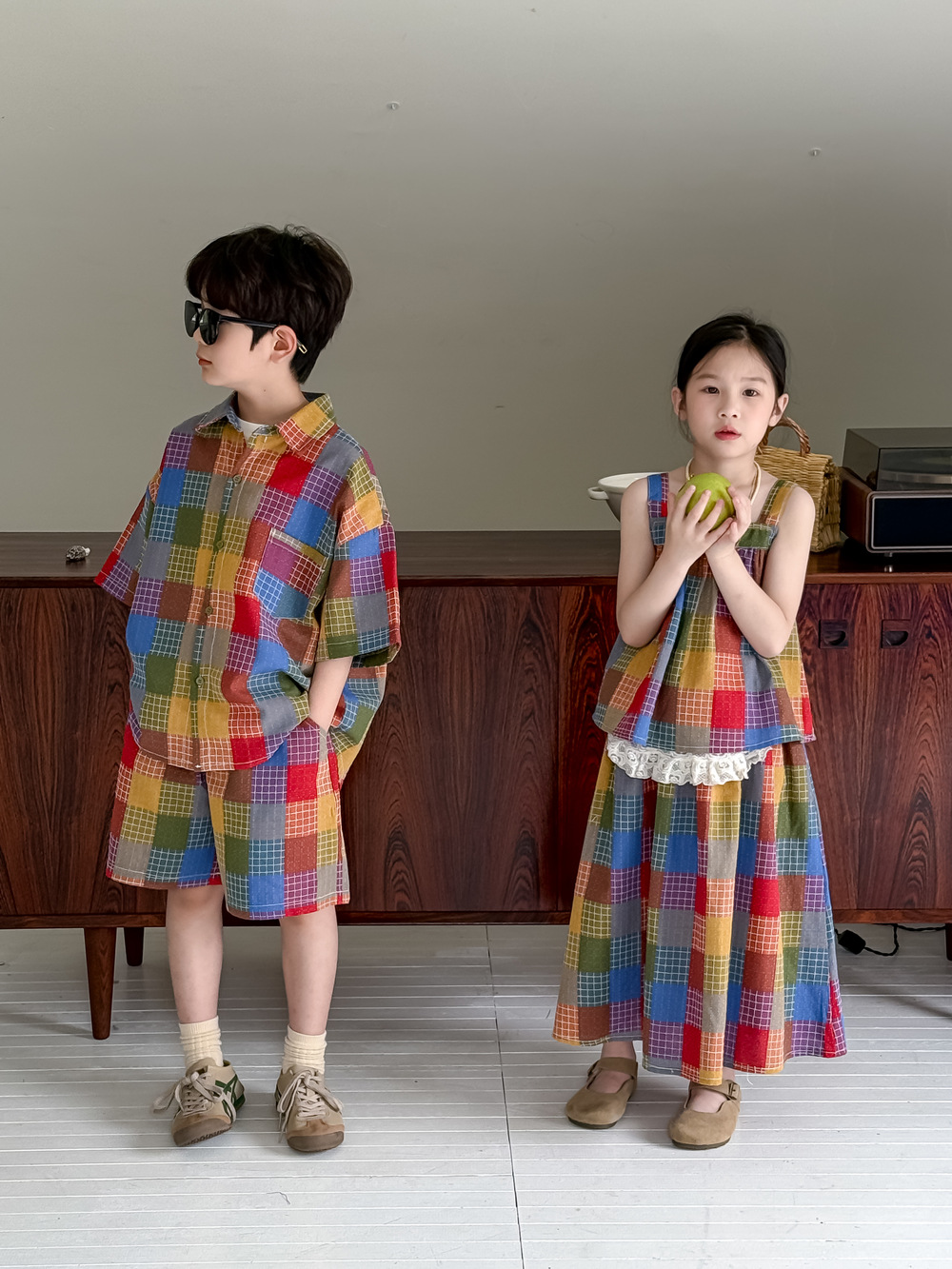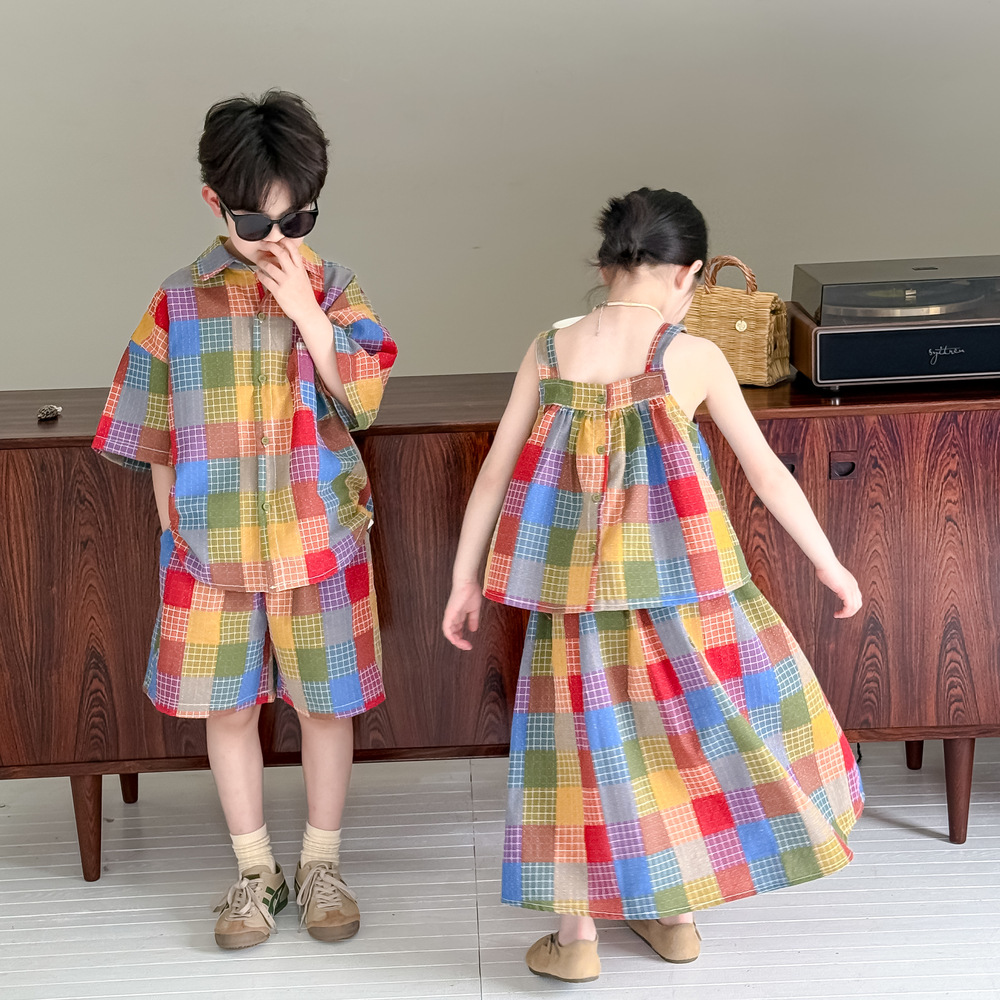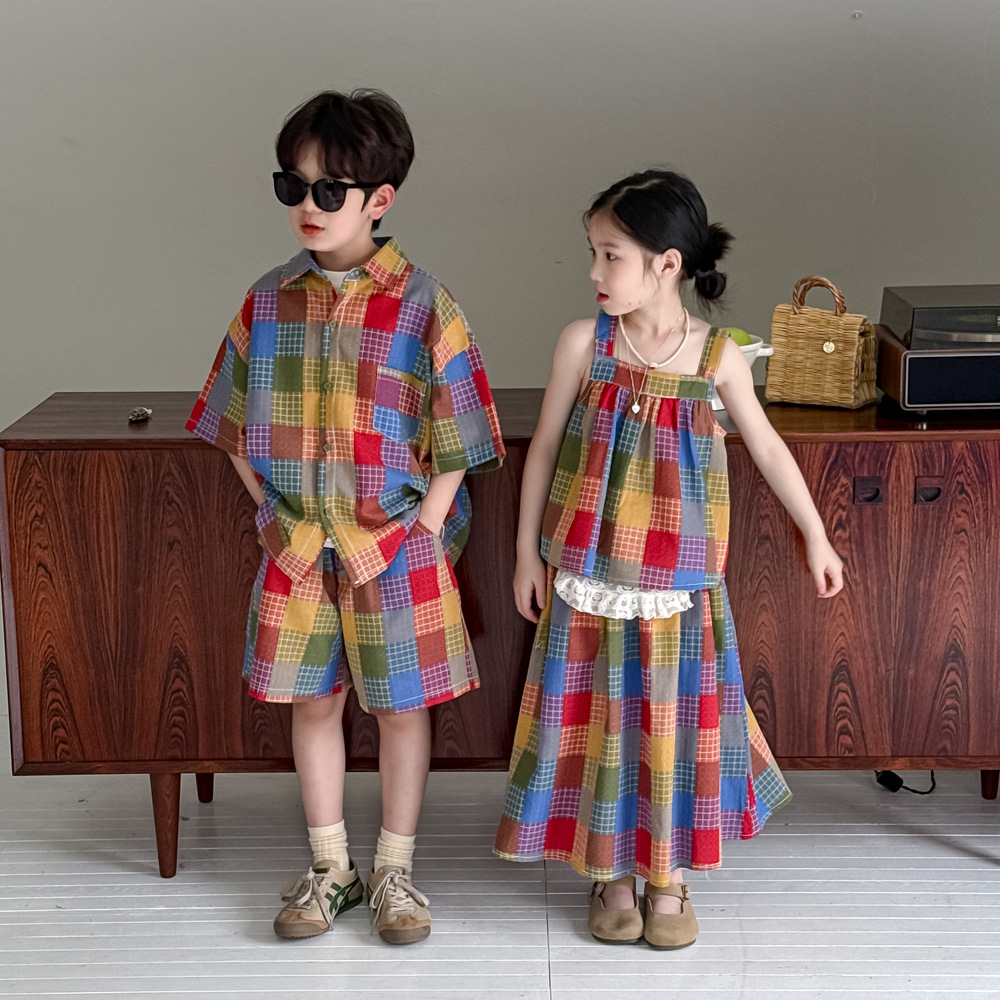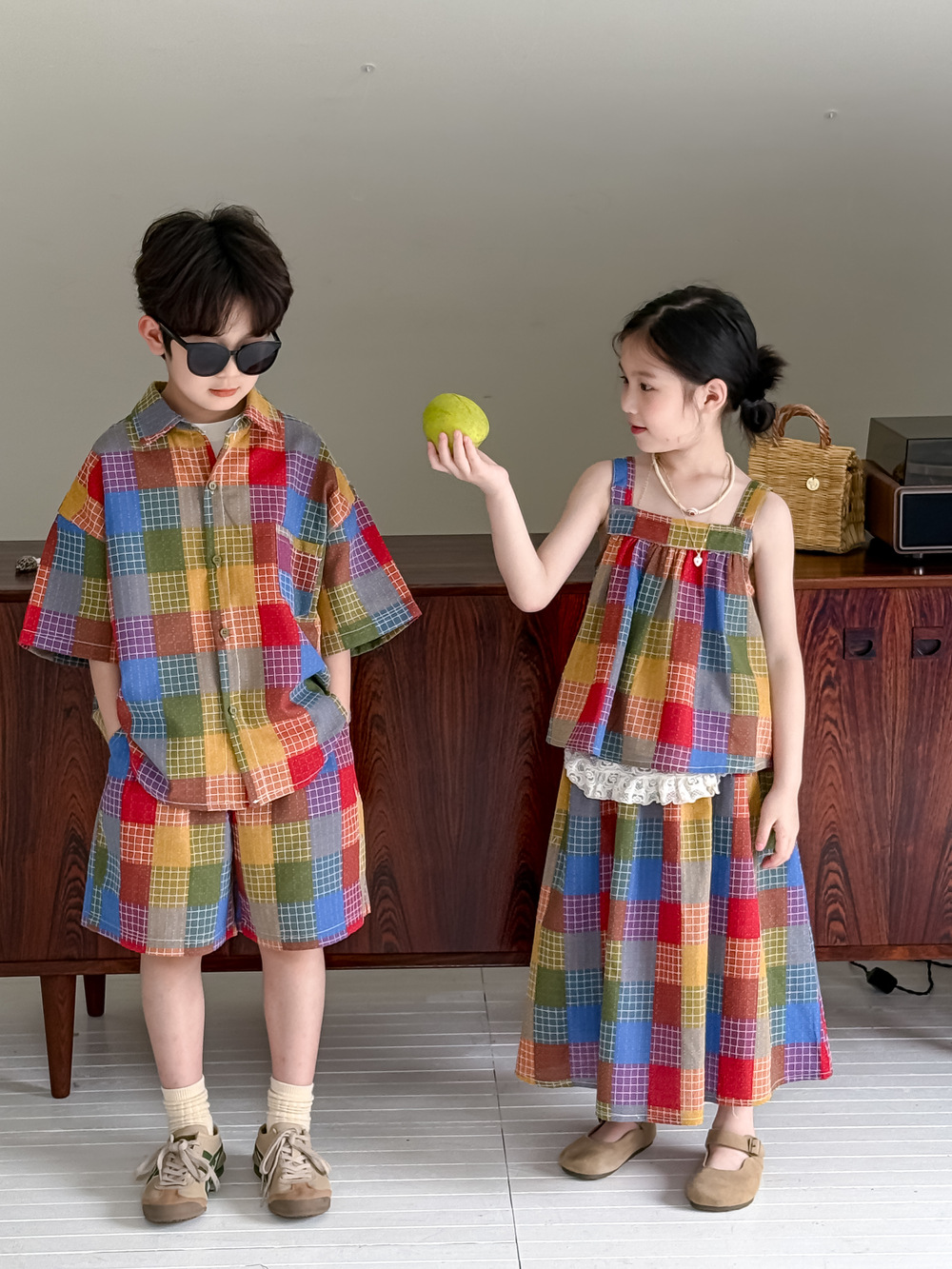 #キッズファッション #セットアップ #マドラスチェック #キャミソールブラウス #スカート #半袖シャツ #ショートパンツ #韓国子供服 #夏服