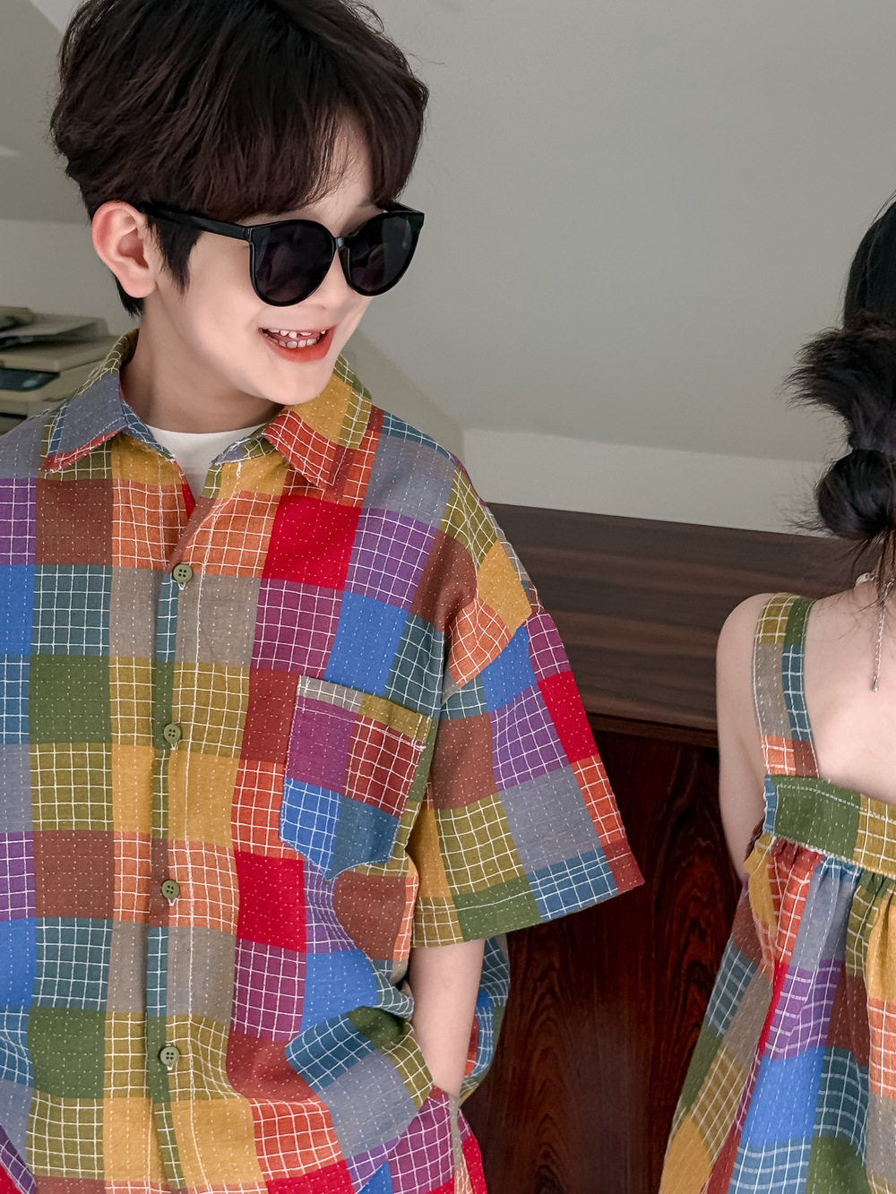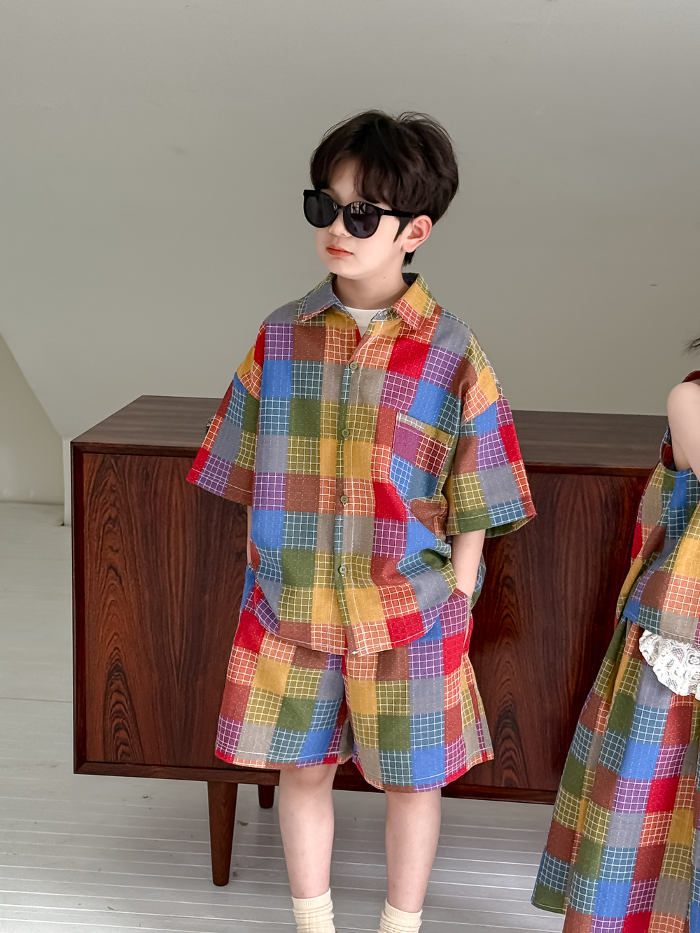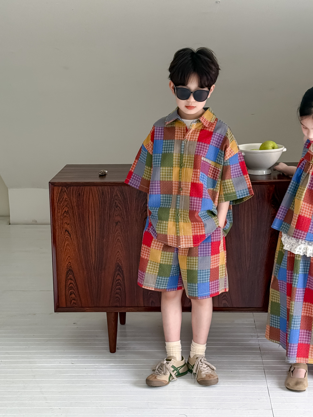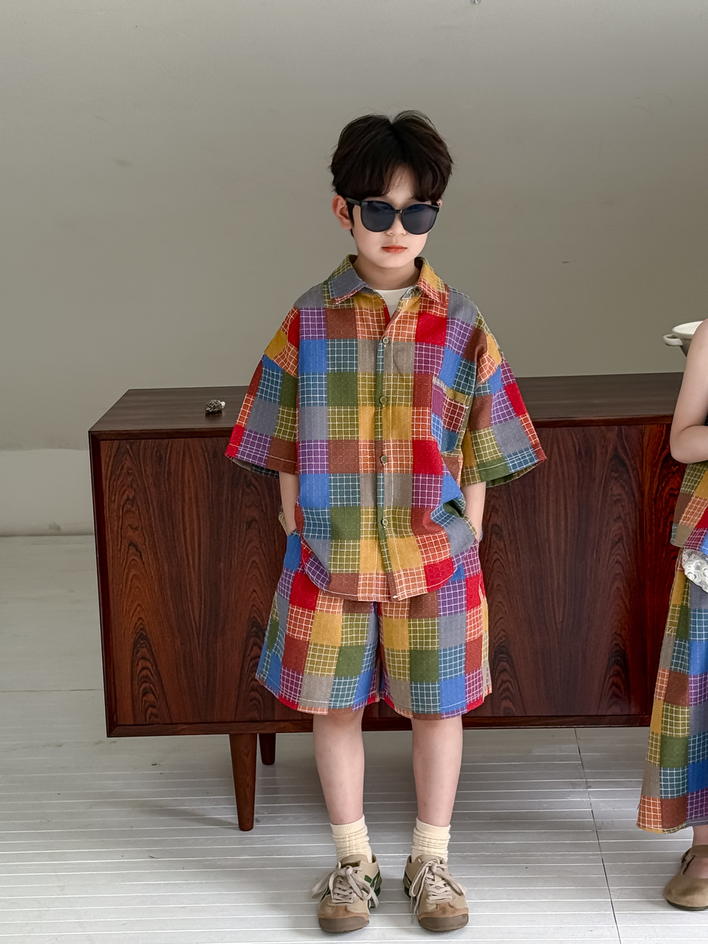 半袖シャツとショートパンツのセットは、同じくカラフルなマドラスチェック柄の半袖シャツとショートパンツの組み合わせ。ゆったりとした作りで、活発に動き回るお子さんも快適に過ごせます。韓国テイストの洗練されたデザインは、男の子にも女の子にも似合うユニセックスアイテム。それぞれ単独でも着回せるため、お手持ちのアイテムとのコーディネートも幅広く楽しめます。