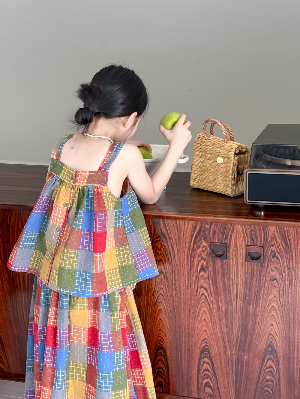 キャミソールブラウスとスカートのセットは、鮮やかな多色チェックが目を引くデザイン。ふんわりとしたシルエットのキャミソールブラウスと、それに合わせたスカートが、女の子らしい軽やかさを演出します。暑い日でも涼しく快適に過ごせる素材で、お出かけが楽しくなる一着です。
