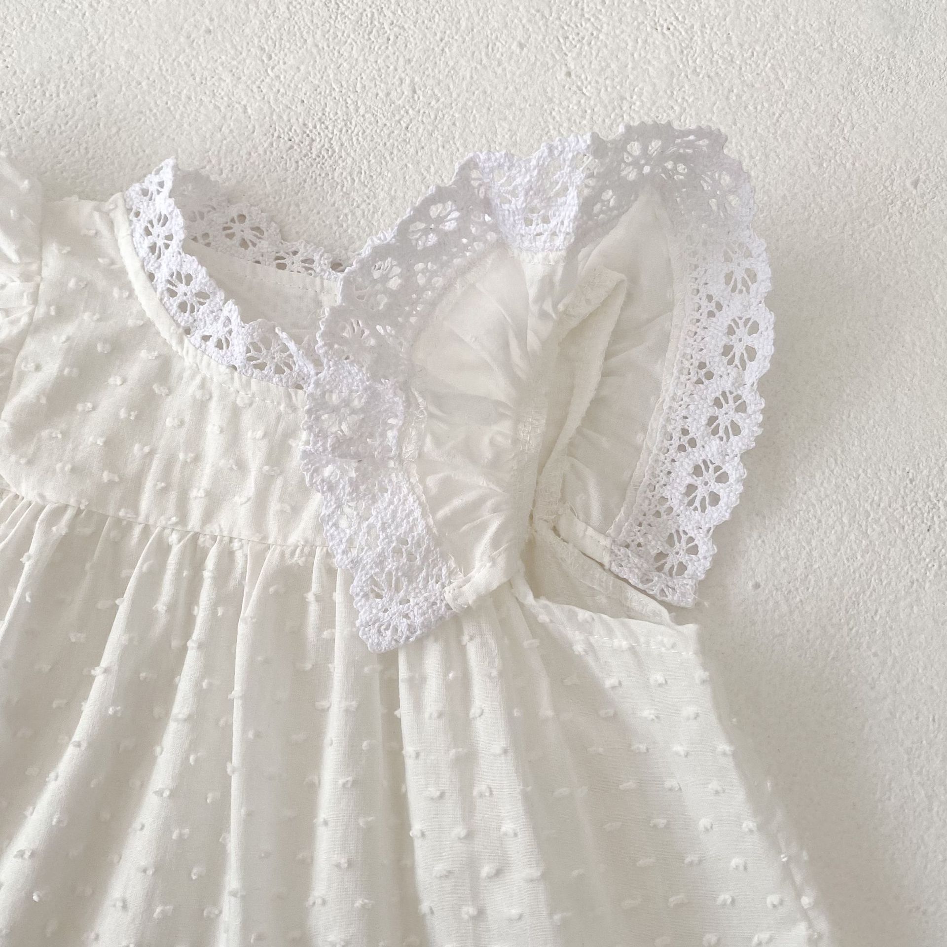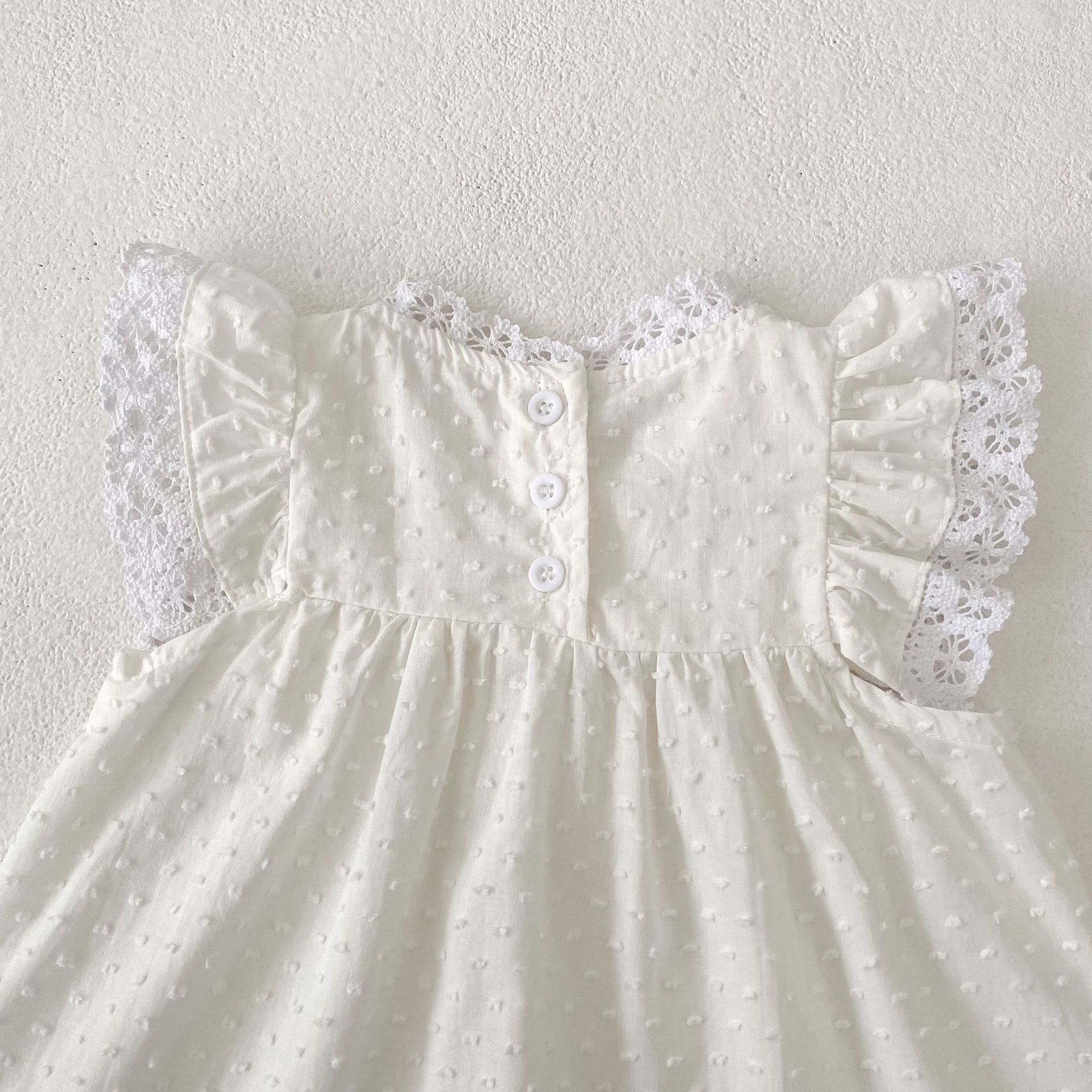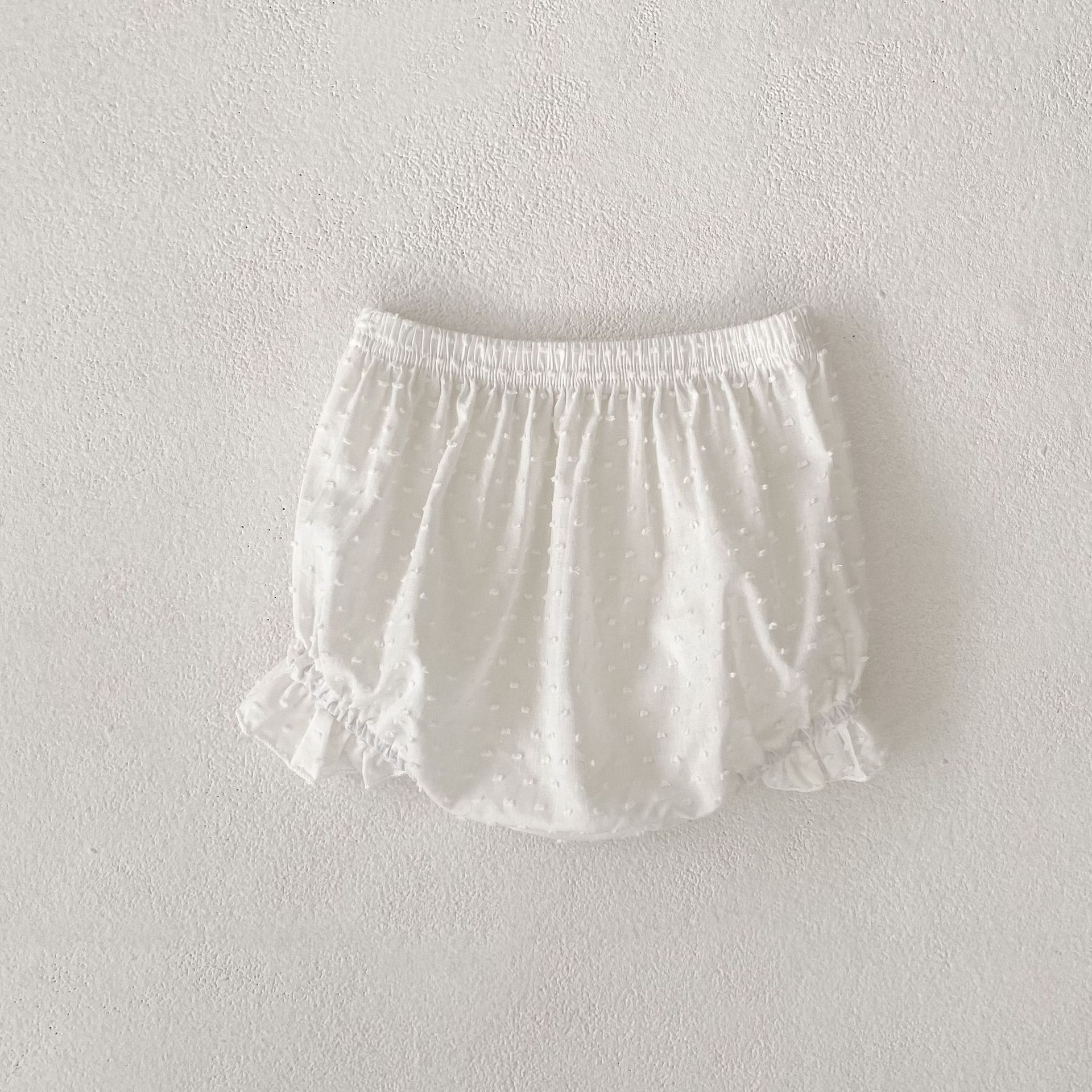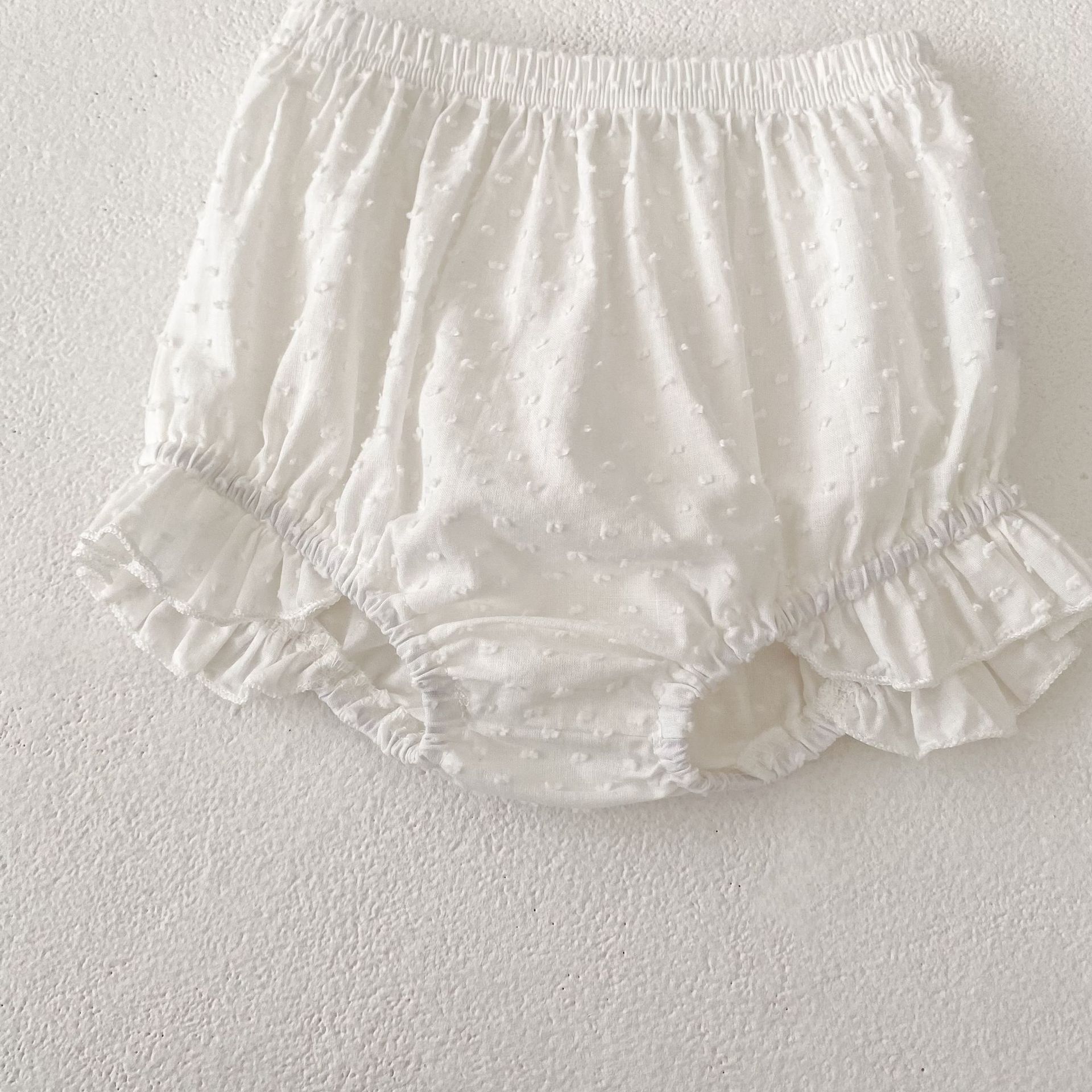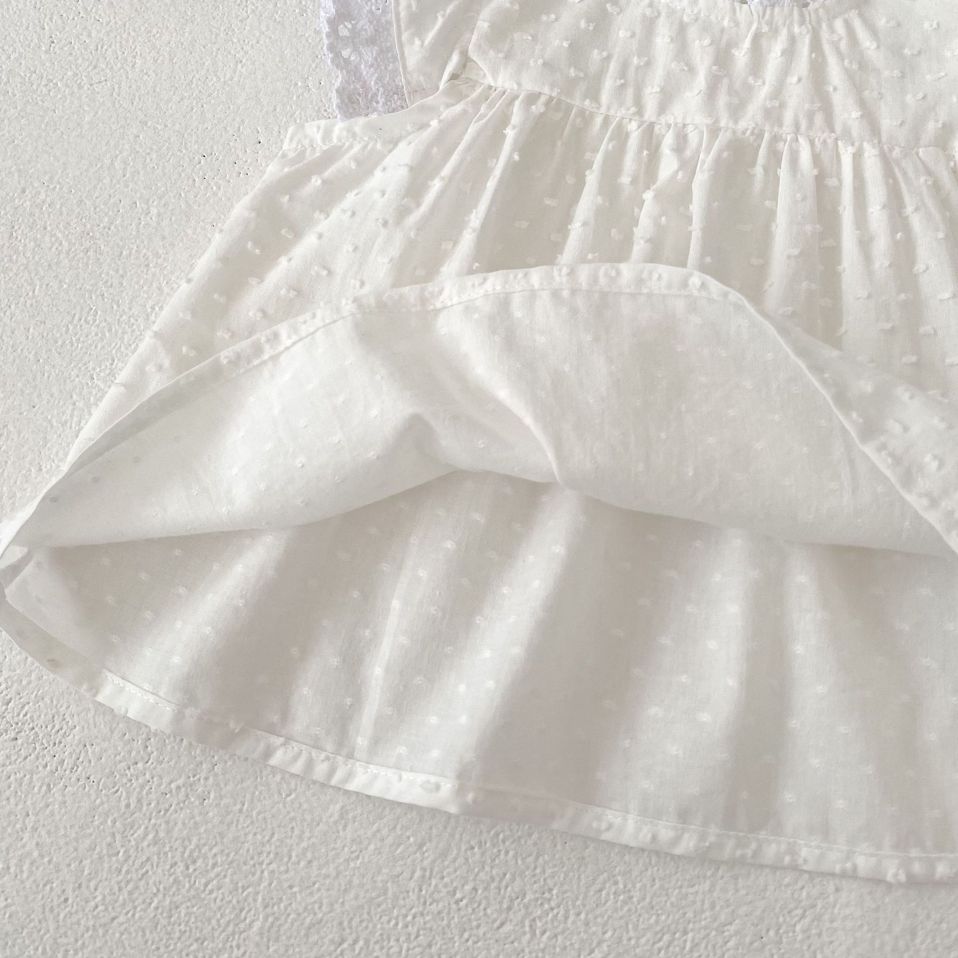 トップスは、エンボス加工されたドット柄のレース素材が特徴のチュニックブラウス。フライングスリーブ(フリル袖)とレース使いが、繊細で愛らしい印象を与えます。通気性の良い薄手の生地なので、暑い夏でもお子さんが快適に過ごせます。セットのブルマパンツは、動きやすく、おむつを履いたベビーもすっきり。