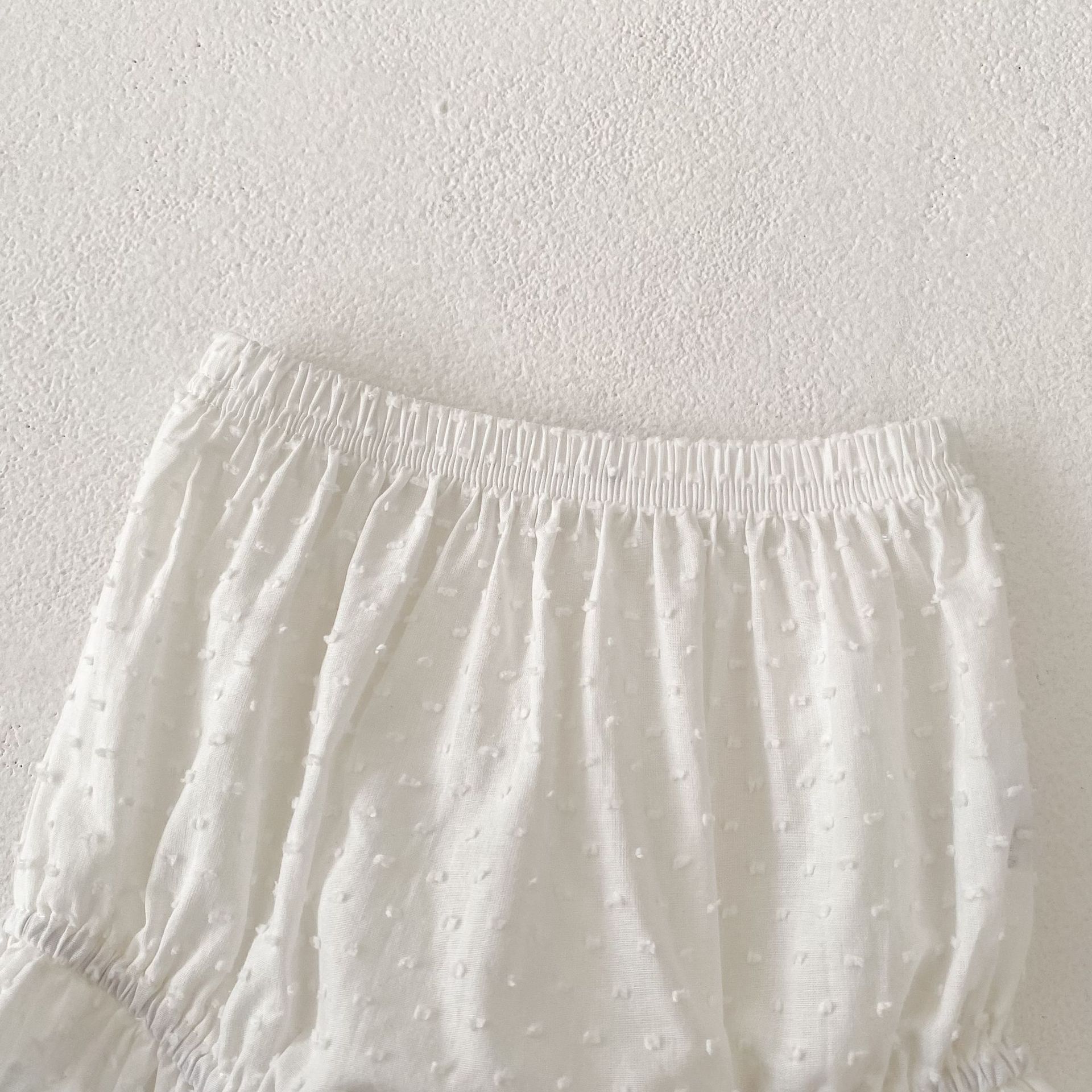 透け感が可愛らしい、夏にぴったりのエンボスドットレースチュニックブラウス+ブルマパンツセットアップです。まるで小さなプリンセスのような、韓国テイストの甘くてフレッシュなデザイン。
