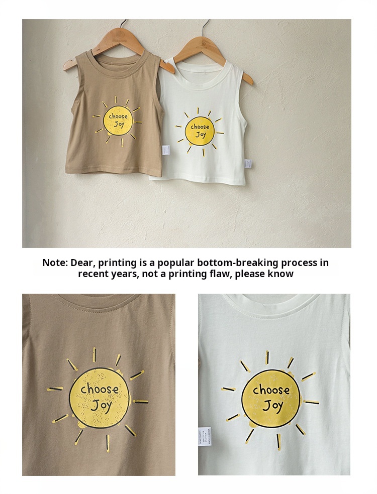 夏のデイリーユースにぴったりの、太陽プリントノースリーブタンクトップTシャツです。男の子も女の子も、涼しく快適に着られる一枚。