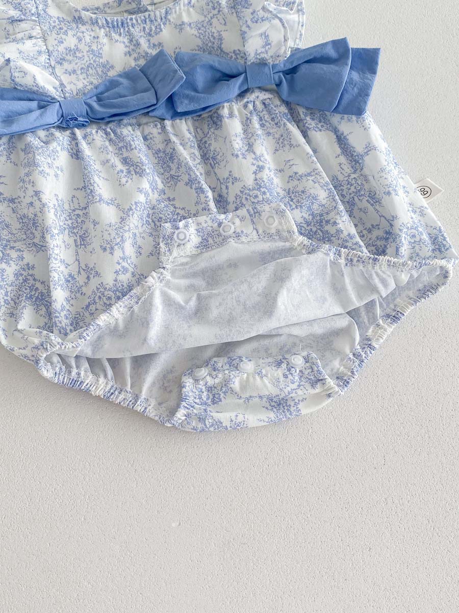 薄手の素材なので、肌触りが良く通気性も抜群で、暑い夏でもベビーが快適に過ごせます。肩から腕にかけてのフリル袖が可愛らしく、ウエスト部分の大きなリボンがアクセントになって、甘い雰囲気を演出します。全体に散りばめられた花柄が、華やかさを添えます。