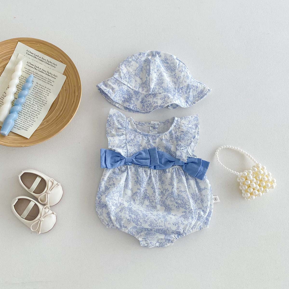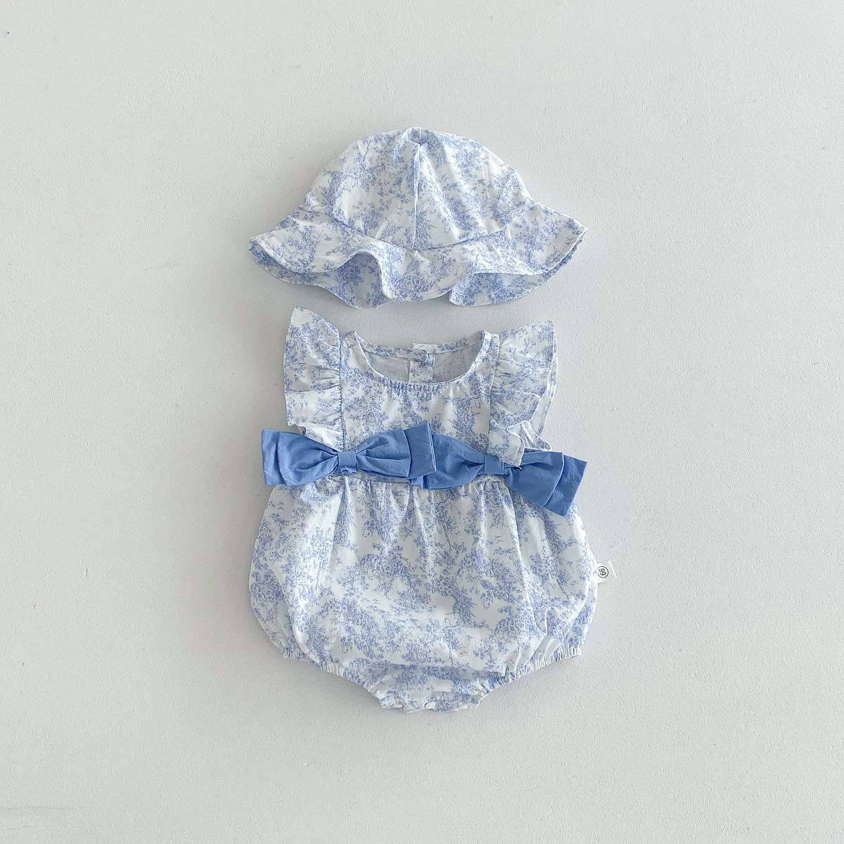 夏のお出かけにぴったりの、ビッグリボンフリル袖ロンパースと帽子のお得なセットです。外国の雰囲気を感じさせる、花柄と大きなリボンが特徴のベビーガール向けアイテム。