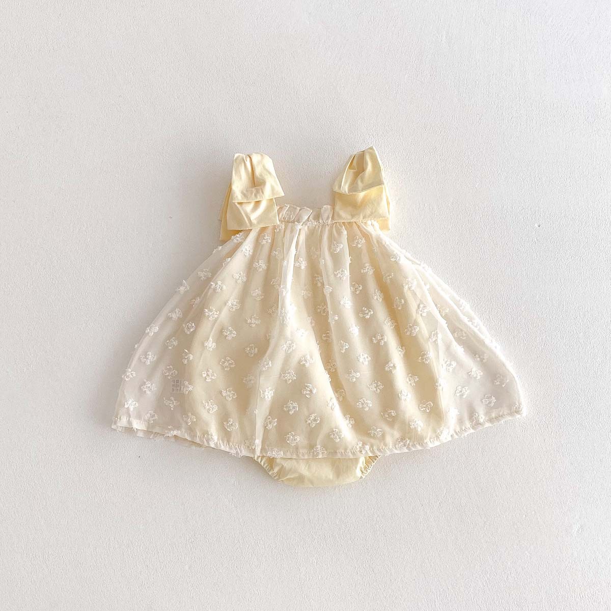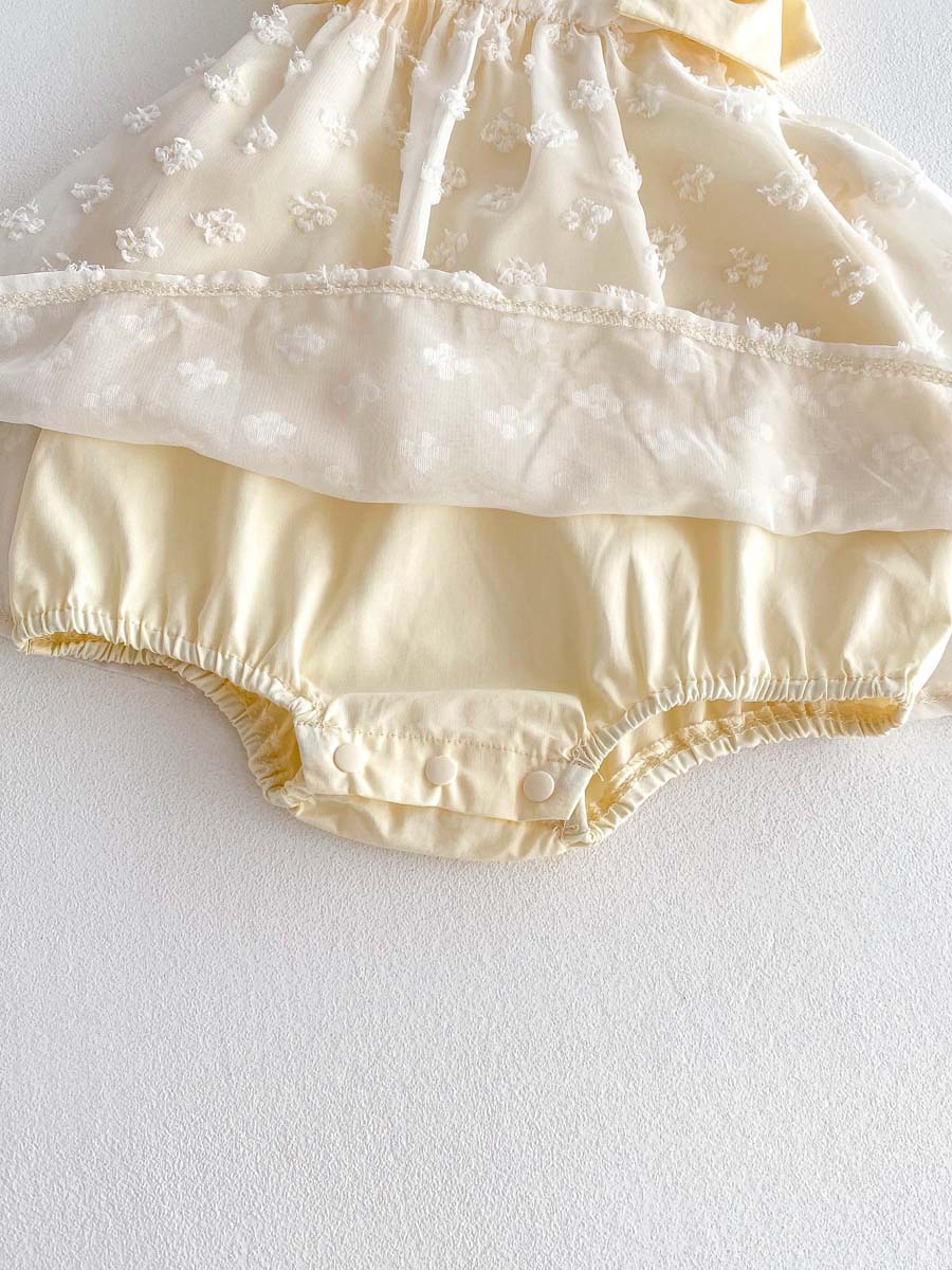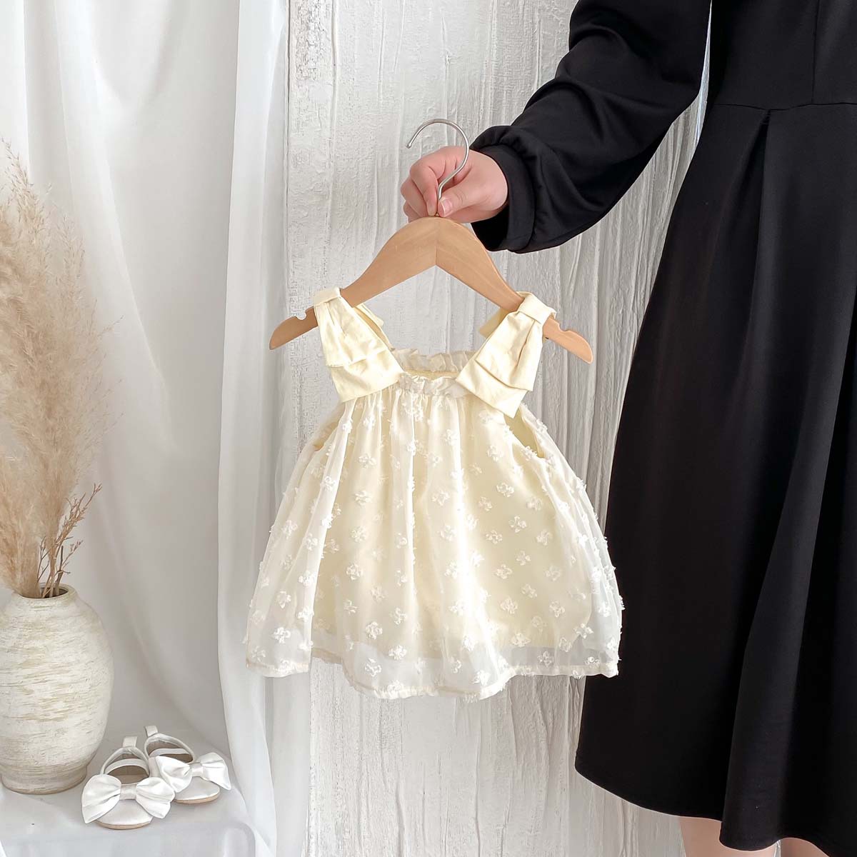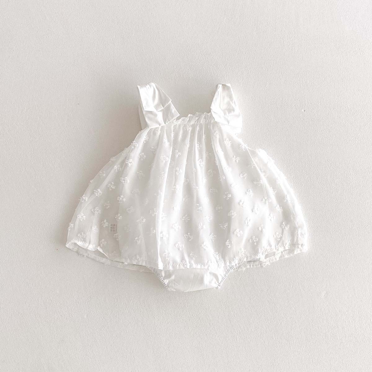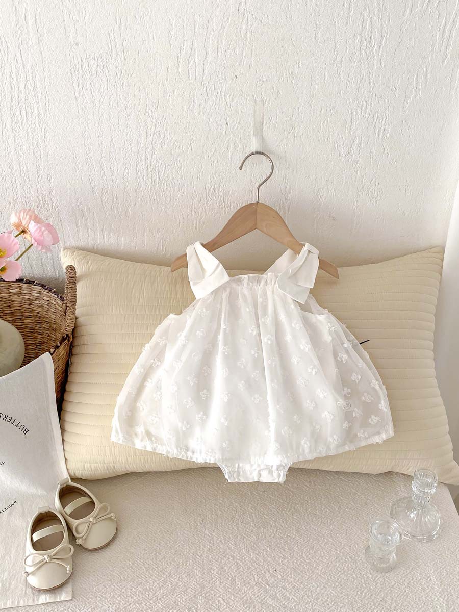 柔らかなジャカード織りの素材で肌触りが良く、涼しげなノースリーブデザインなので、暑い夏でもベビーが快適に過ごせます。肩にあしらわれた大きなリボンが女の子らしい可愛らしさを一層引き立て、スカート部分はふんわりとしたチュールが何層にも重なって、まるで小さなプリンセスドレスのよう。動くたびに軽やかに揺れるチュールが、ベビーの可愛らしさを際立たせます。