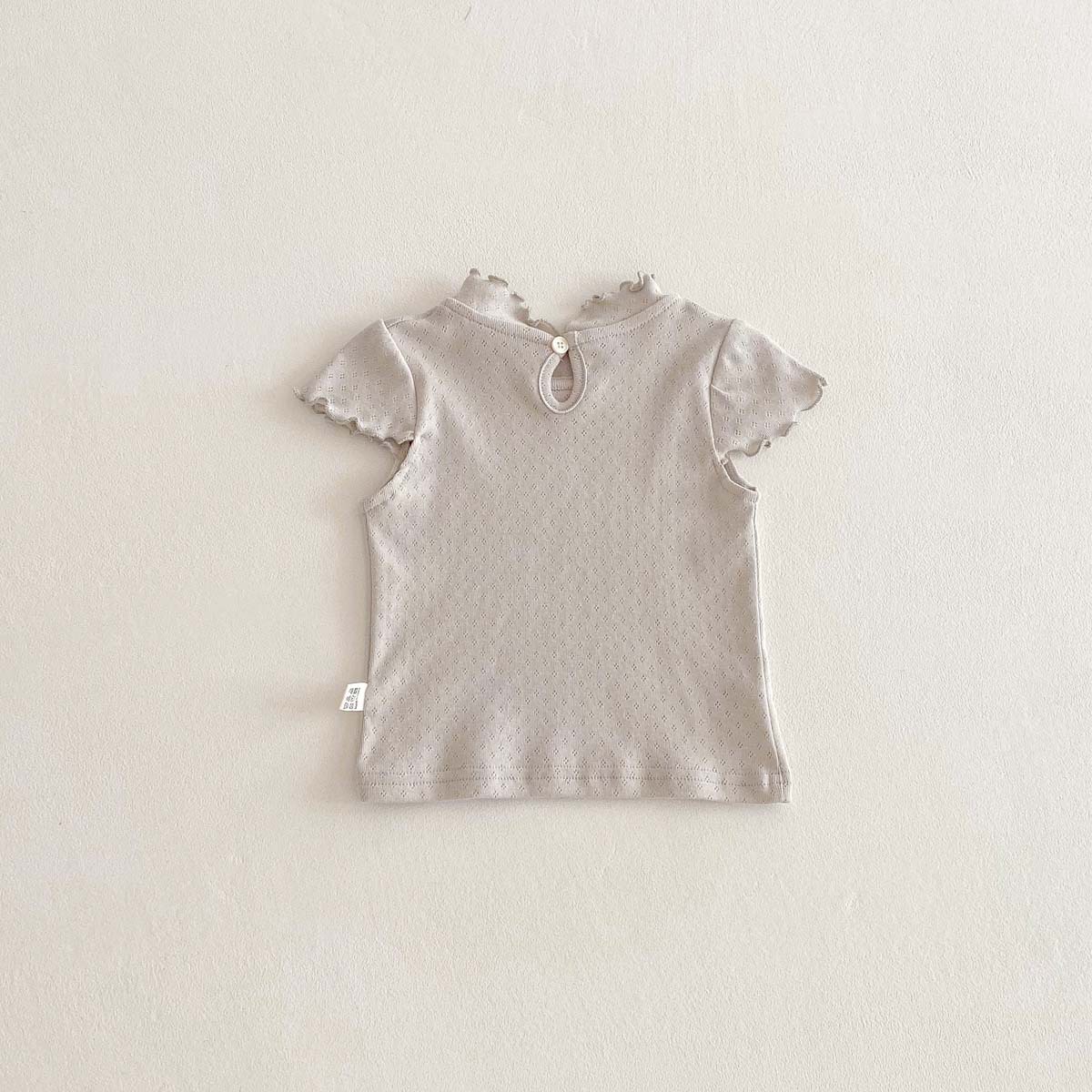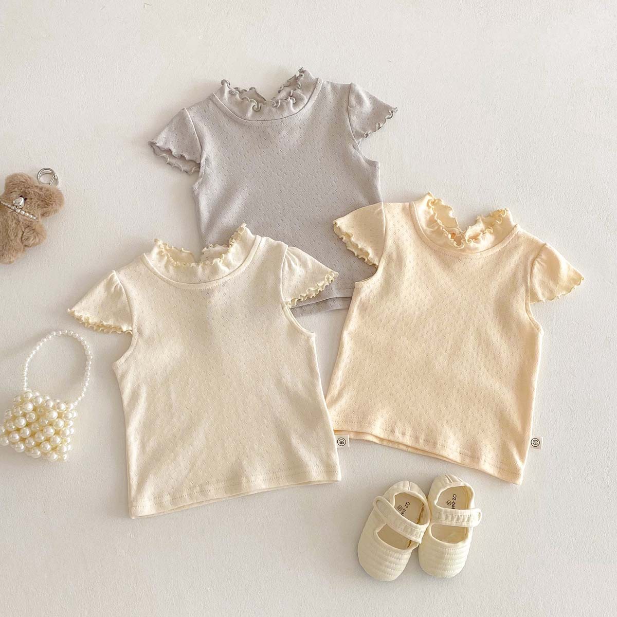 夏の女の子ベビーにぴったりの、フリルスタンドカラー半袖Tシャツです。シンプルながらも可愛らしいデザインで、着回し力も抜群。