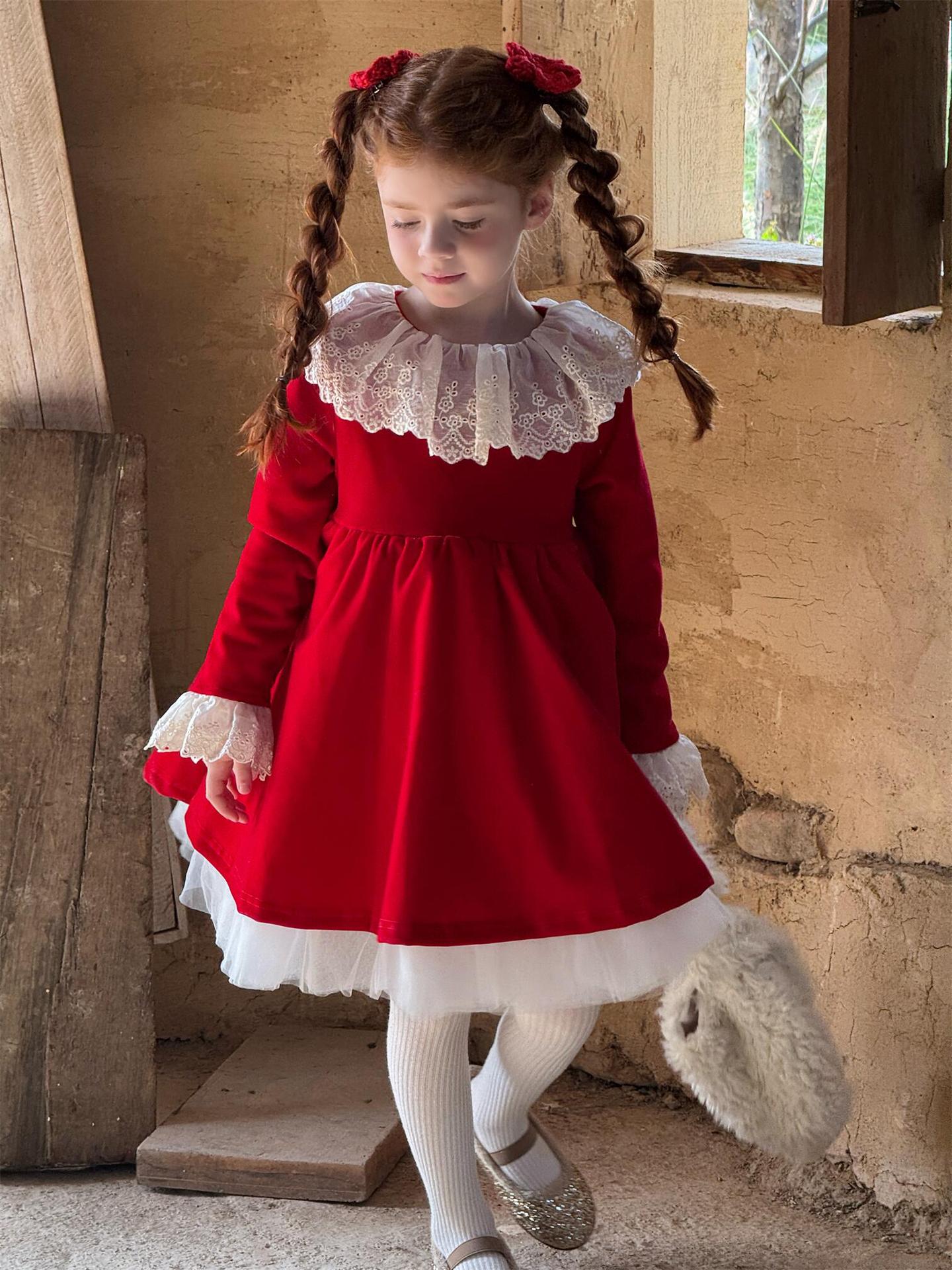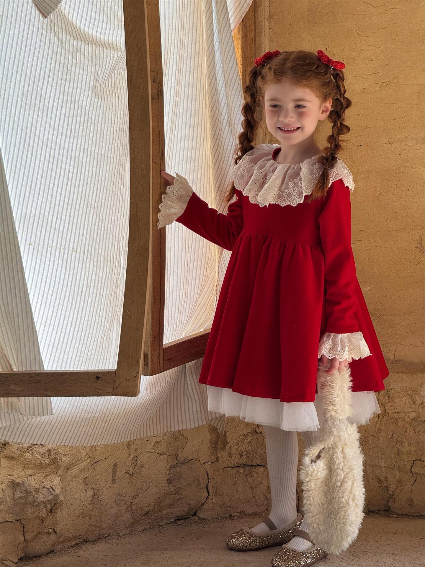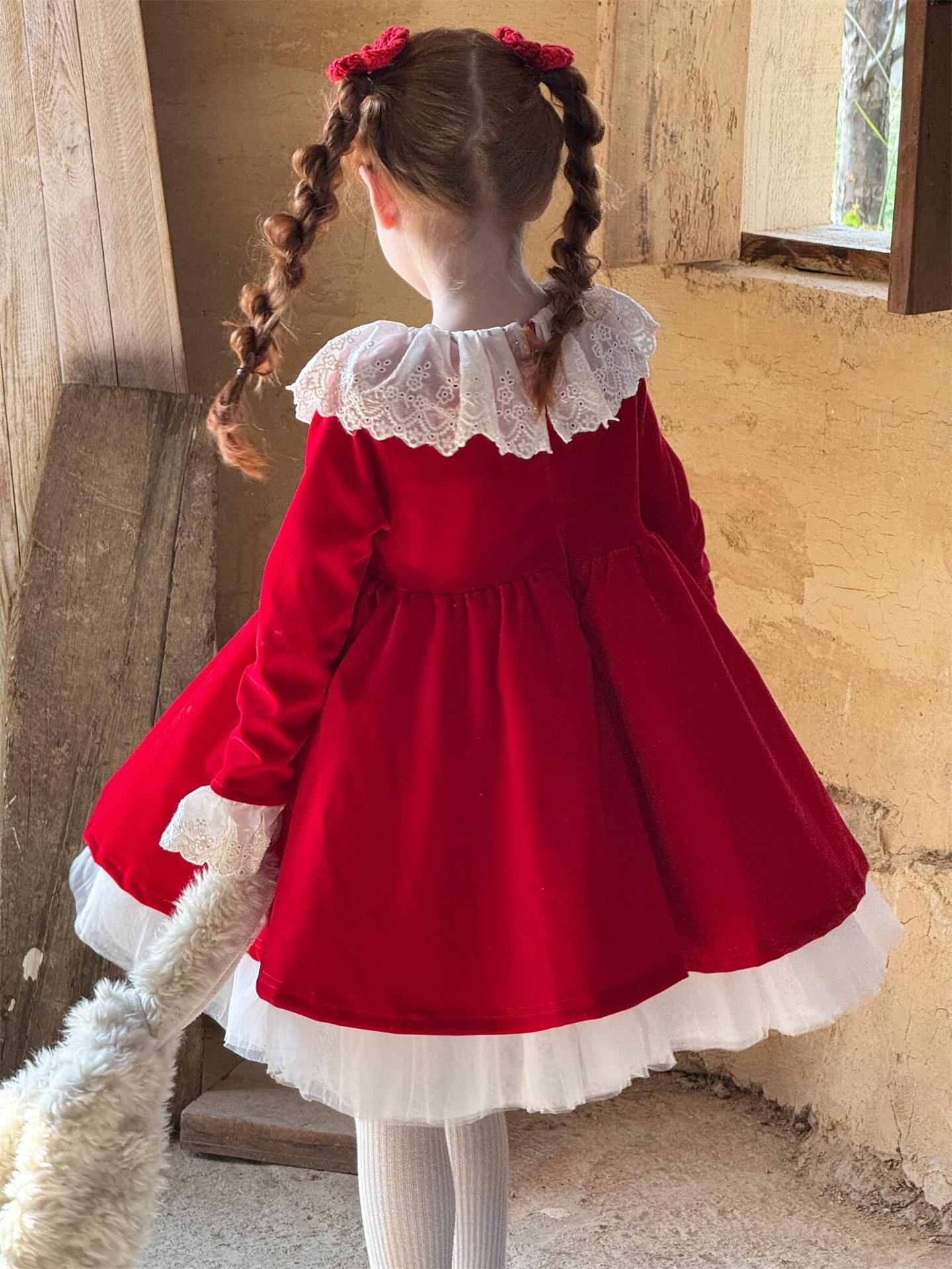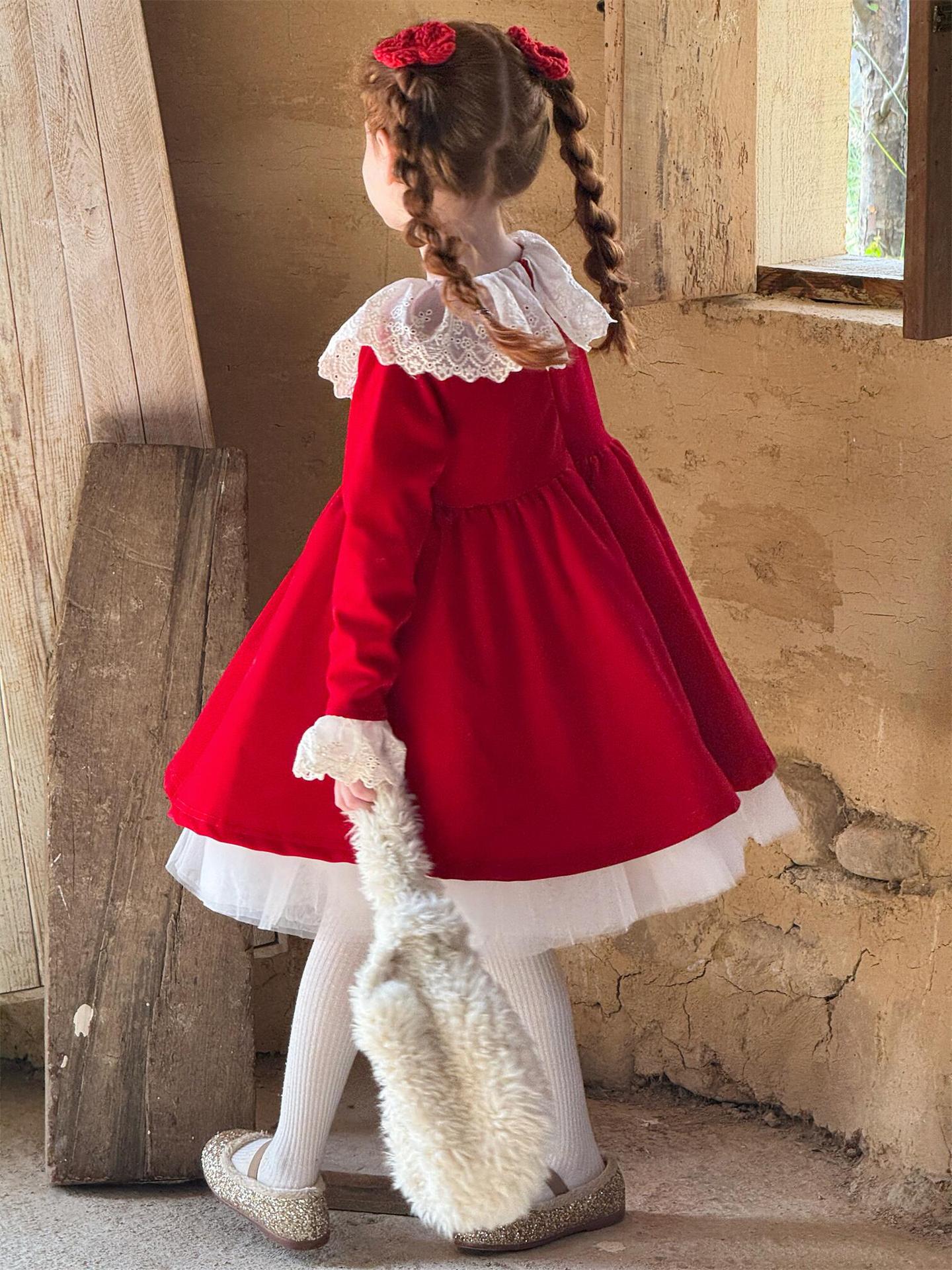上品な光沢を持つベロア素材で仕立てた長袖ワンピースは、顔周りを飾る繊細なレースフリルカラーがエレガントな印象を与えます。お祝いの席やパーティ、新年の集まりにぴったりのドレスで、一枚着るだけで華やかなスタイルが完成します。素材の高級感とデザインの愛らしさを兼ね備えた、特別な日のための子ども服です。