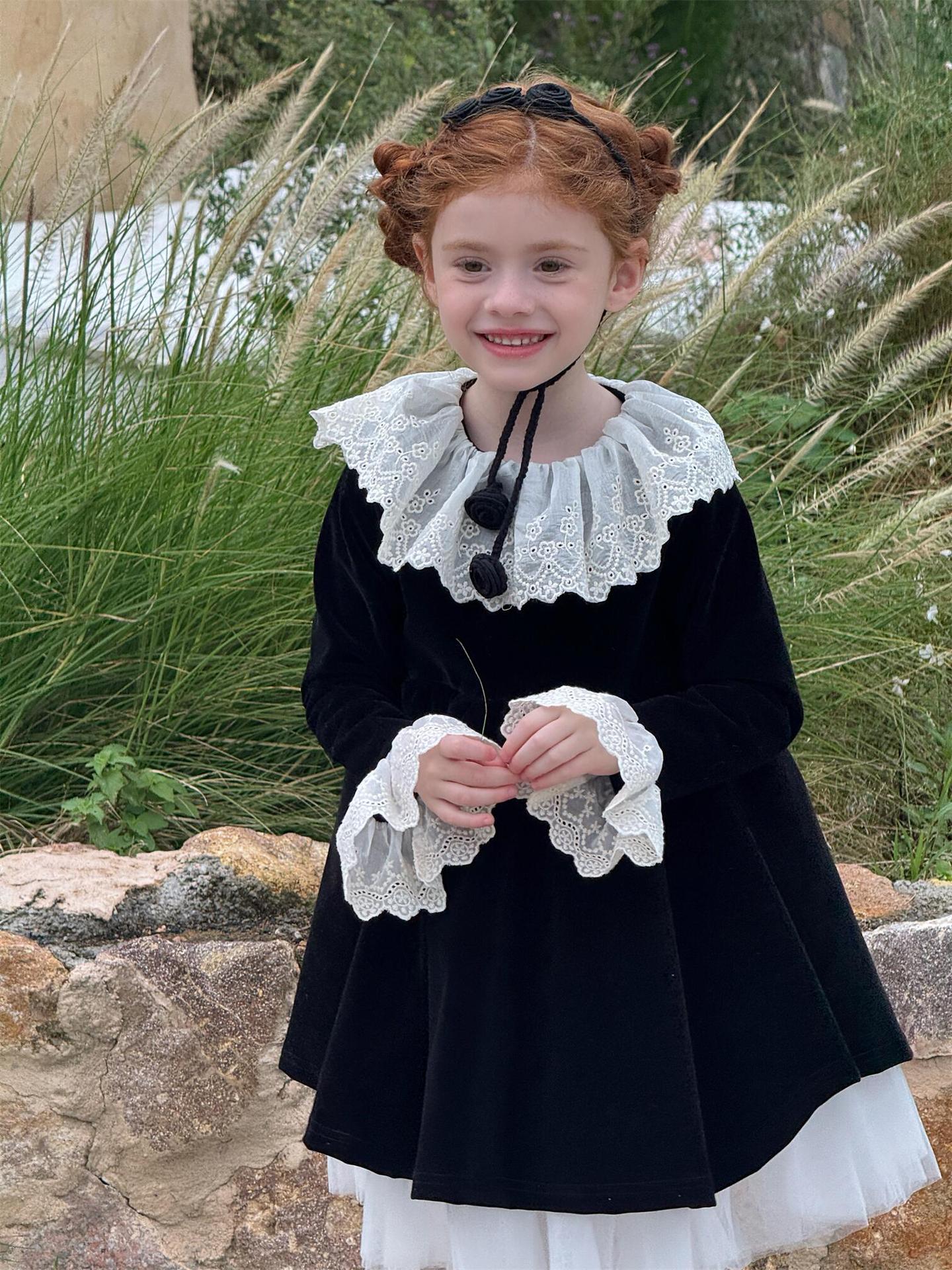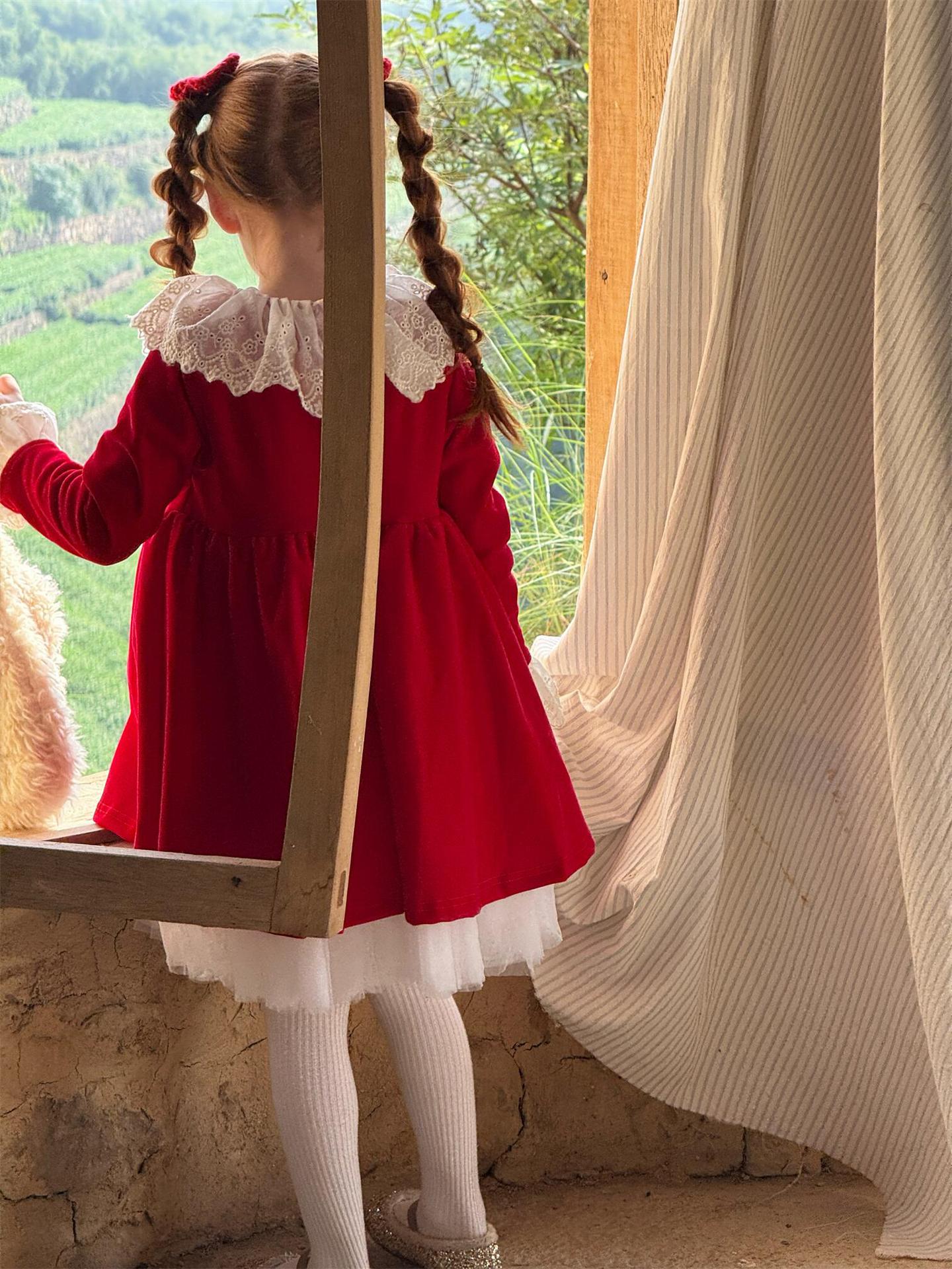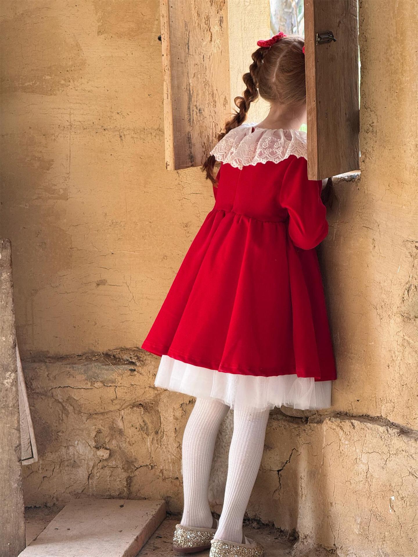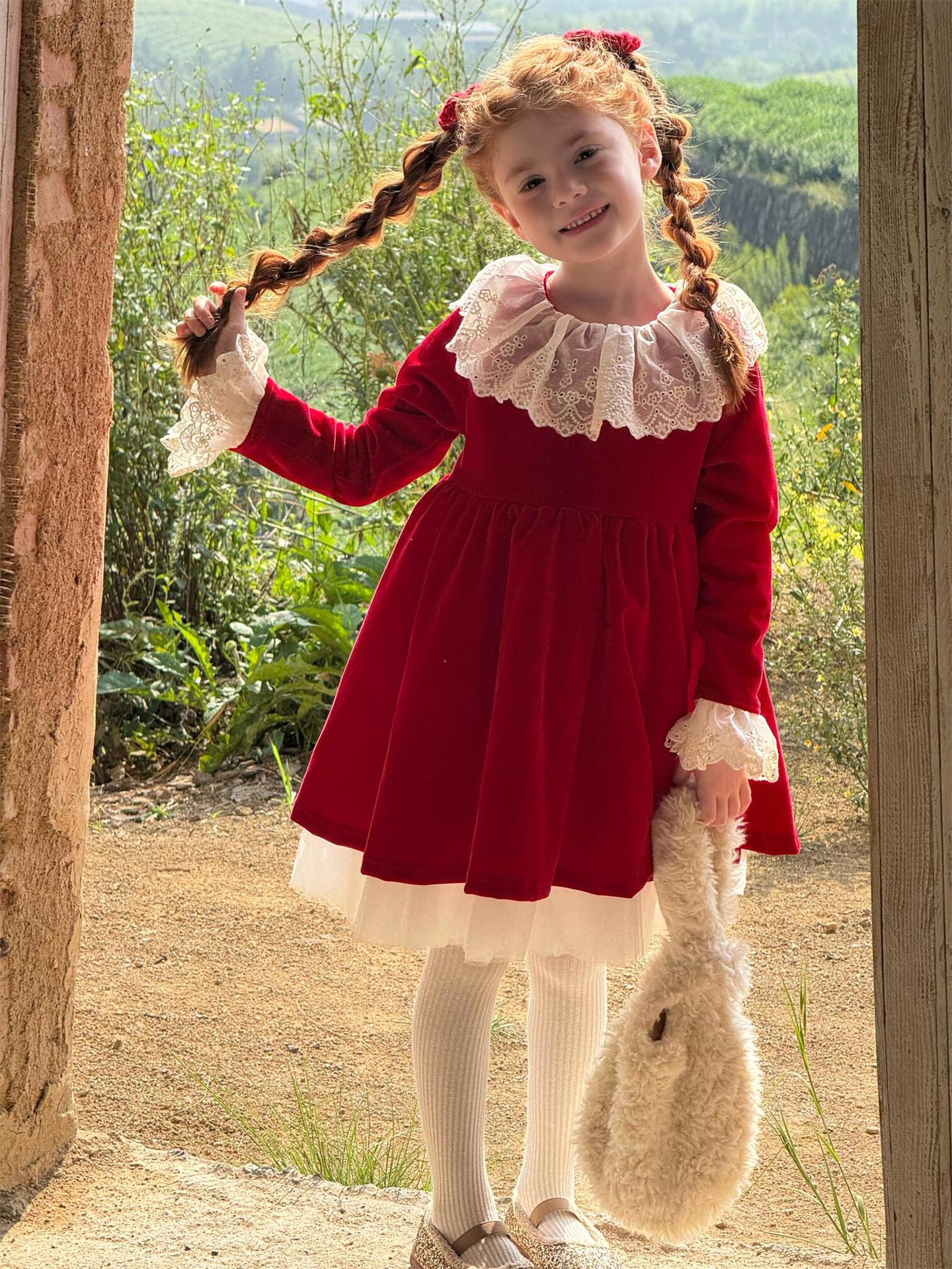 上品な光沢を持つベロア素材で仕立てた長袖ワンピースは、顔周りを飾る繊細なレースフリルカラーがエレガントな印象を与えます。お祝いの席やパーティ、新年の集まりにぴったりのドレスで、一枚着るだけで華やかなスタイルが完成します。素材の高級感とデザインの愛らしさを兼ね備えた、特別な日のための子ども服です。