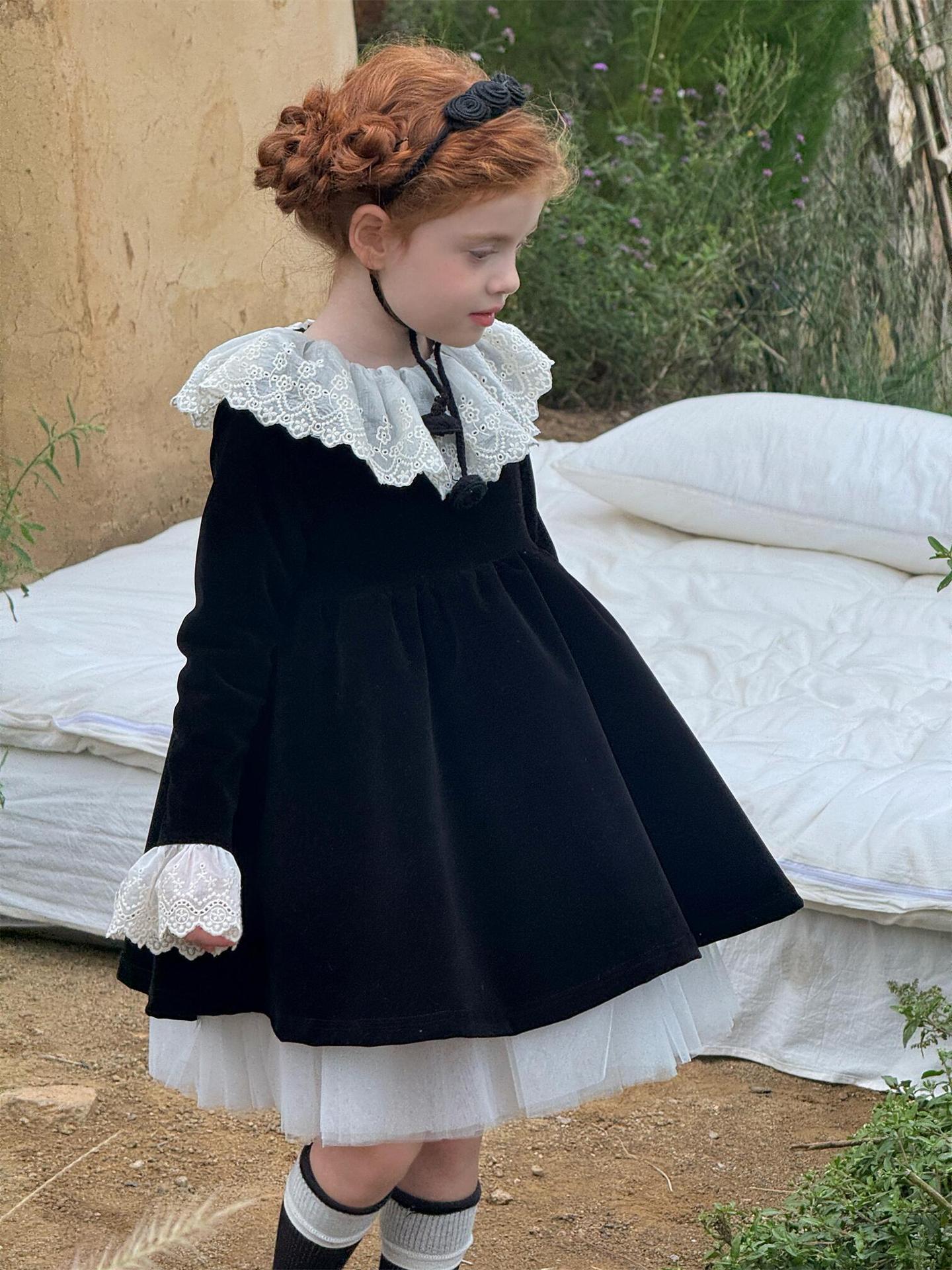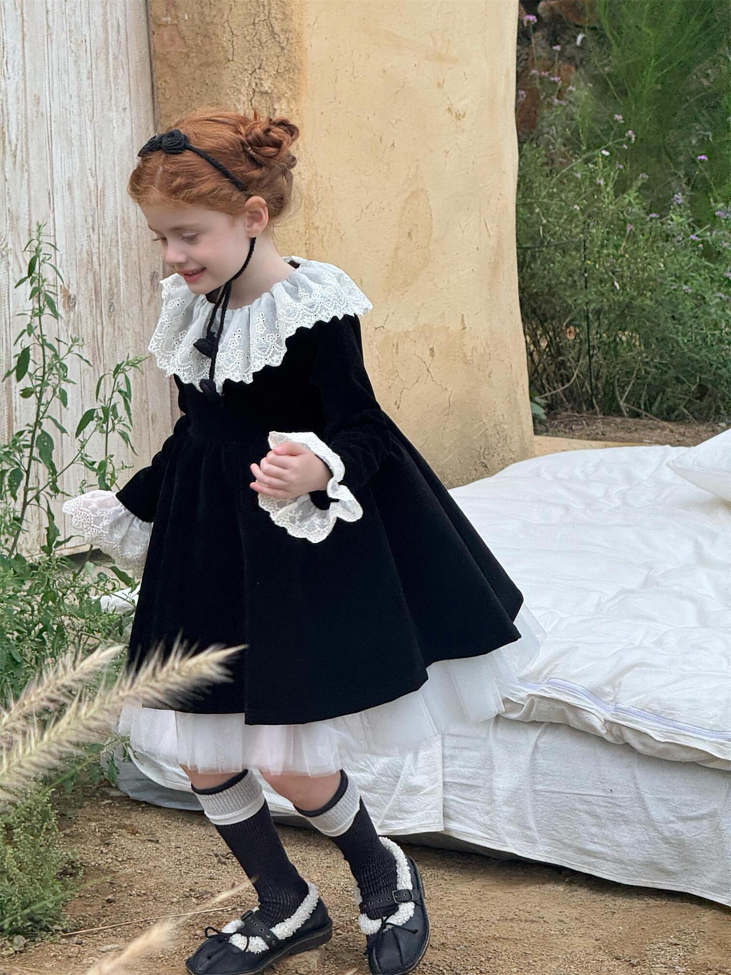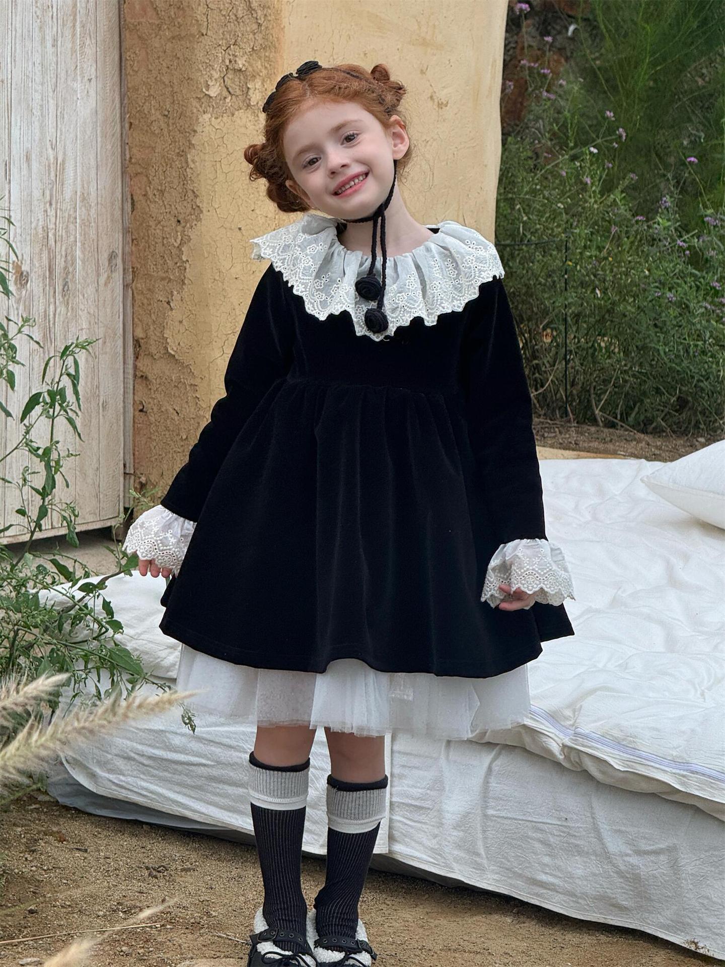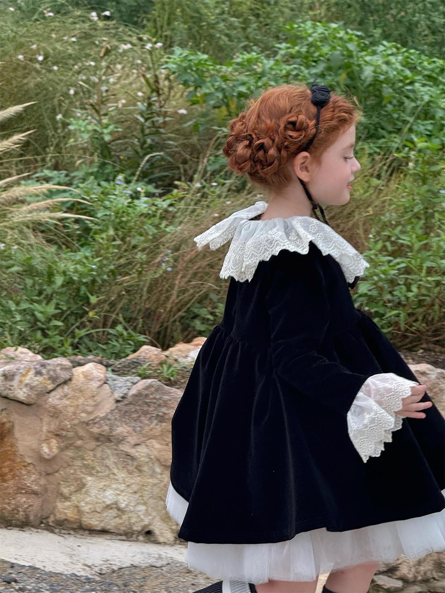 上品な光沢を持つベロア素材で仕立てた長袖ワンピースは、顔周りを飾る繊細なレースフリルカラーがエレガントな印象を与えます。お祝いの席やパーティ、新年の集まりにぴったりのドレスで、一枚着るだけで華やかなスタイルが完成します。素材の高級感とデザインの愛らしさを兼ね備えた、特別な日のための子ども服です。
