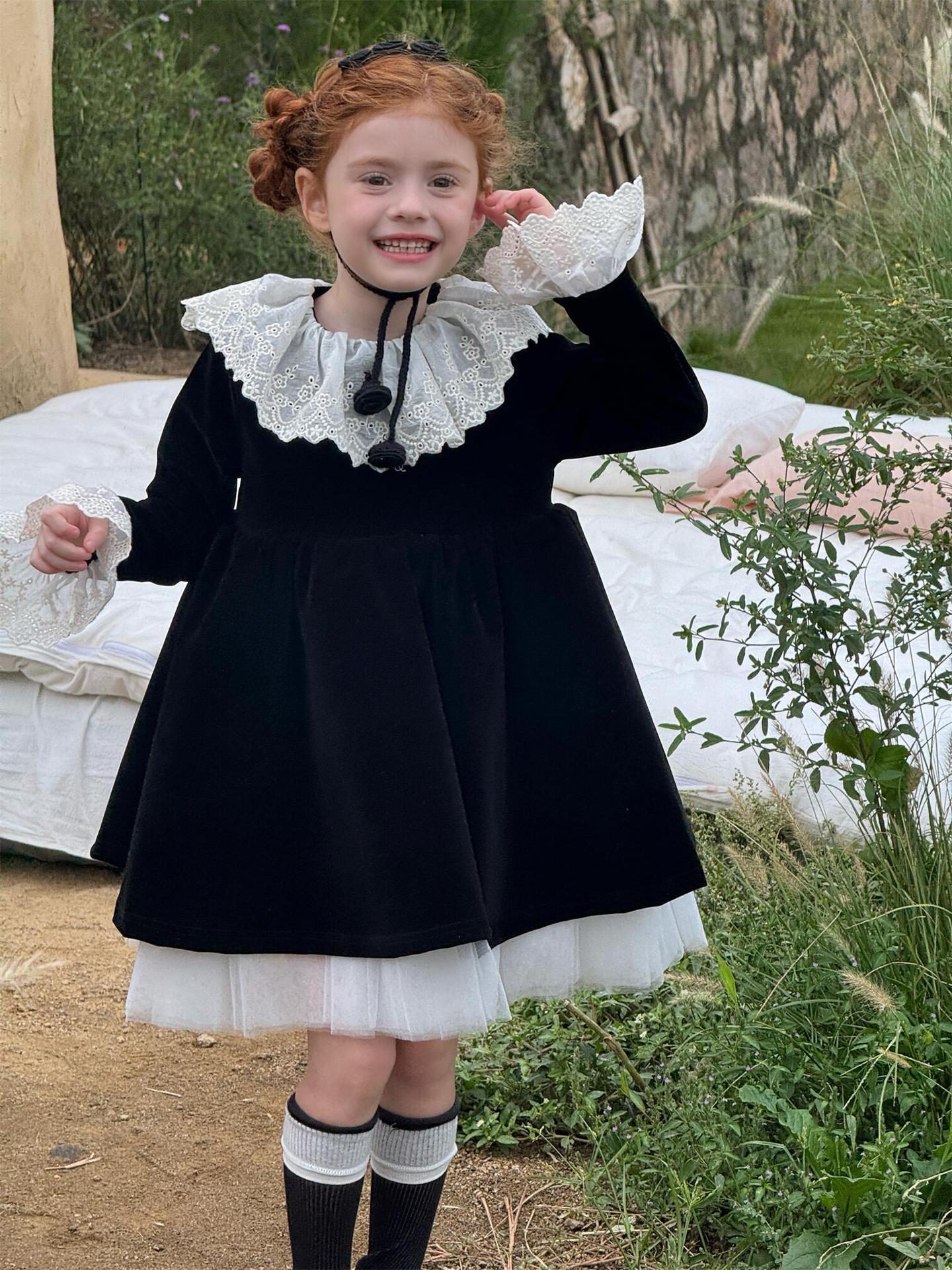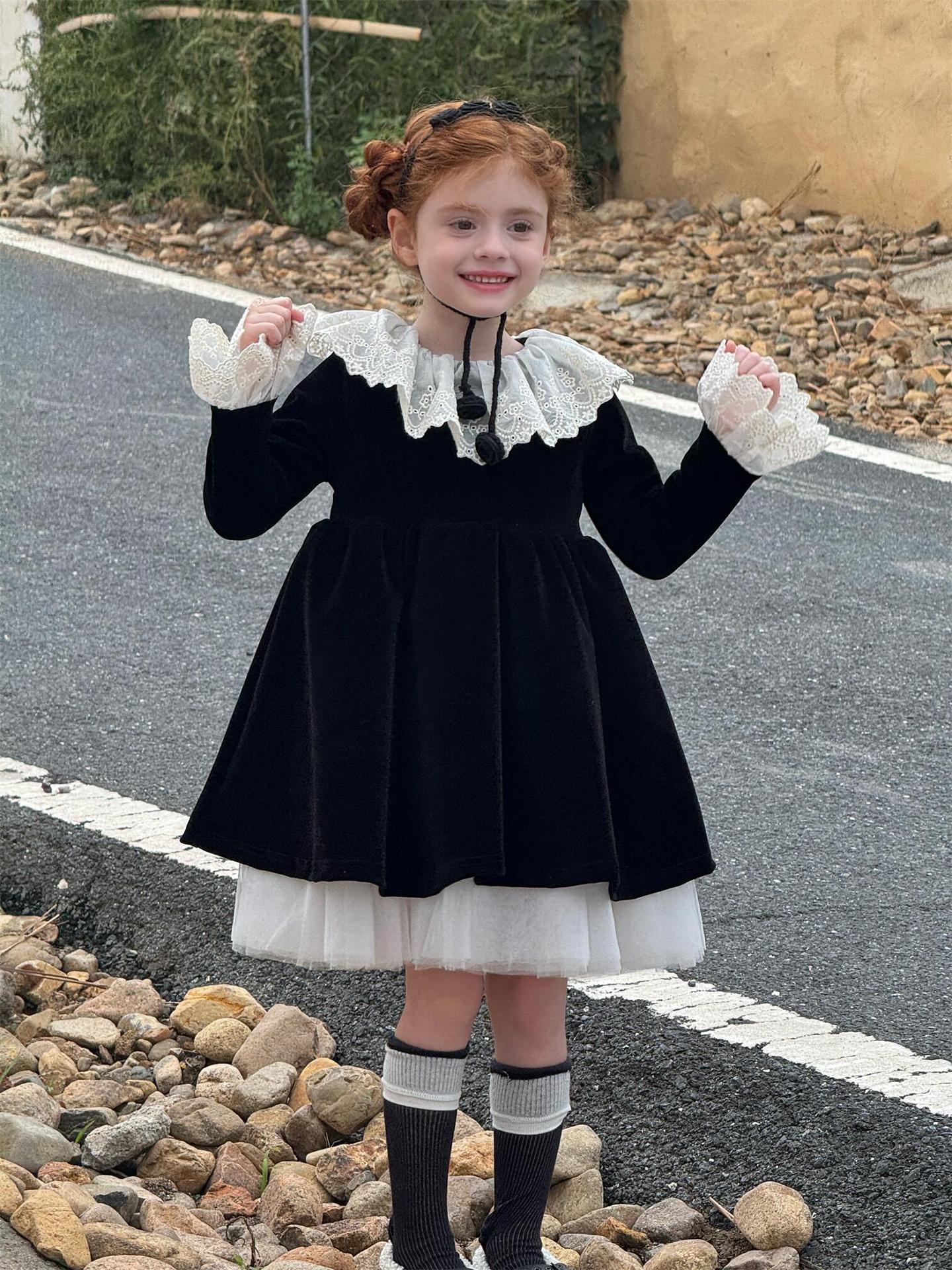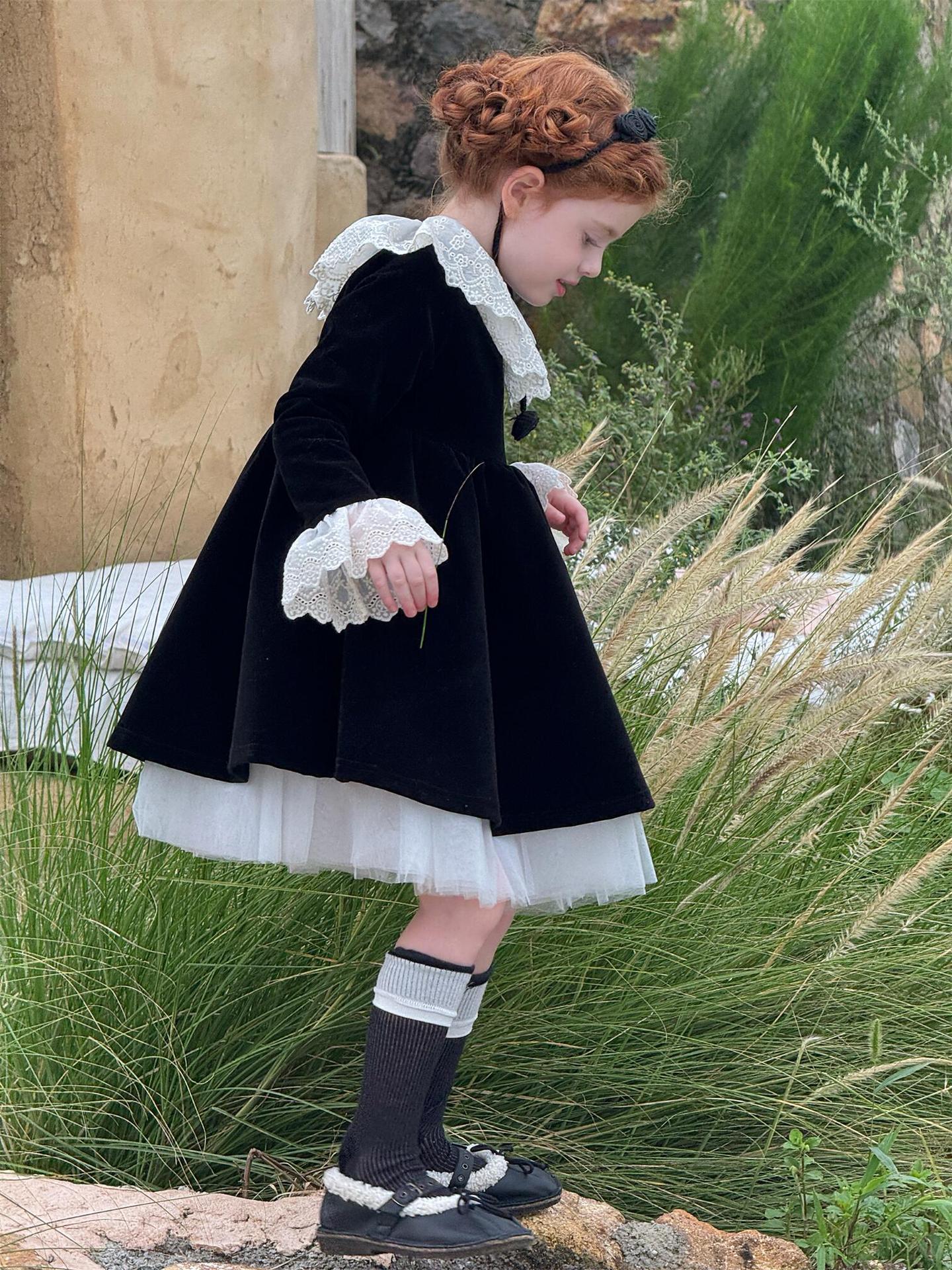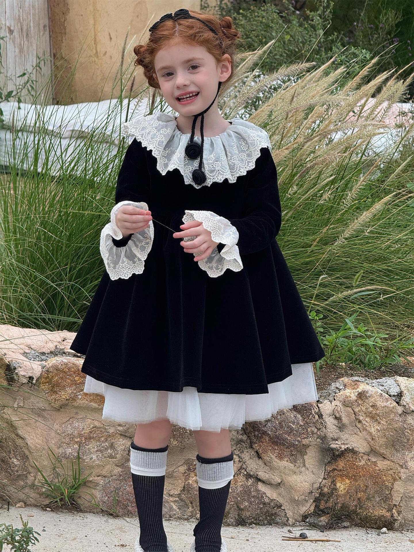 上品な光沢を持つベロア素材で仕立てた長袖ワンピースは、顔周りを飾る繊細なレースフリルカラーがエレガントな印象を与えます。お祝いの席やパーティ、新年の集まりにぴったりのドレスで、一枚着るだけで華やかなスタイルが完成します。素材の高級感とデザインの愛らしさを兼ね備えた、特別な日のための子ども服です。