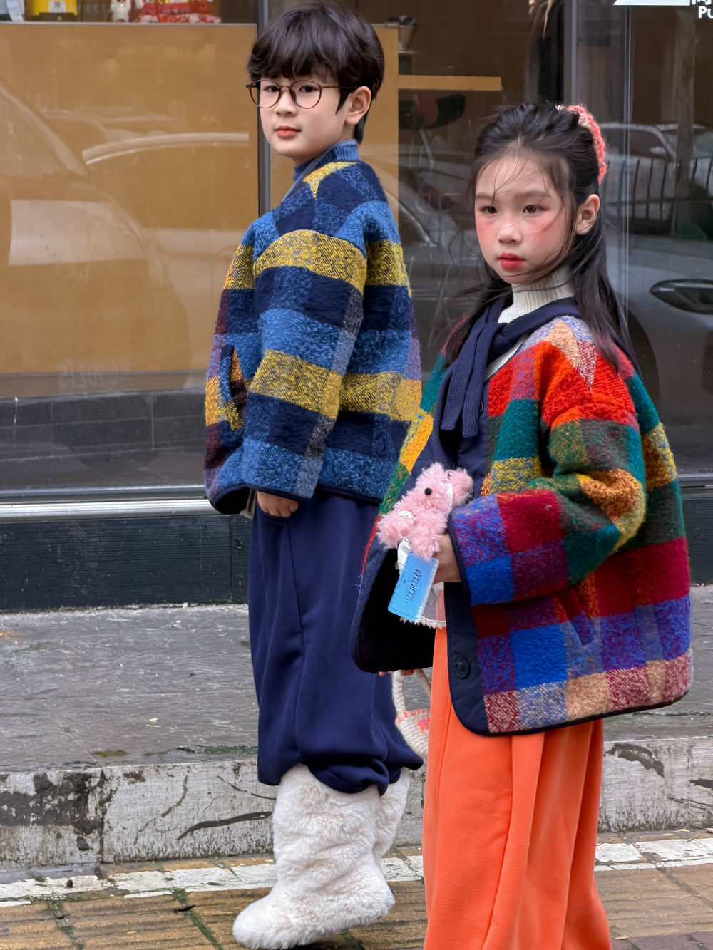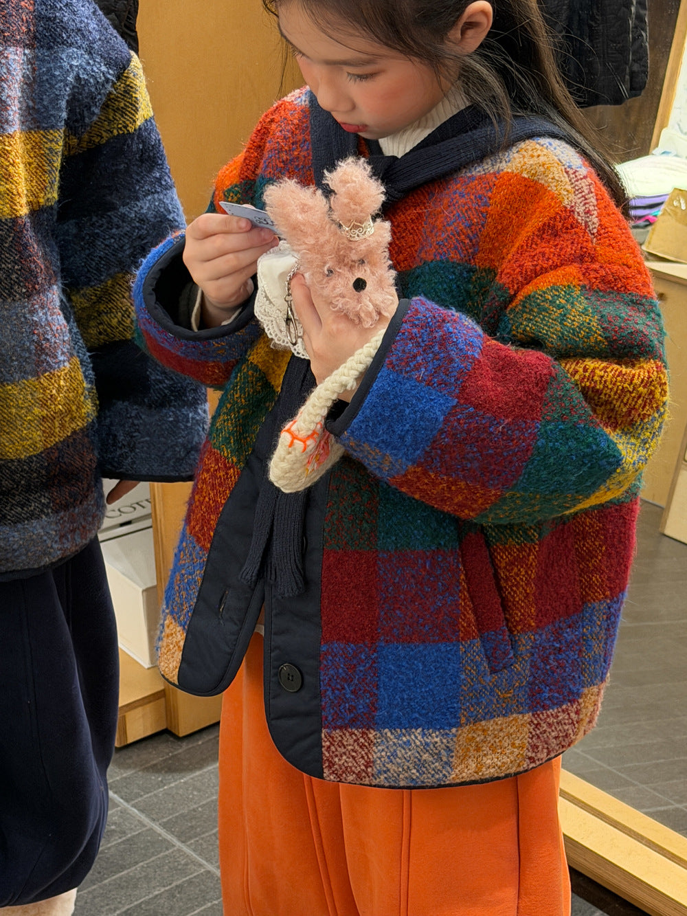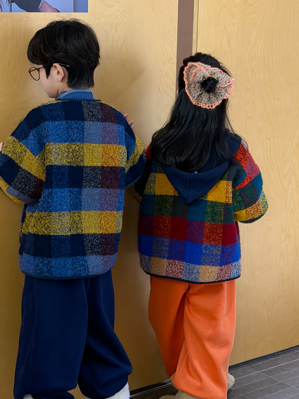 鮮やかなマドラスチェックが目を引くノーカラージャケットは、多色のブロックチェックを巧みに組み合わせた、遊び心あふれるデザインの一着です。すっきりとした首元のラインがモダンな印象を与え、タートルネックやマフラーとも相性良くコーディネートを楽しめます。厚みのあるしっかりとした生地感が、寒い季節でもお子さまを優しく包み込み、ダッフルコートのような温もりと軽やかな着心地を両立させました。都会的で洗練された配色の子供服は、シンプルなスタイルに羽織るだけでパッと華やかな表情を作り出し、お子さまの個性を素敵に引き立てる子ども服です。