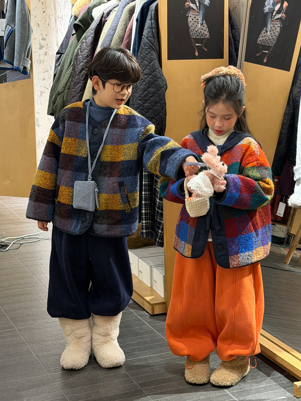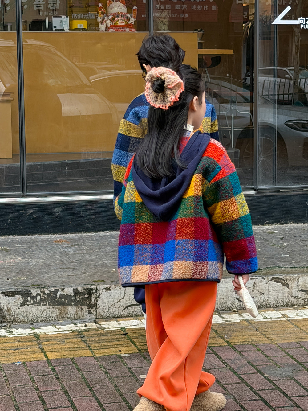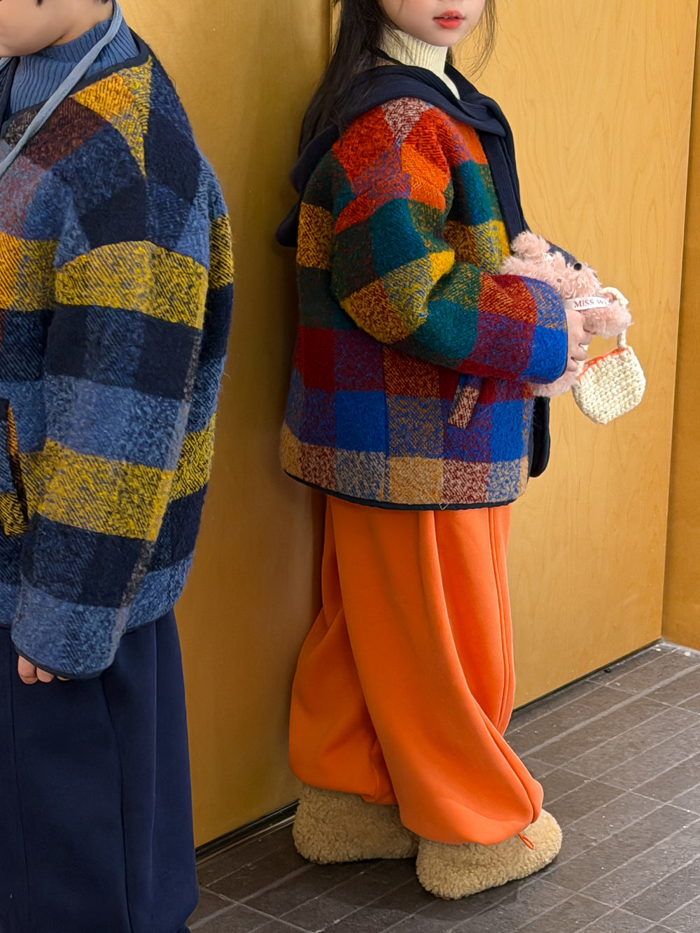 鮮やかなマドラスチェックが目を引くノーカラージャケットは、多色のブロックチェックを巧みに組み合わせた、遊び心あふれるデザインの一着です。すっきりとした首元のラインがモダンな印象を与え、タートルネックやマフラーとも相性良くコーディネートを楽しめます。厚みのあるしっかりとした生地感が、寒い季節でもお子さまを優しく包み込み、ダッフルコートのような温もりと軽やかな着心地を両立させました。都会的で洗練された配色の子供服は、シンプルなスタイルに羽織るだけでパッと華やかな表情を作り出し、お子さまの個性を素敵に引き立てる子ども服です。
